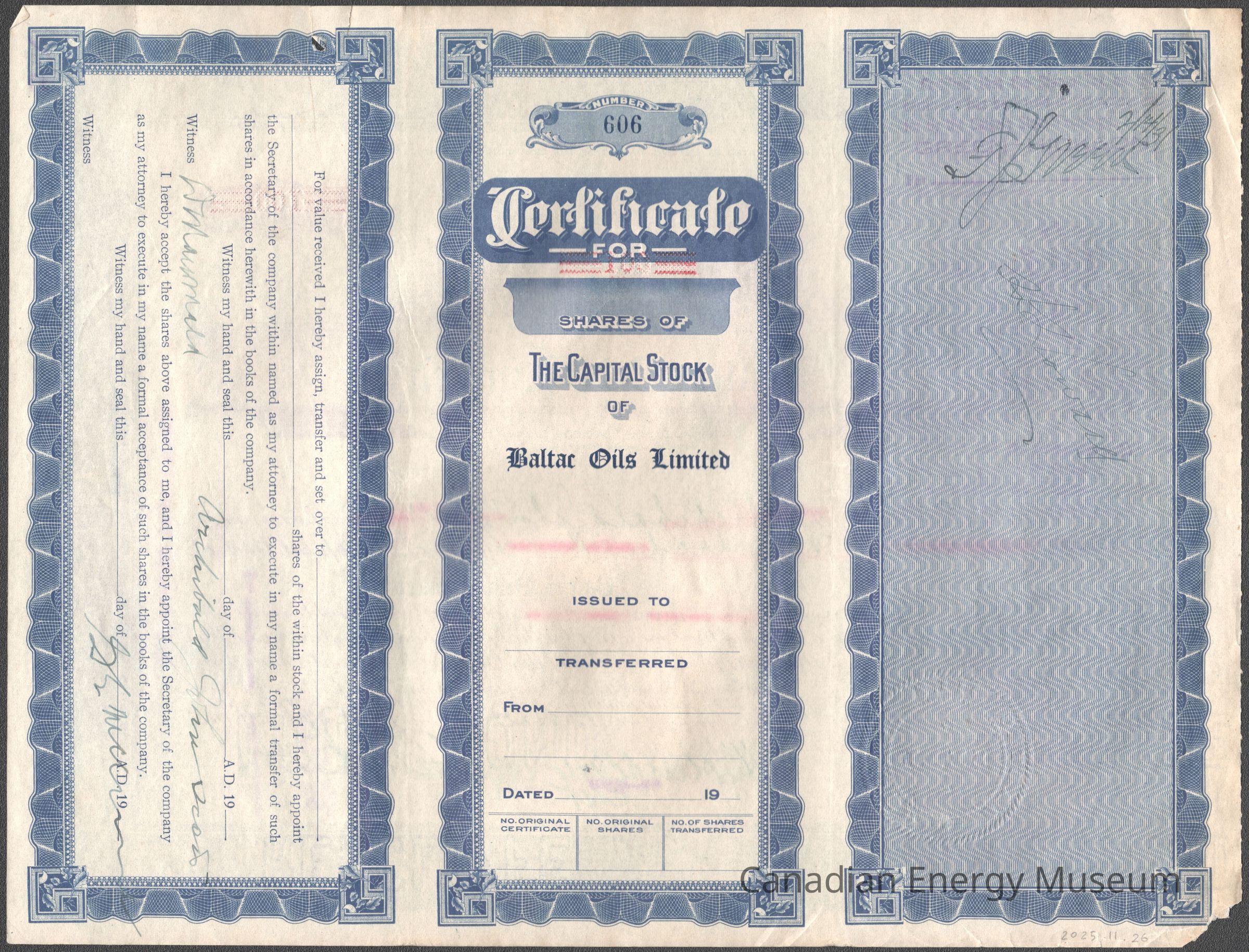 Share Certificate, Certificate, 1920s, Blue, Baltac Oils Limited, OilDescription