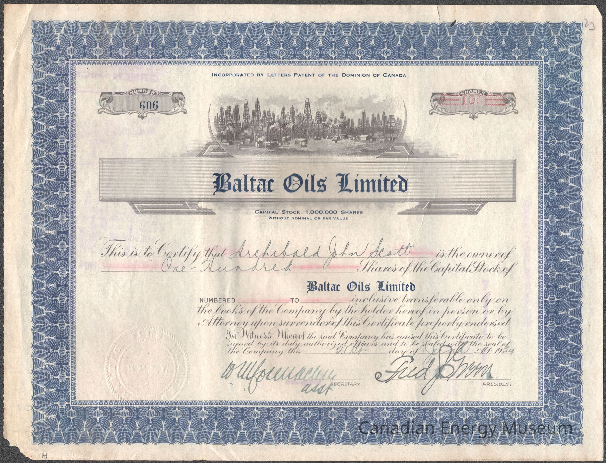 [Share Certificate] Baltac Oils Limited, 100 Shares, 21 June, 1929Entry/Object ID