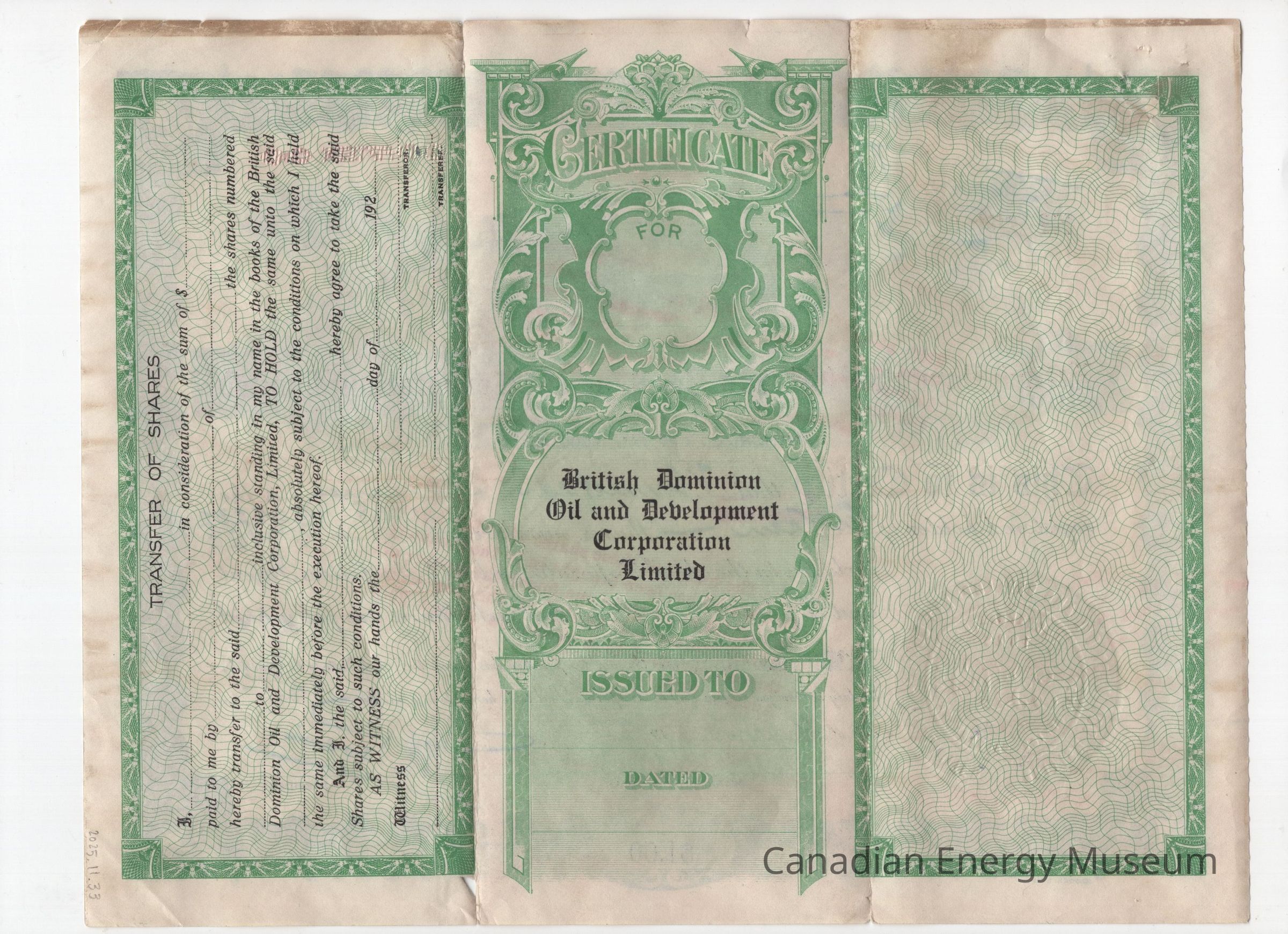 Share Certificate, Certificate, 1920s, Gold, Mining, Black, British Dominion Oil and Development Corporation Limited, Oil, GreenDescription
