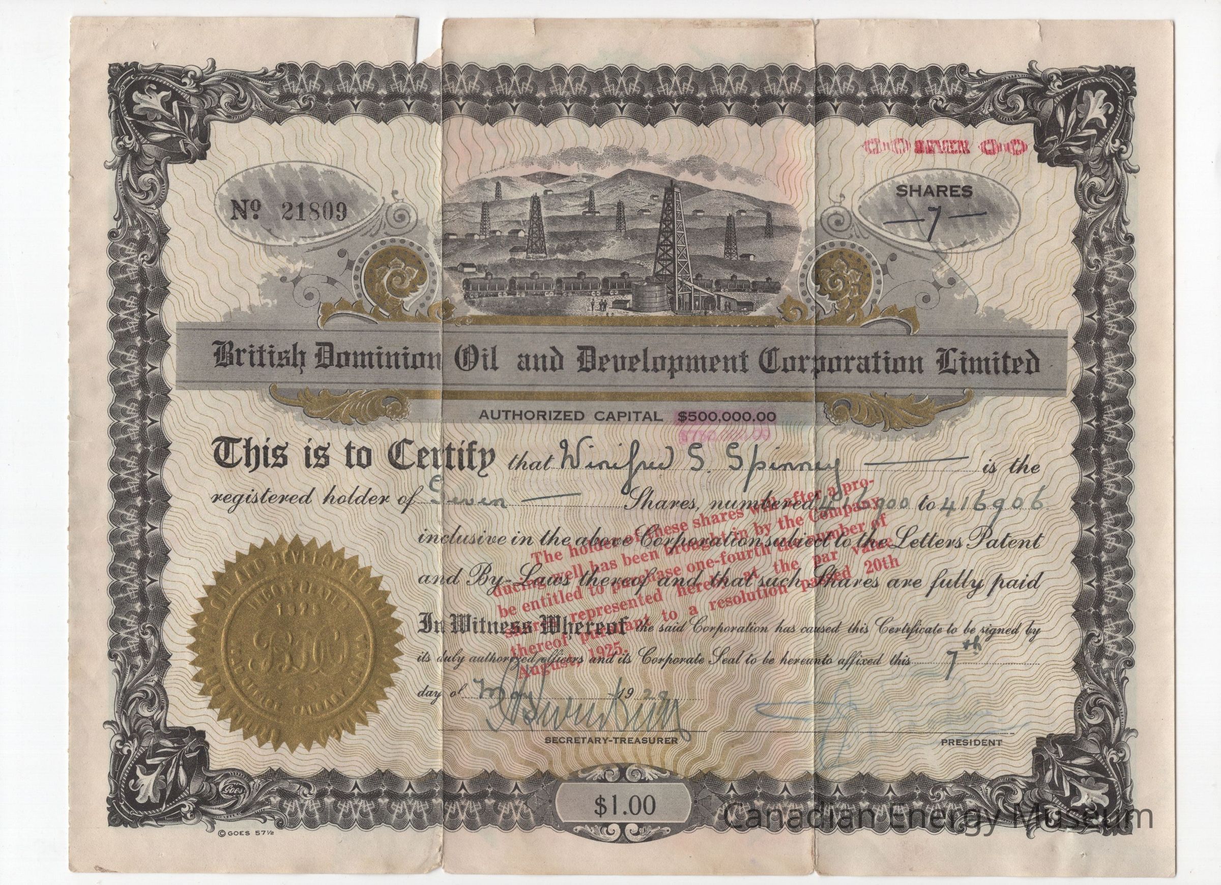 A share certificate made out to Winifred S. Spinny for seven shares. The certificate is decorated with a black border. The top of the certificate displays a grey illustration of multiple oil rigs along a hilled background, with a grey and gold banner underneath with the company name. The bottom left corner shows a gold embossed starburst. The middle of the certificate features a red ink stamp.