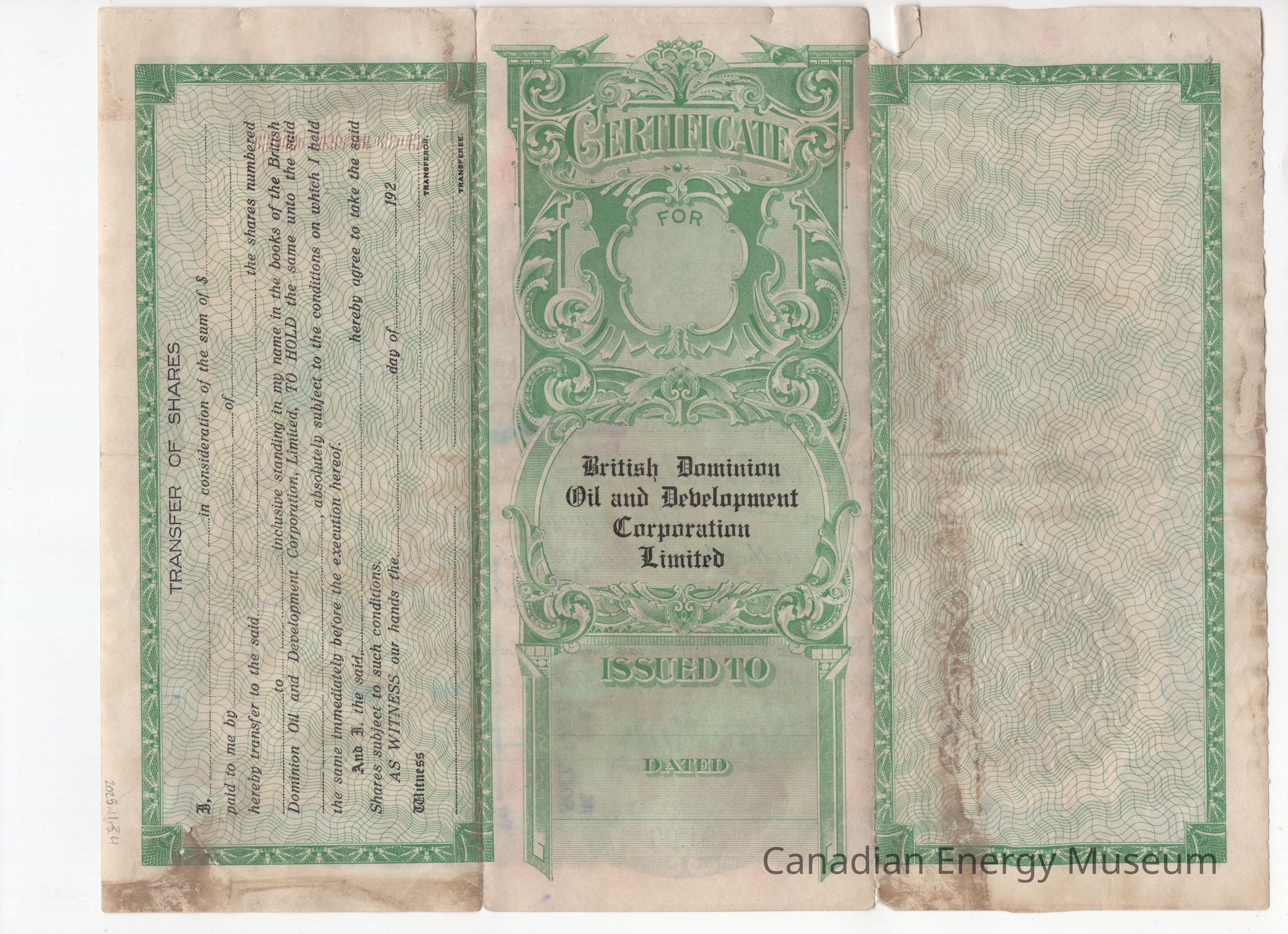 Share Certificate, Certificate, 1920s, Gold, Mining, Black, British Dominion Oil and Development Corporation Limited, Oil, GreenDescription