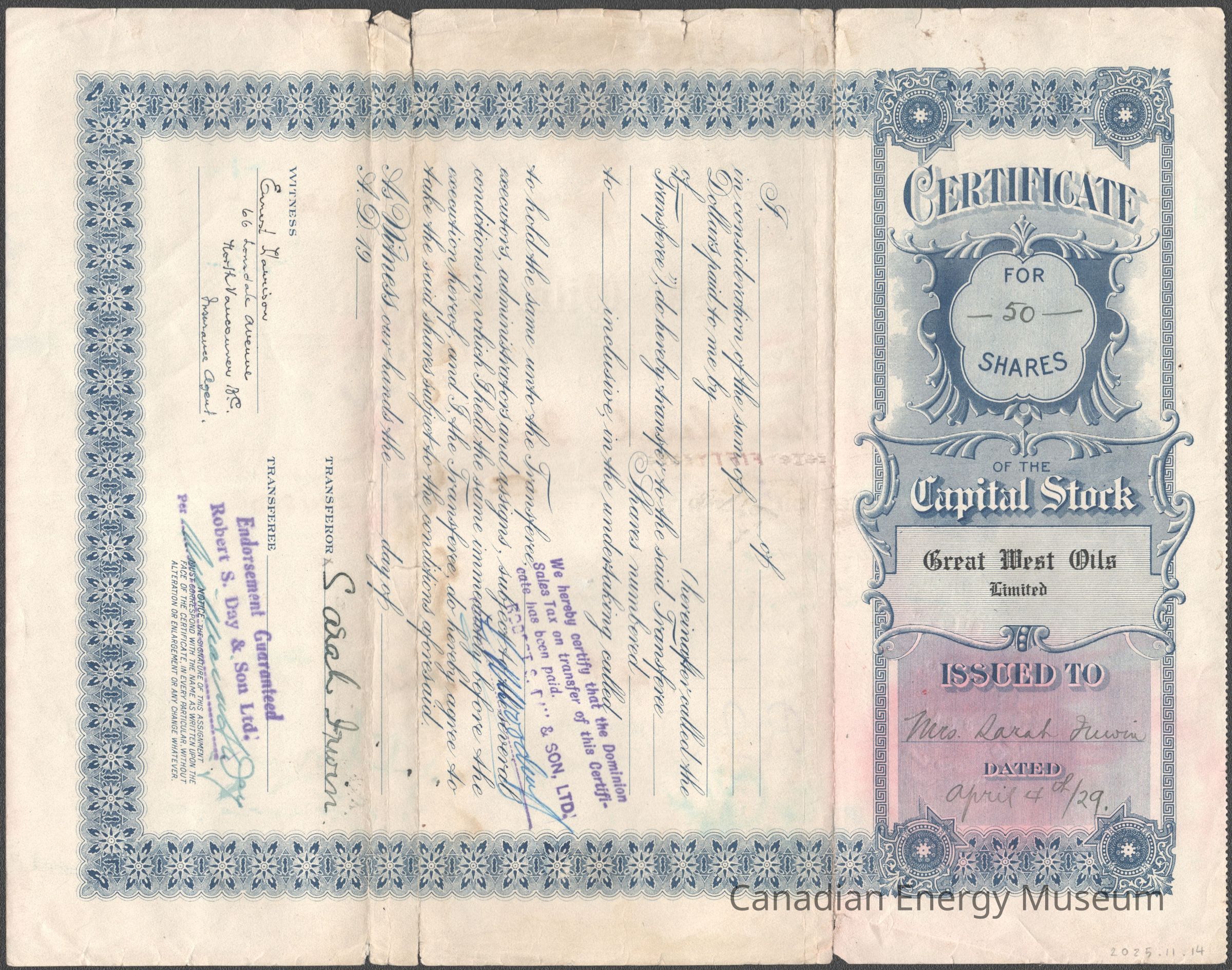[Share Certificate] Great West Oils Limited, 50 Shares, 4 April, 1929Entry/Object ID