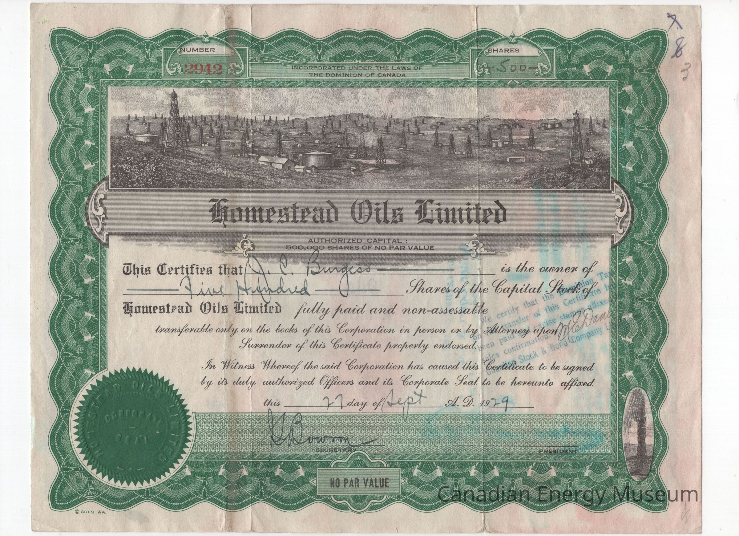 [Share Certificate] Homestead Oils Limited, 500 Shares, 27 September, 1929Entry/Object ID