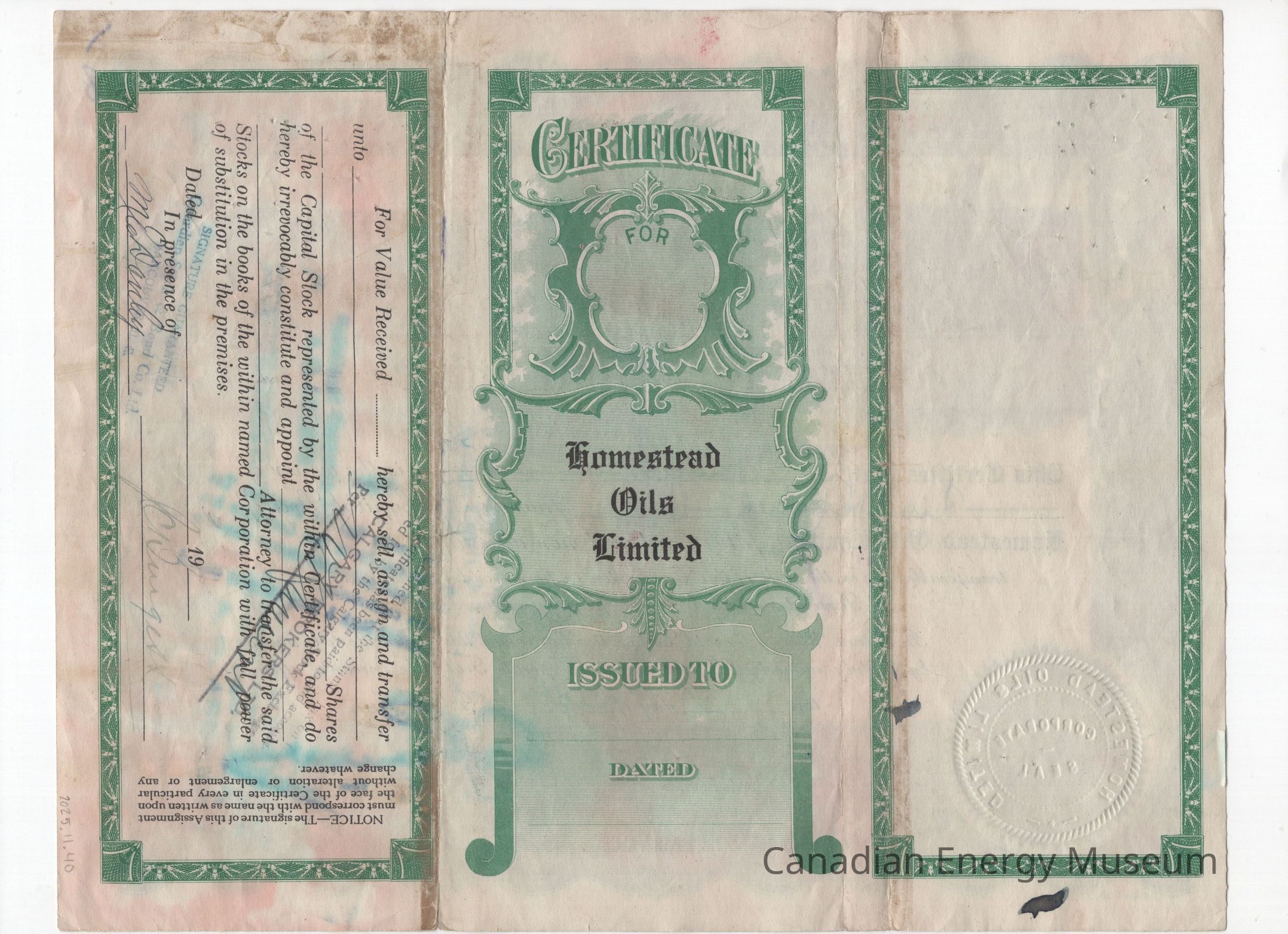 Share Certificate, Certificate, 1920s, Green, Homestead Oils LimitedDescription