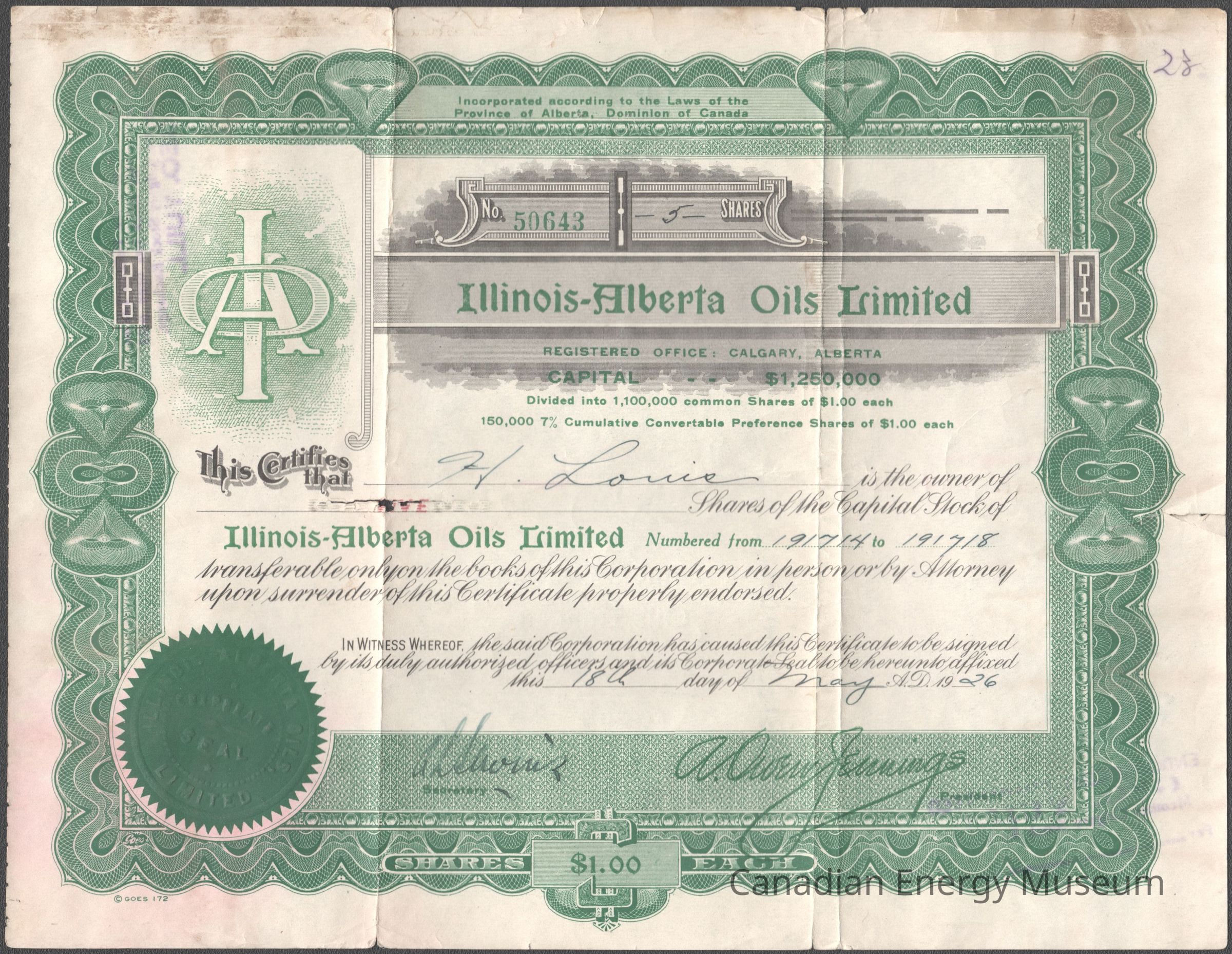 [Share Certificate] Illinois-Alberta Oils Limited, 5 Shares, 18 May, 1926Entry/Object ID