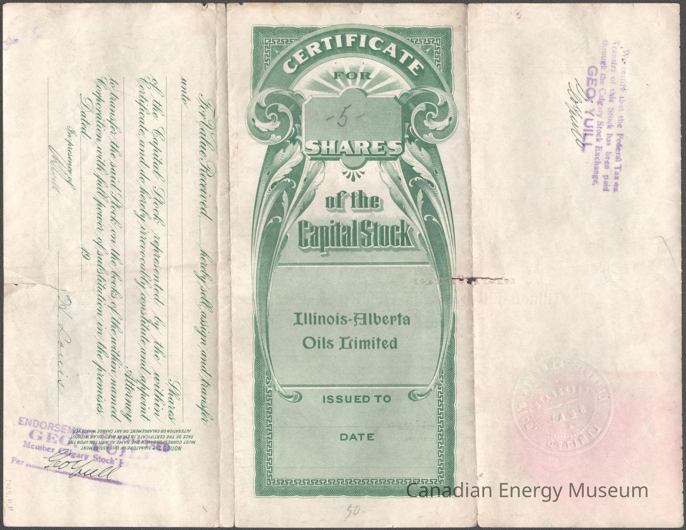 Share Certificate, Certificate, Green, Illinois-Alberta Oils Limited, Calgary, Alberta, 1920sDescription