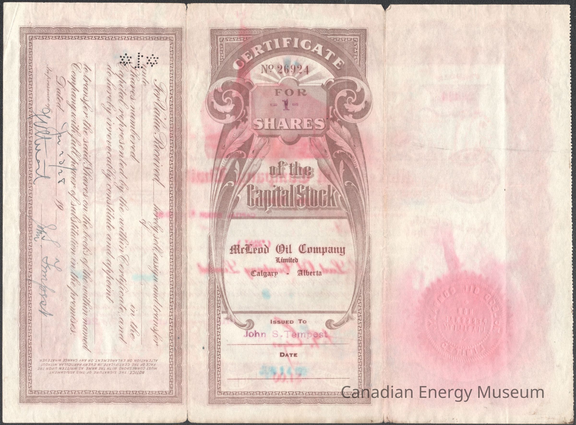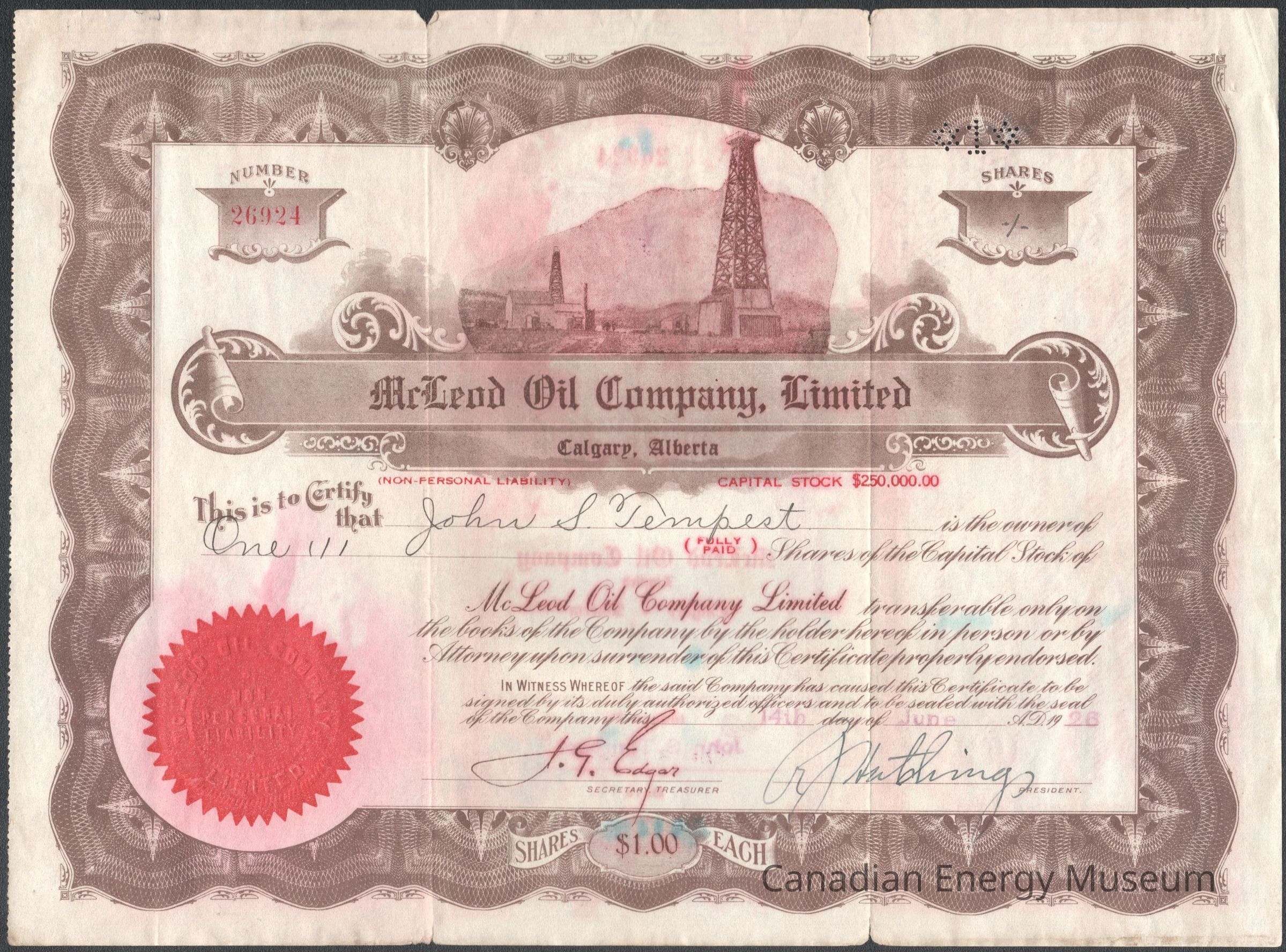 [Share Certificate] McLeod Oil Company Limited, 1 Share, 15 June, 1926Entry/Object ID