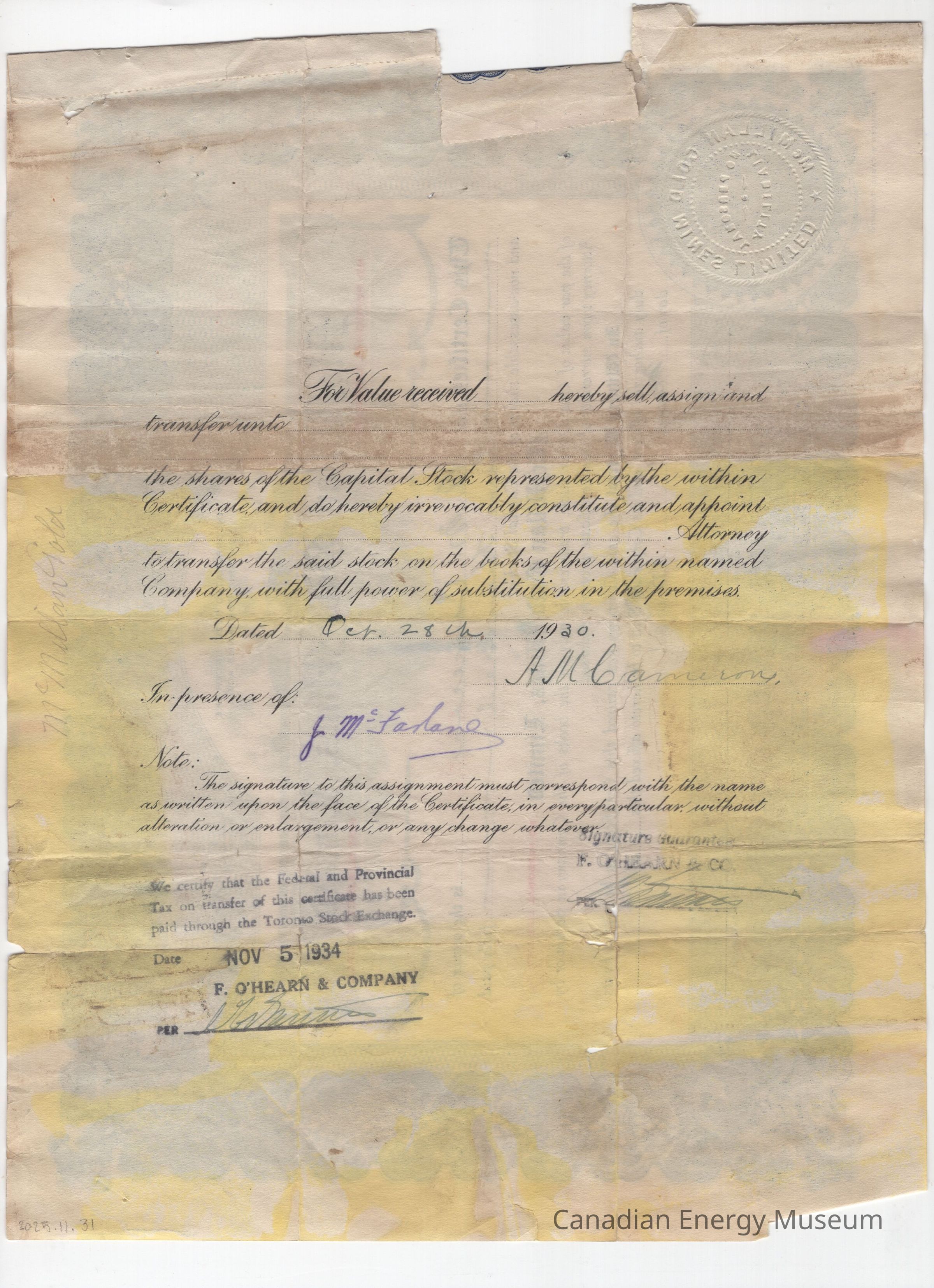 [Share Certificate] McMillan Gold Mines Limited, 200 Shares, 28 May, 1929Entry/Object ID