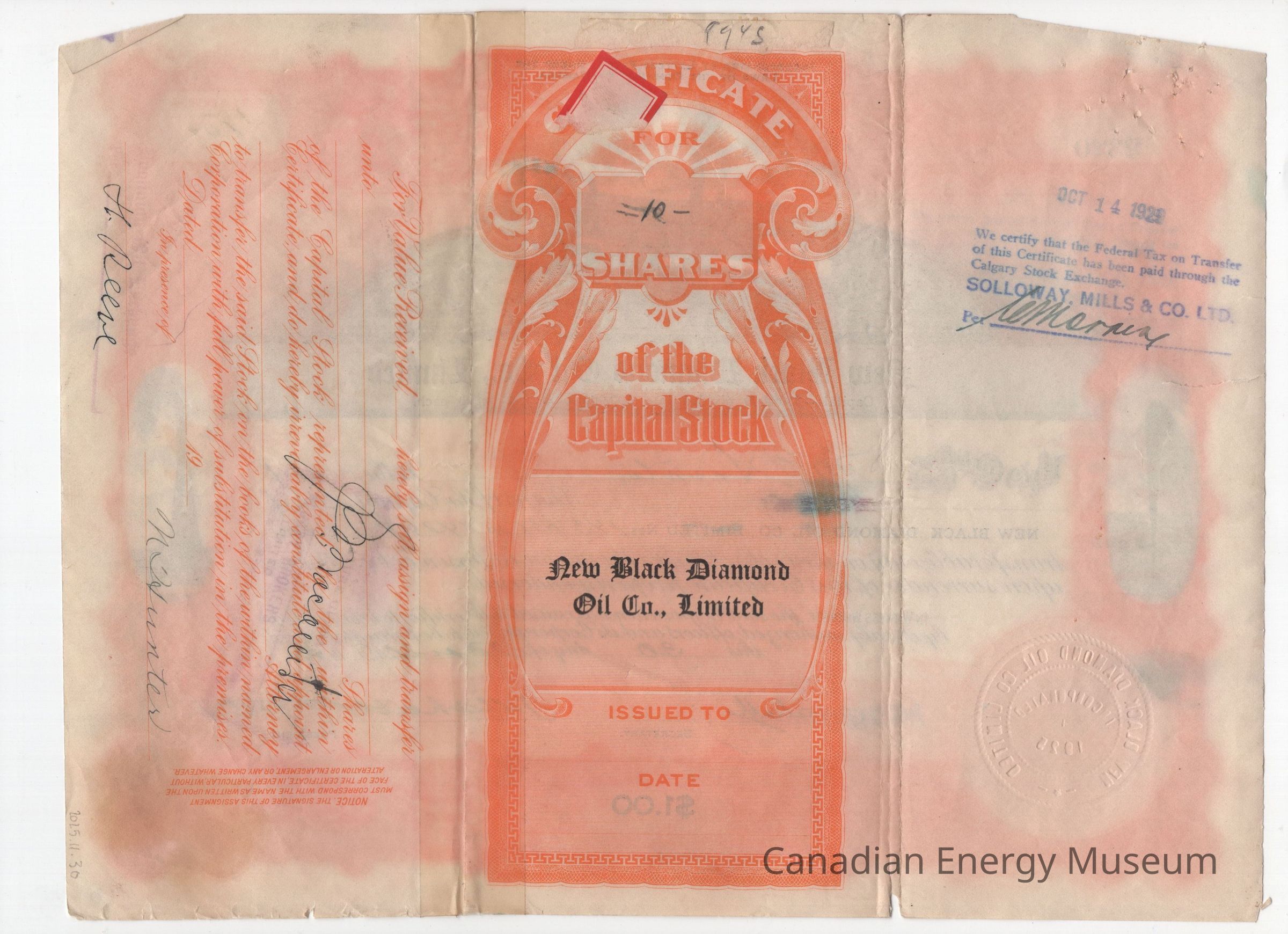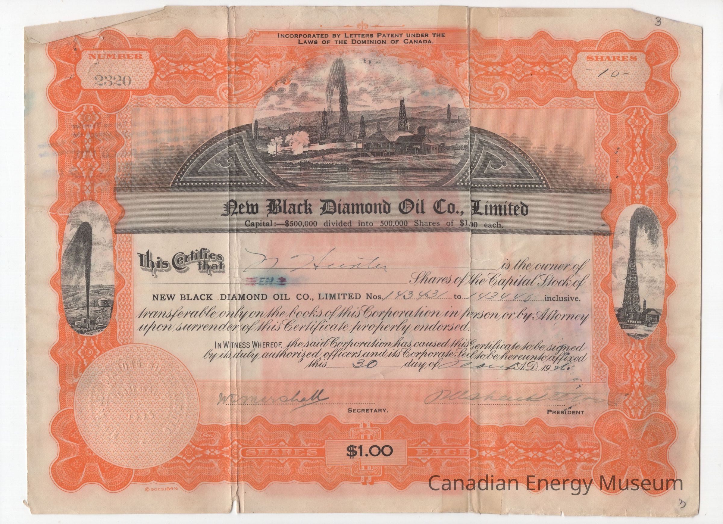 Share Certificate, Certificate, 1920s, Oil, Orange, New Black Diamond Oil Co. LimitedDescription