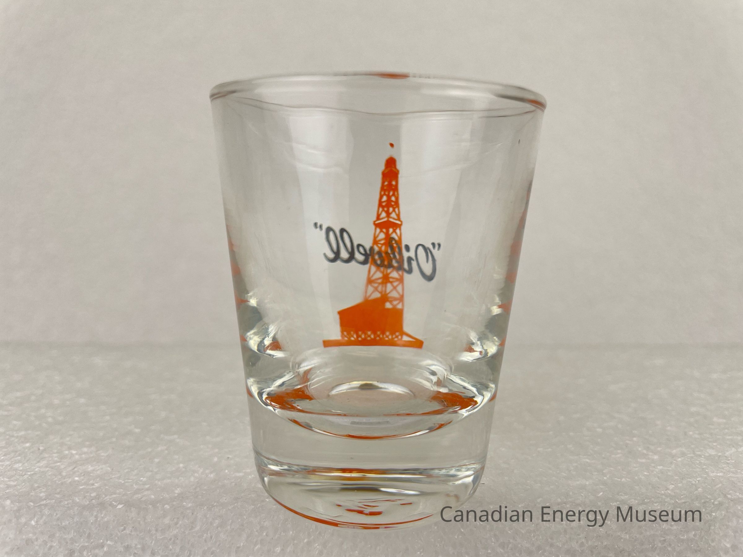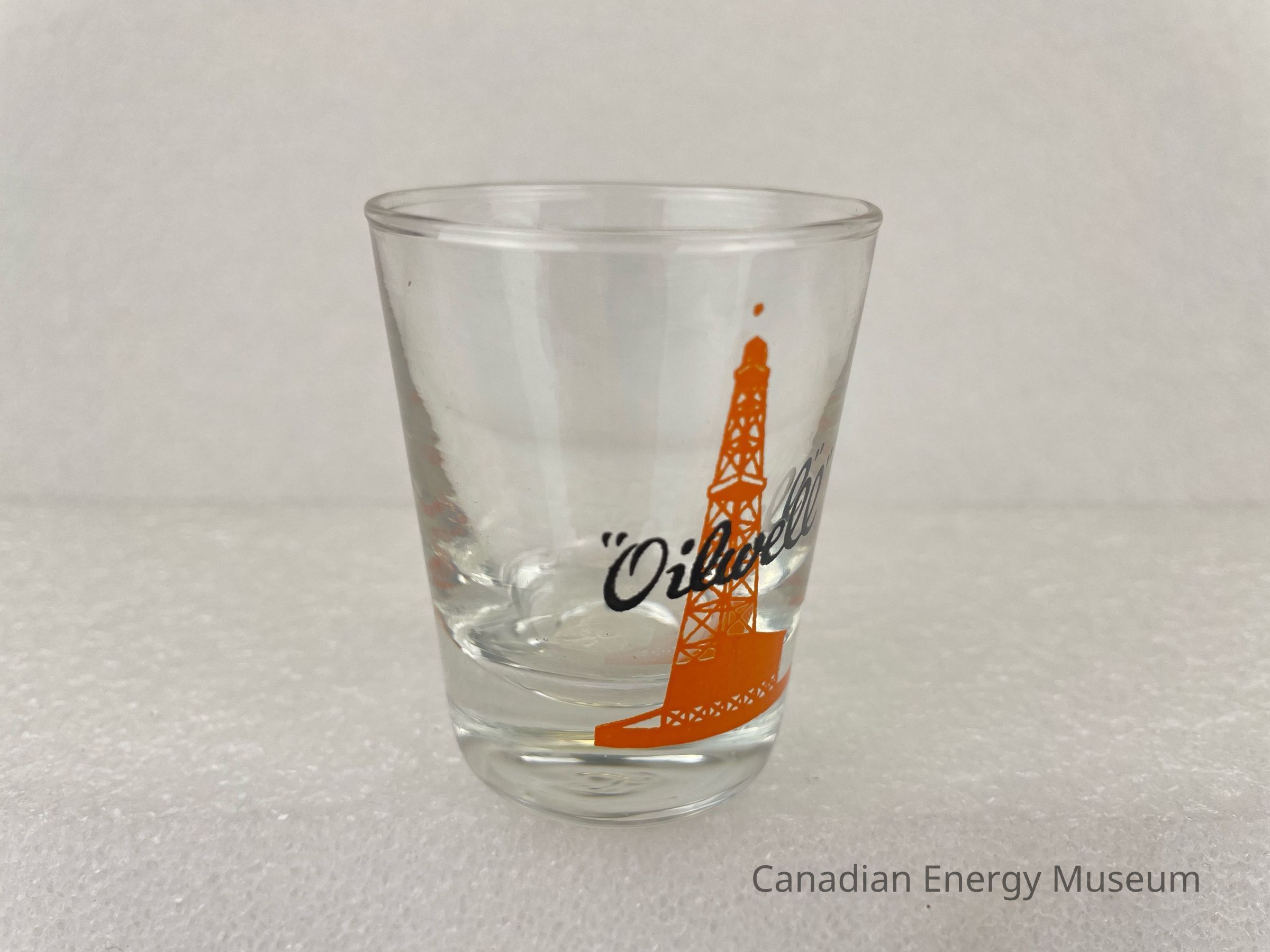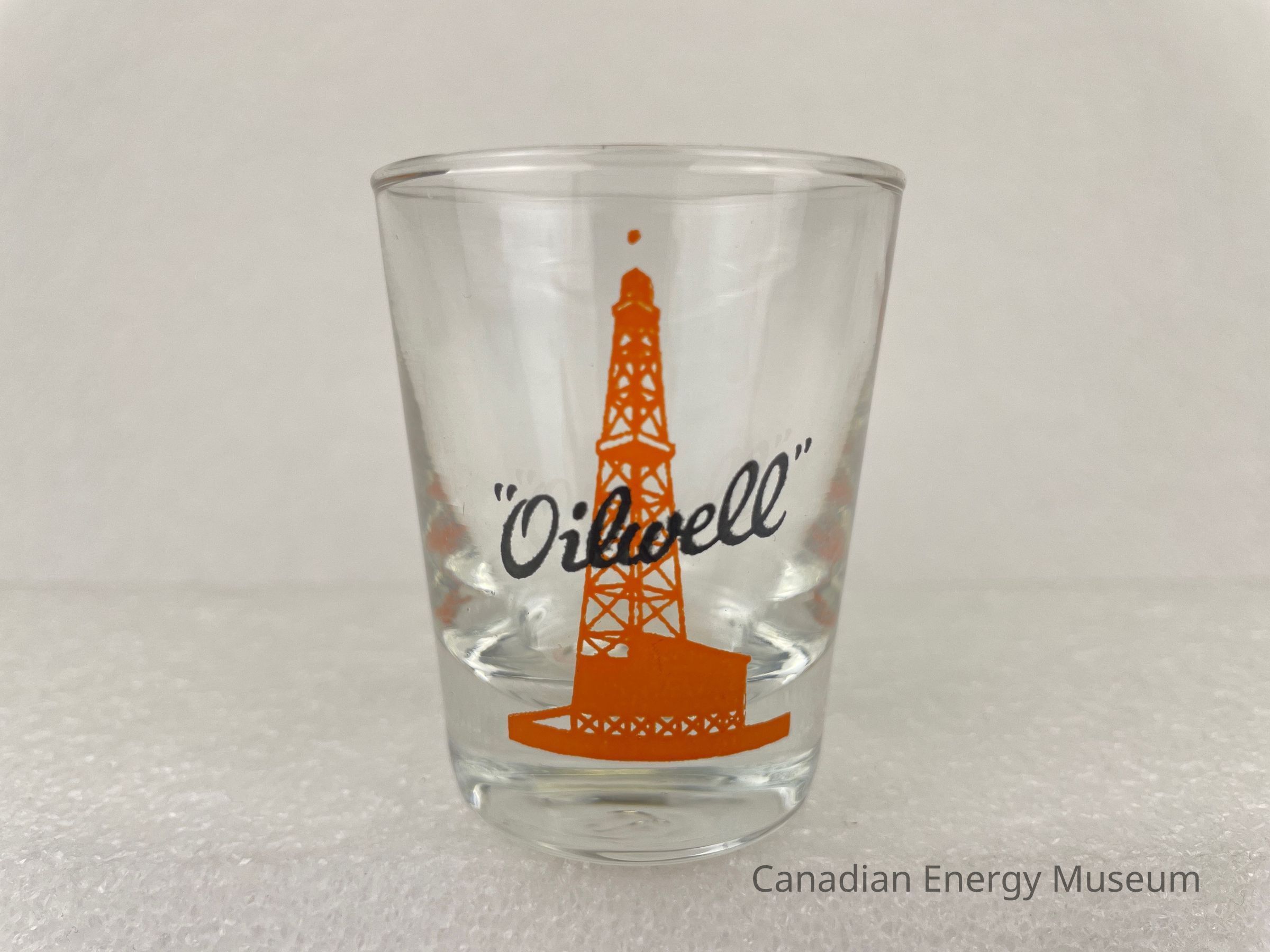 This glass is a clear shot glass with a printed design on one side. The glass is angled outwards at the top, with a heavy base. The printed design consists of an orange oil derrick, over which is black script text ""Oilwell"". The glasses likely date from the mid-1950s to the 1960s, based on the maker's mark ("L" within a circle, which began use in 1955) and dating of similar glasses.Collection