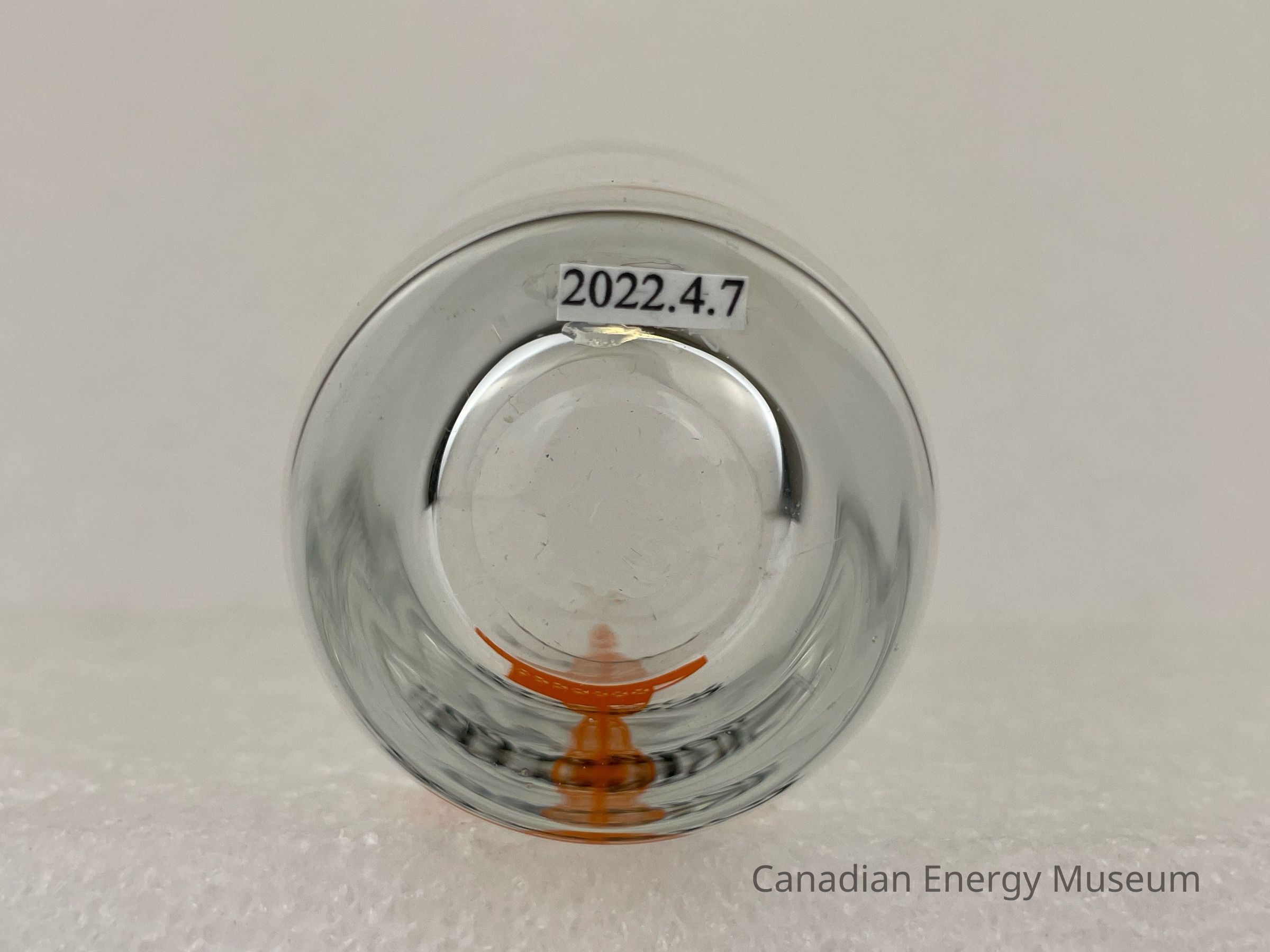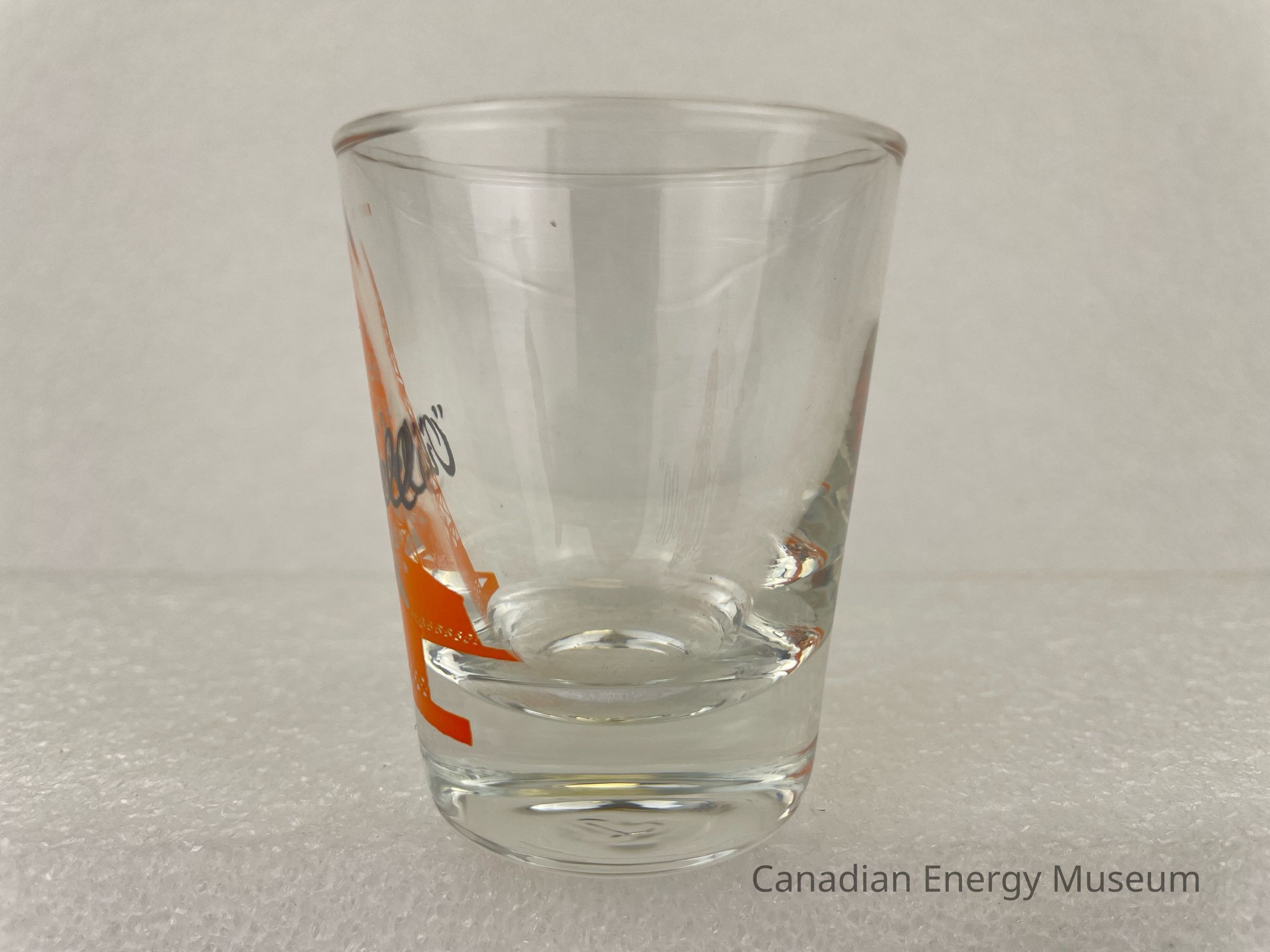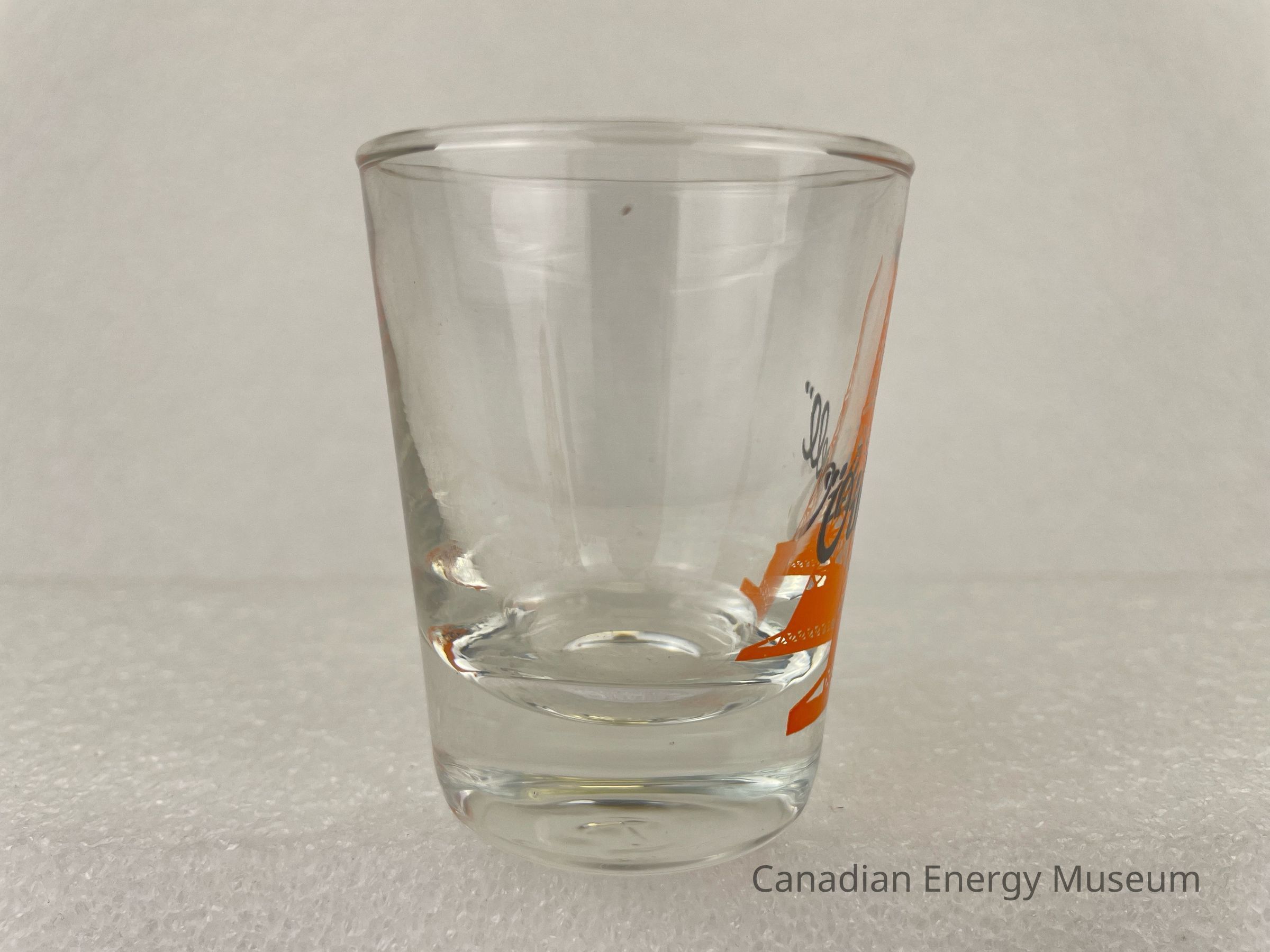 This glass is a clear shot glass with a printed design on one side. The glass is angled outwards at the top, with a heavy base. The printed design consists of an orange oil derrick, over which is black script text ""Oilwell"". The glasses likely date from the mid-1950s to the 1960s, based on the maker's mark ("L" within a circle, which began use in 1955) and dating of similar glasses.Collection