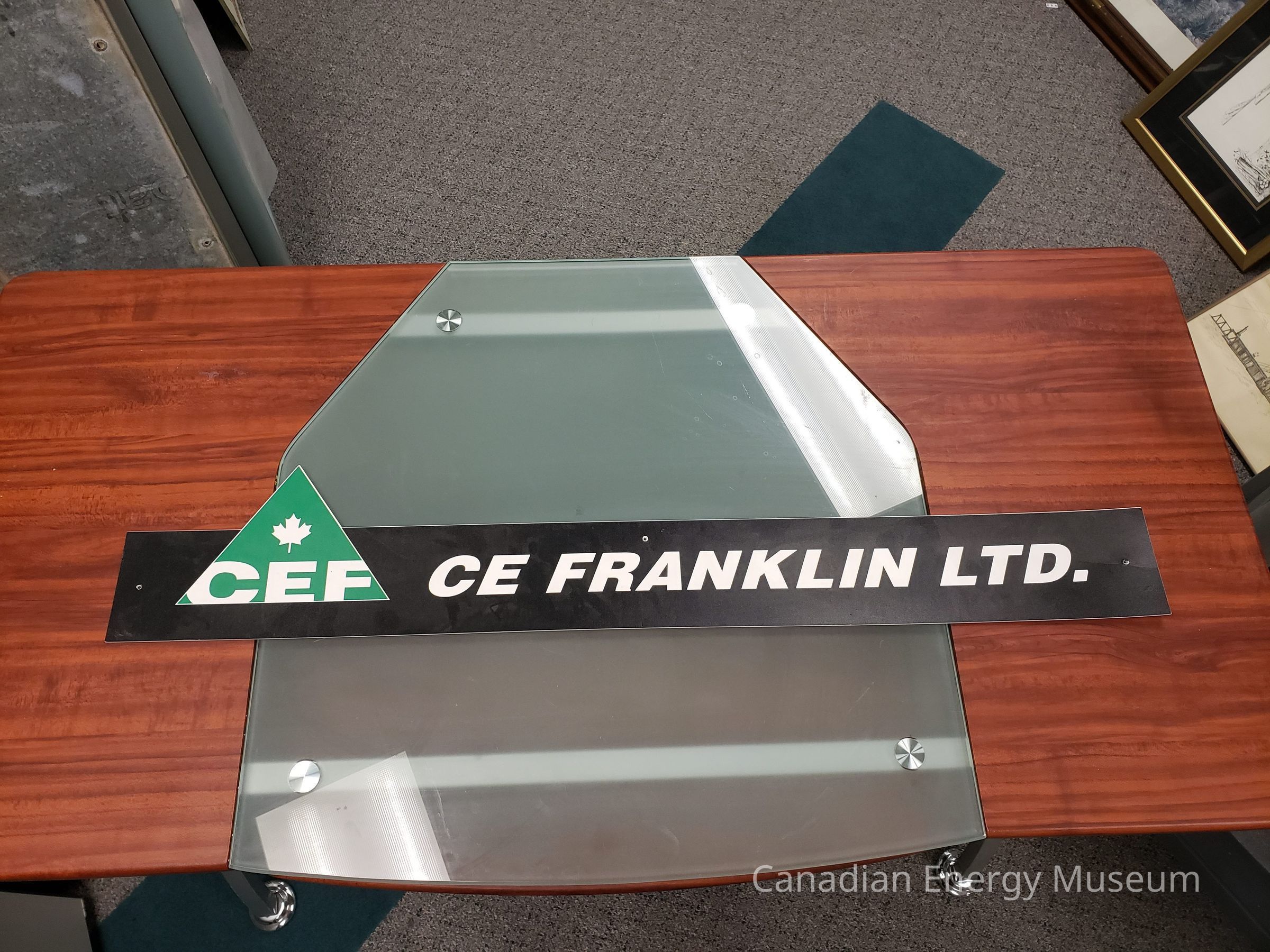 Narrow rectangular (landscape) plastic sign, branded to CE Franklin Ltd. (CEF), with a triangle cutout on the left side. Black with white text and green triangle.Collection