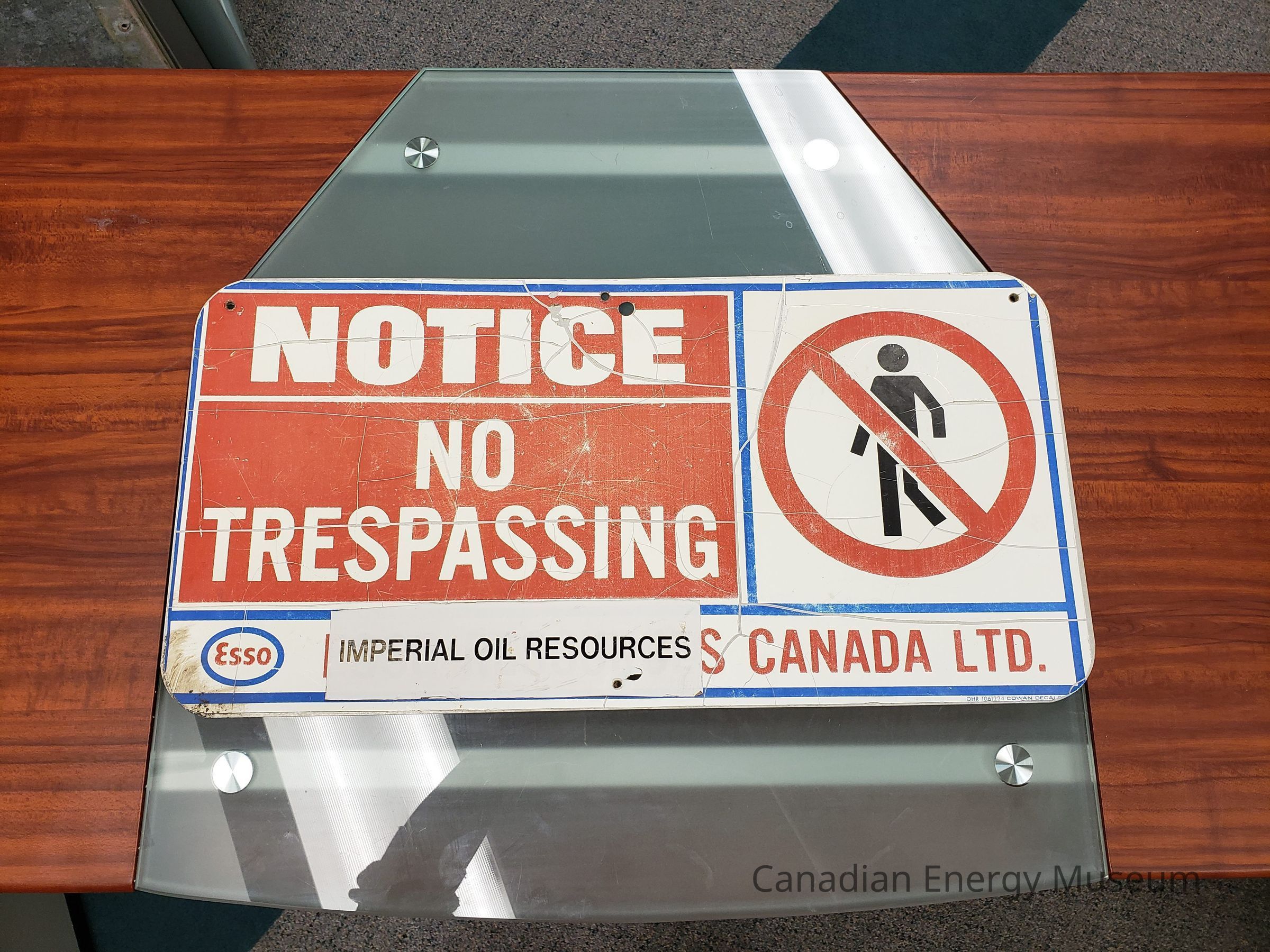 Informational signage branded to ESSO / Imperial Oil Resources Canada Ltd. White with blue borders and red blocking. Reads: "NOTICE; NO TRESPASSING". Rounded corners.Collection