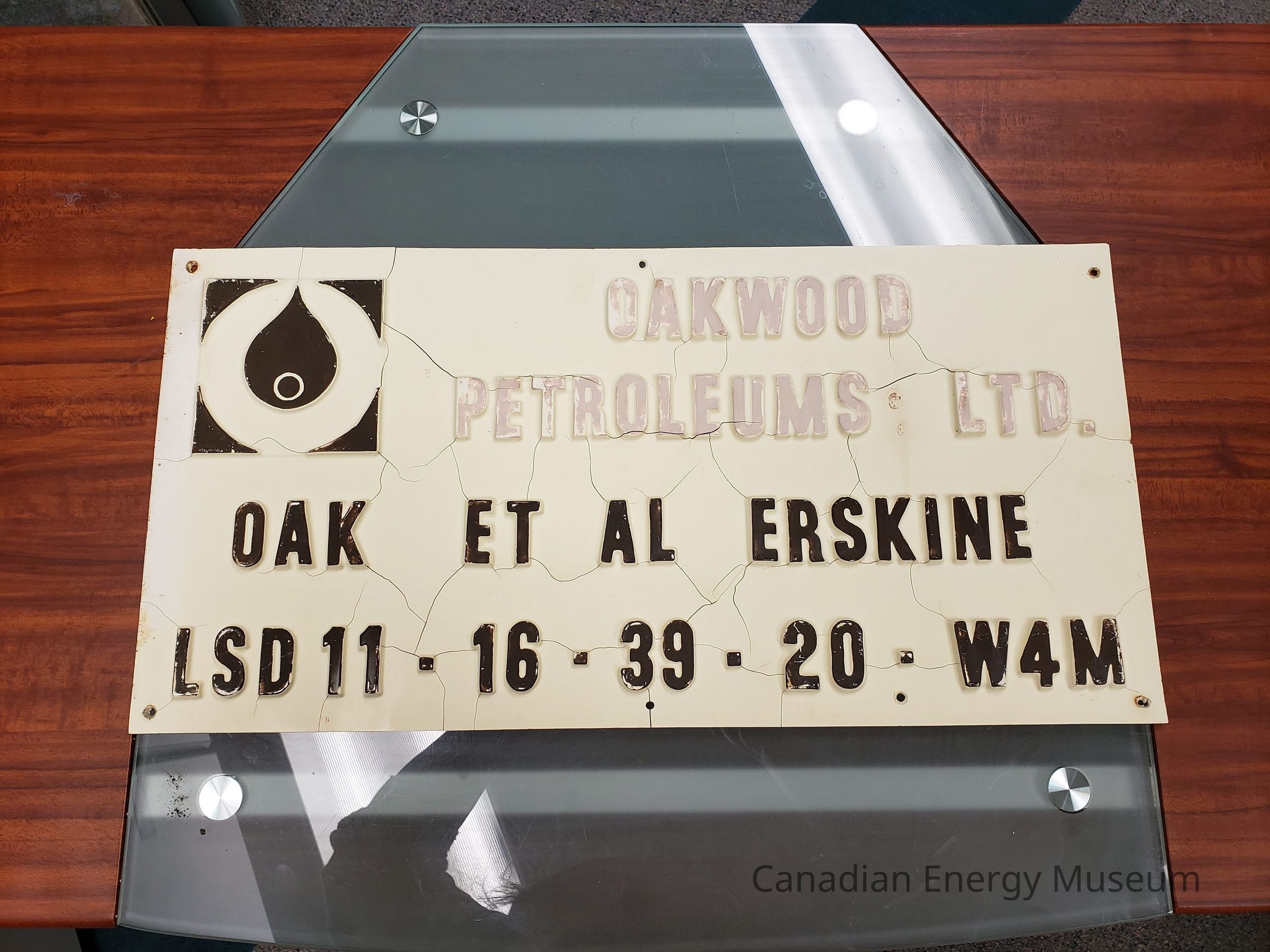 Metal sign branded to Oakwood Petroleums Ltd., reading "OAK ET AL ERSKINE; LSD11-16-39-20-WAM". Heavy sun damage. Cream with black and faded red paint.Collection