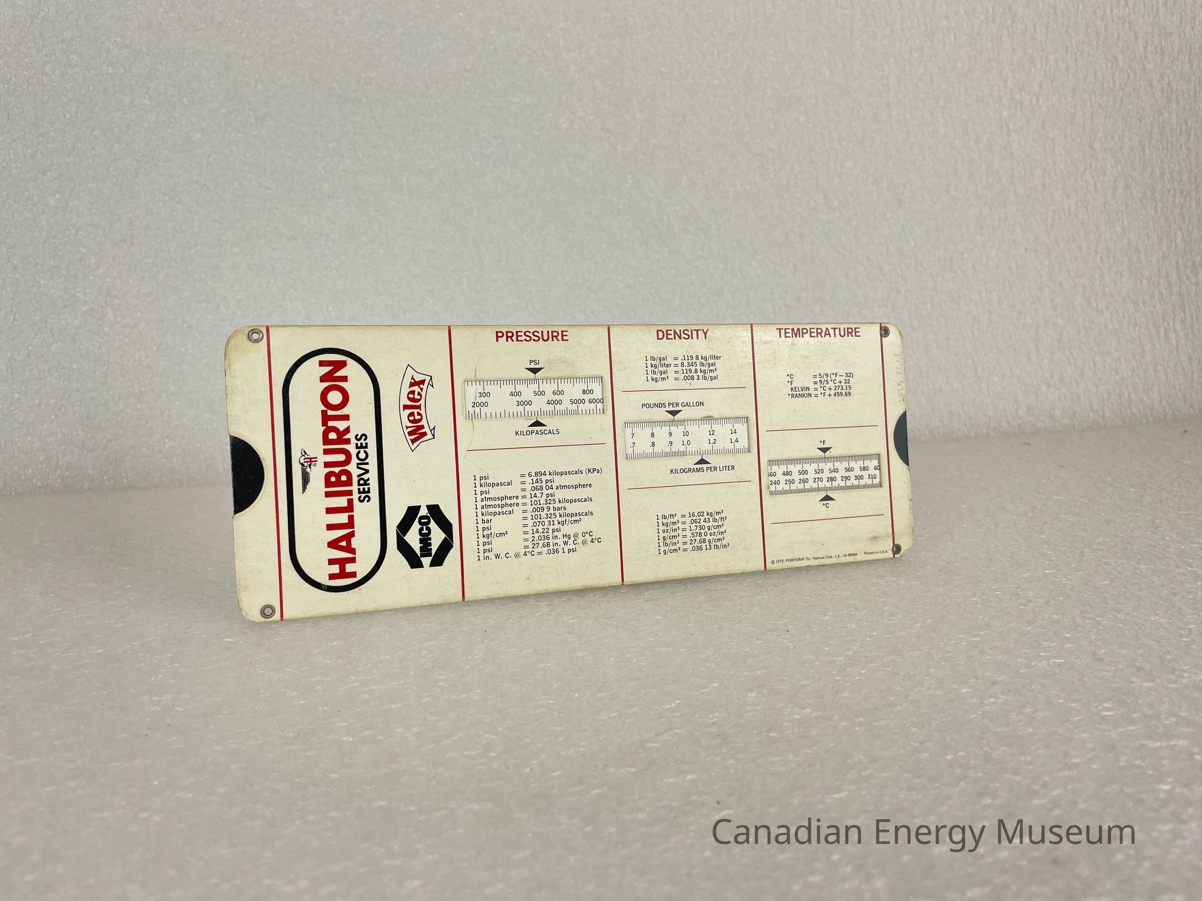 The slide chart is small, easy to hold, with two sides of conversions. On one side, the chart is split into four sections by a thin red line. In red text along the top of each section are "LENGTH", "AREA", "VOLUME", and "WEIGHT". Underneath each heading is small black text with rectangular cutouts to see the measurement chart. The other side displays the same four sections; however, the far left section displays a large black and red logo for Halliburton with two smaller logos underneath for IMCO and Welex. The logos are angled, so they are facing to the right of the chart.