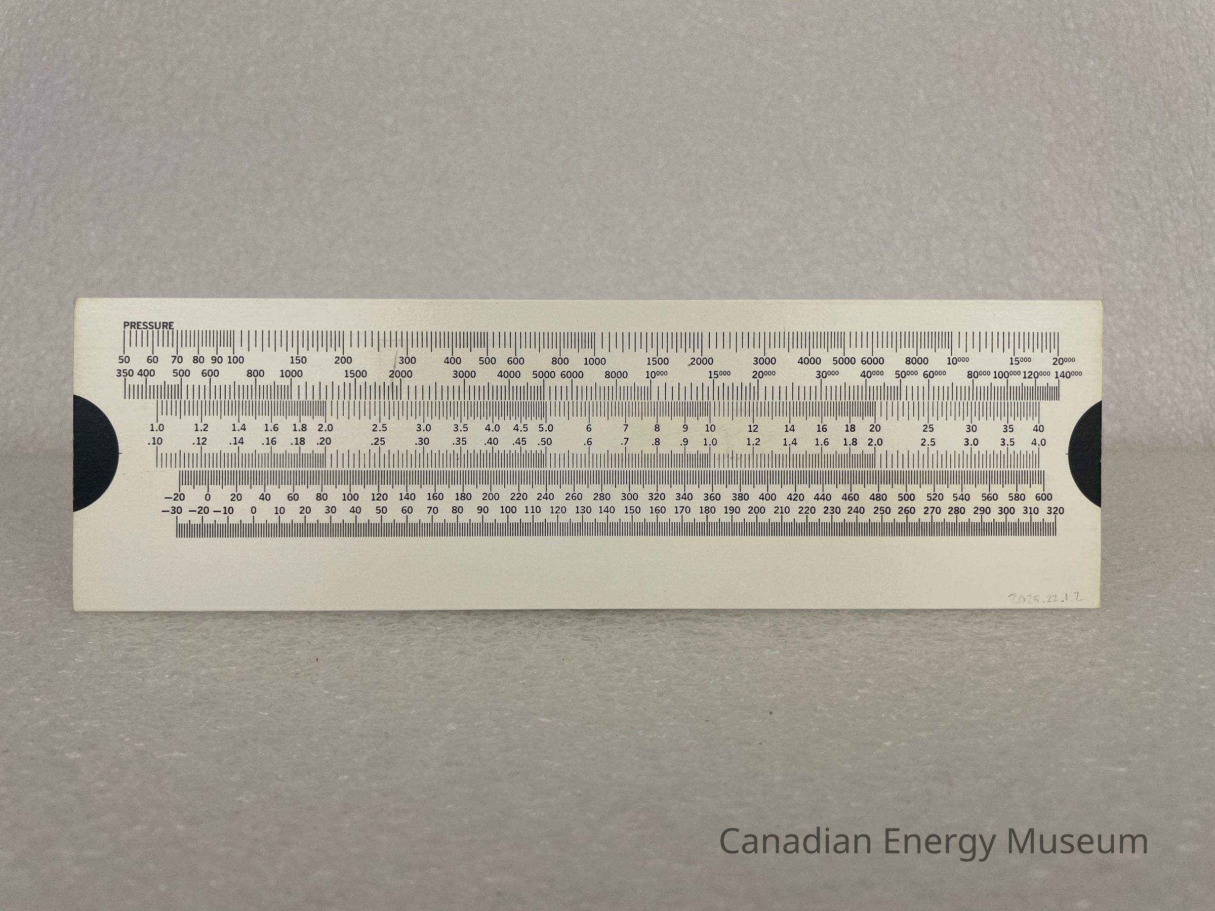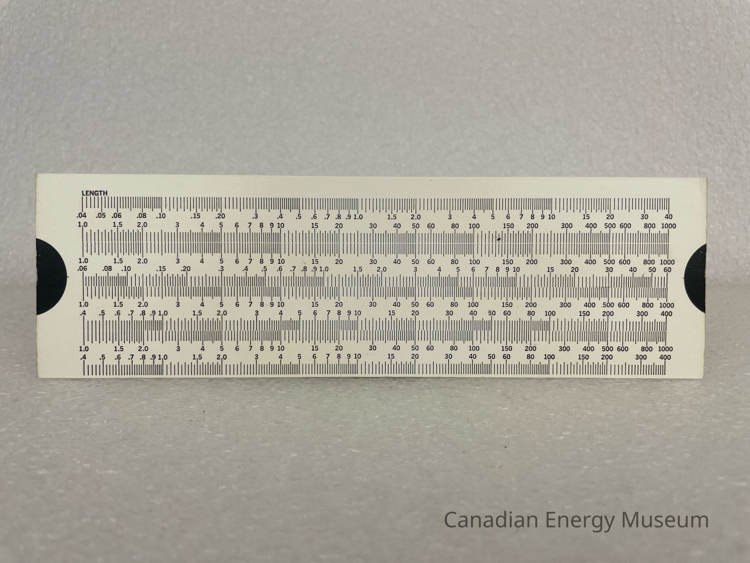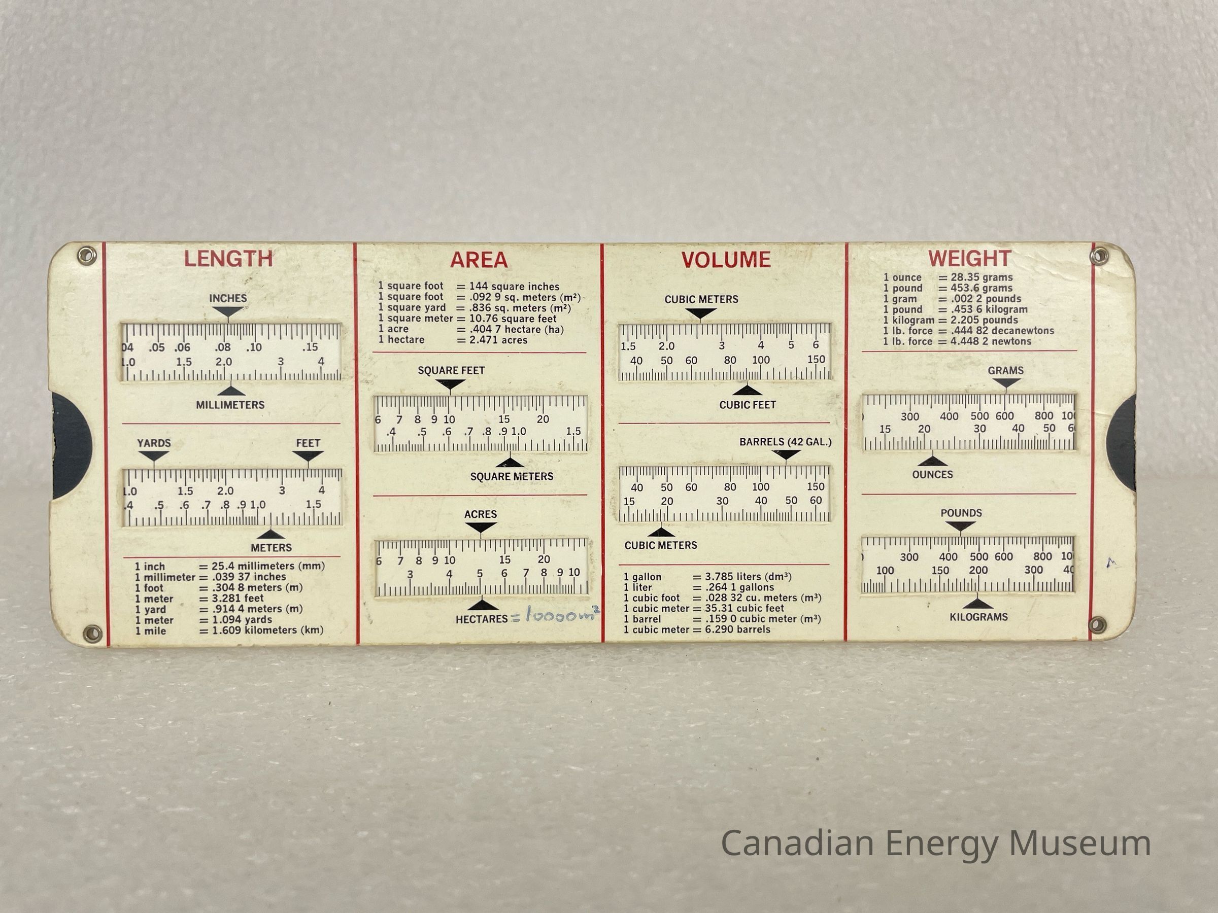 The rectangular piece held within the chart is a thick card material, white with black text, and displays multiple lines and measurement numbers. On the left and right, on both sides, is a black semicircle, where the user would grab onto to move the piece around. This piece is meant to be moved in order to convert different measurements.