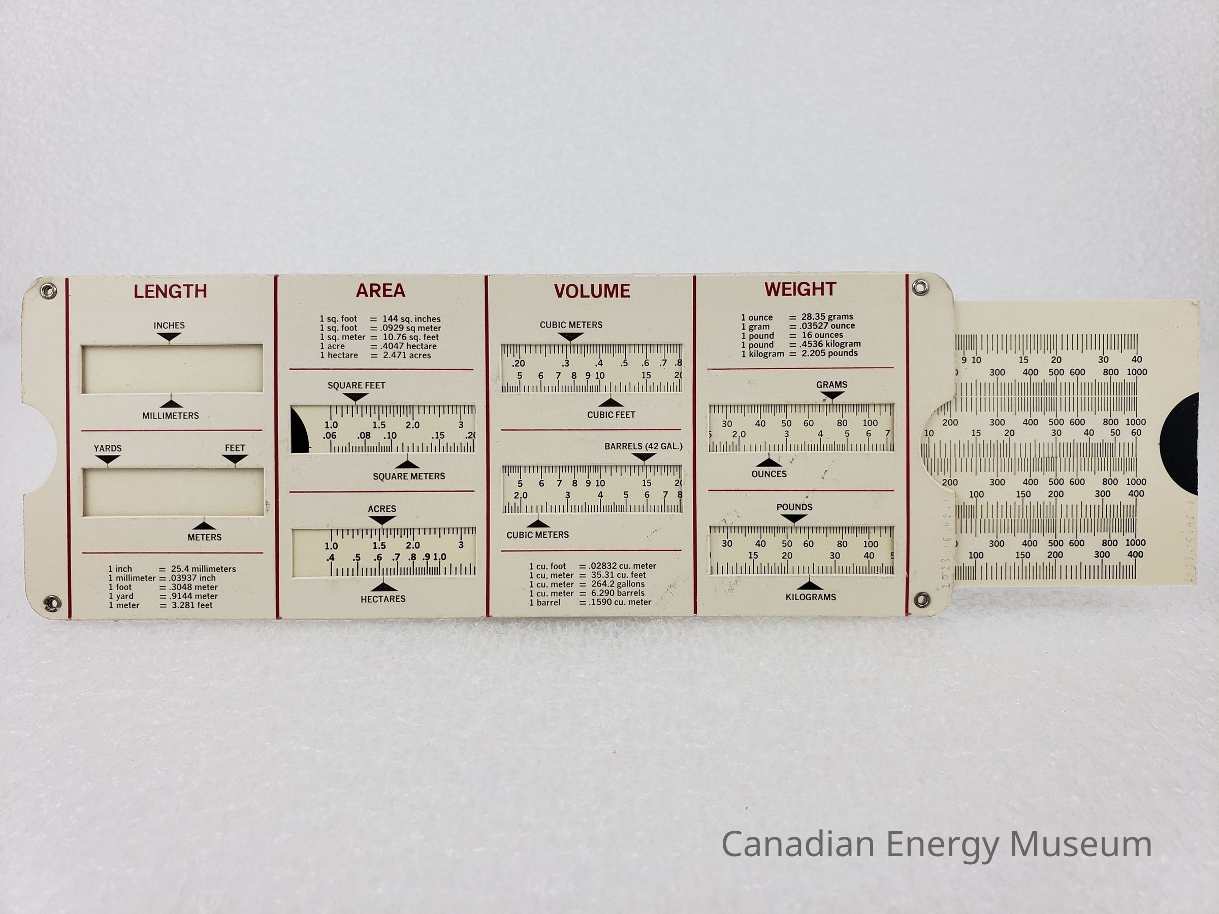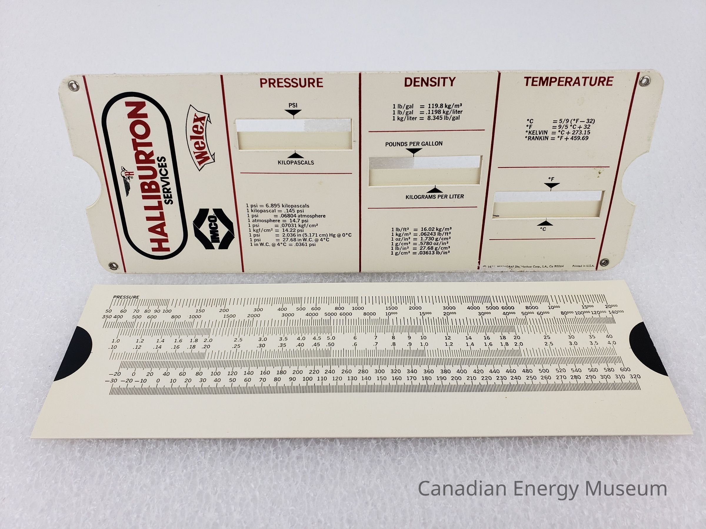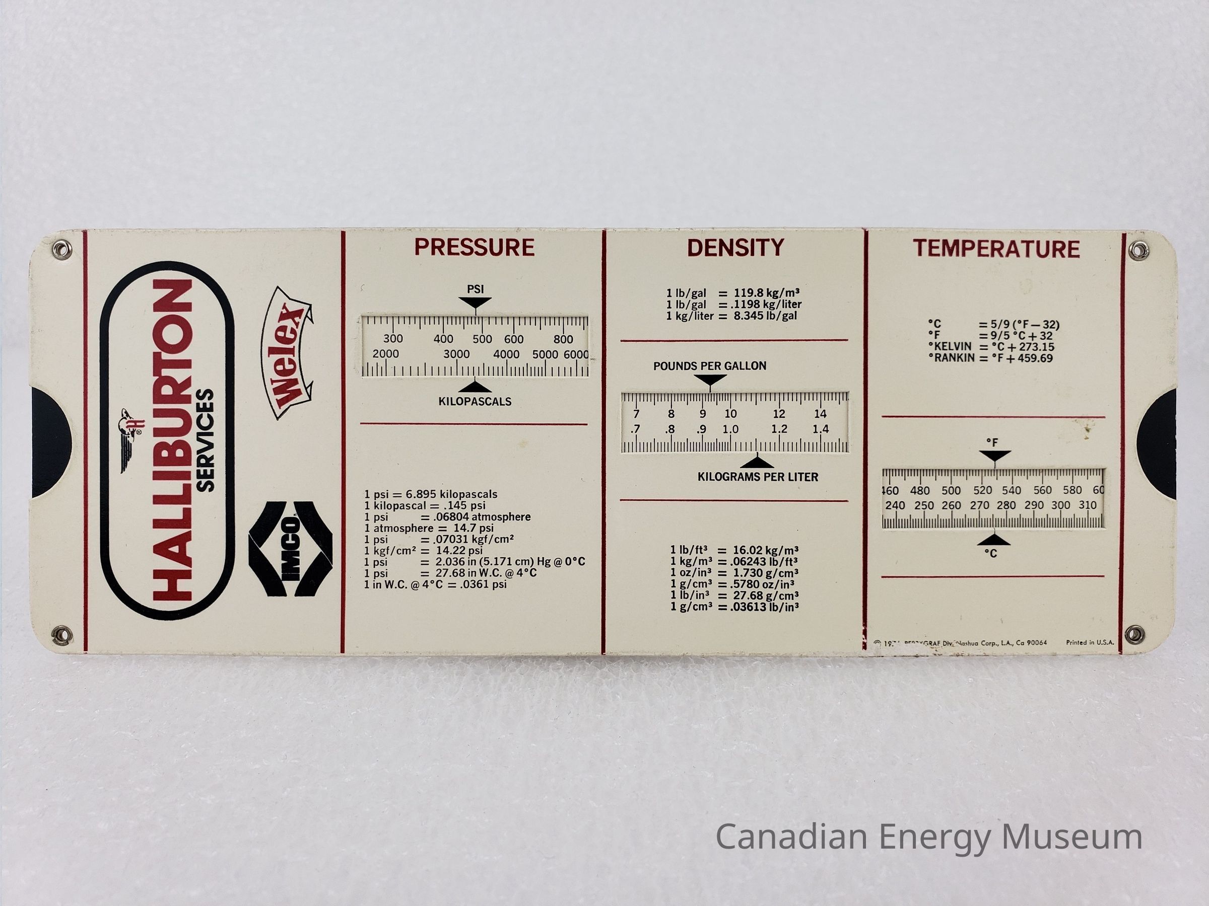 Slide Rule, Slide, Slide Chart, Conversion Chart, Slide Converter, White, Red, Black, Cardboard, Calculations Table, Calculator, Halliburton Services Ltd., Welex, IMCO, Pressure, Density, Temperature, Length, Area, Volume, Weight, Metal, Technical Stationery, Ruler, Stationery, 1970sDescription