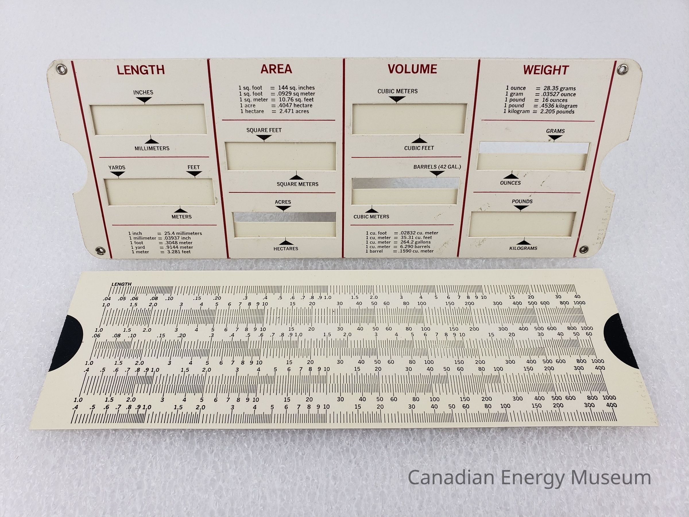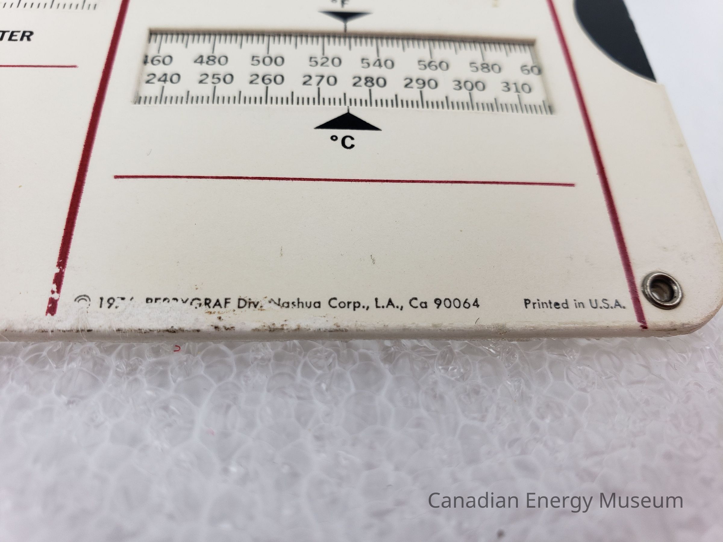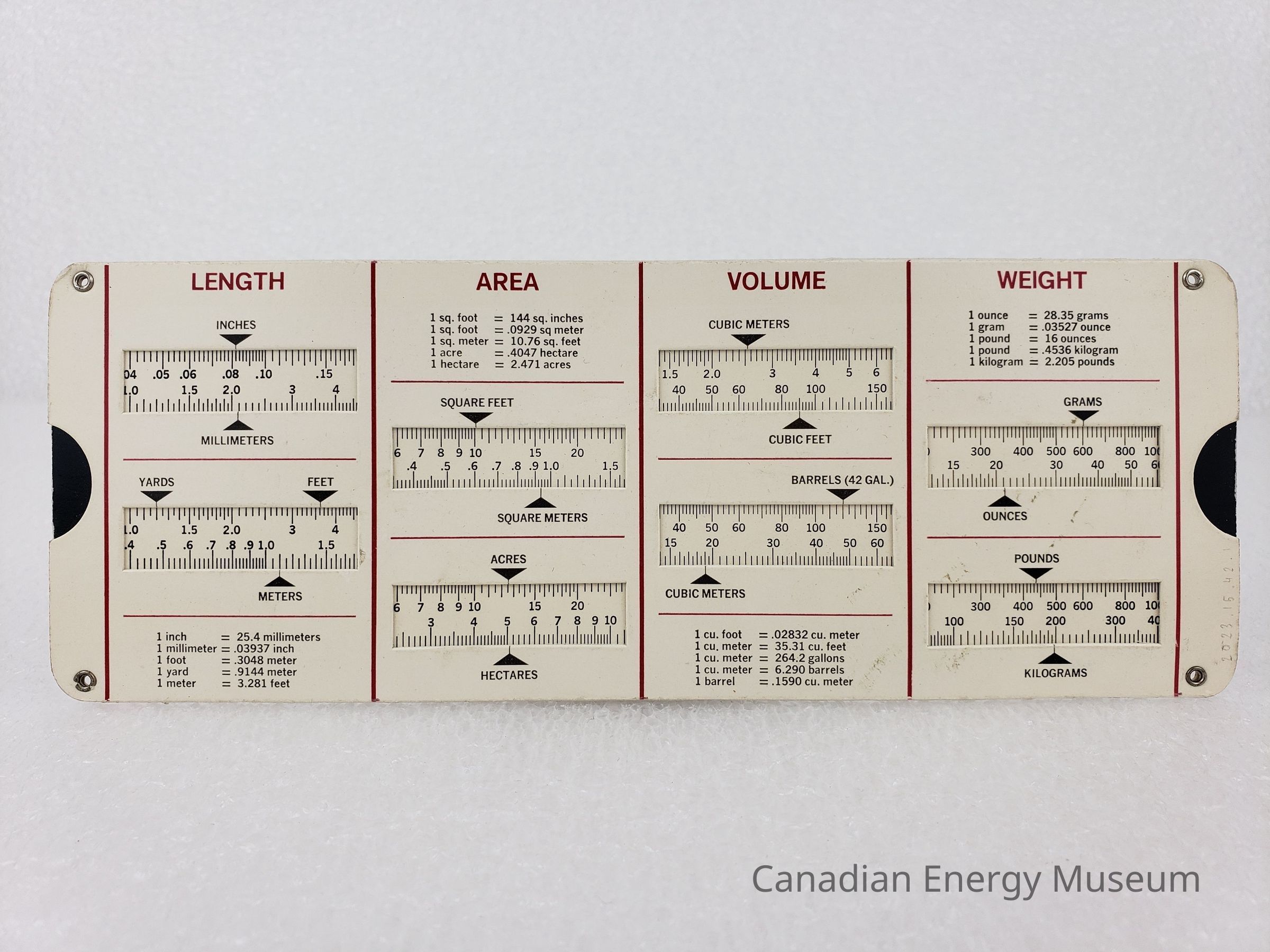 Slide Rule, Slide, Slide Chart, Conversion Chart, Slide Converter, White, Red, Black, Cardboard, Calculations Table, Calculator, Halliburton Services Ltd., Welex, IMCO, Pressure, Density, Temperature, Length, Area, Volume, Weight, Metal, Technical Stationery, Ruler, Stationery, 1970sDescription