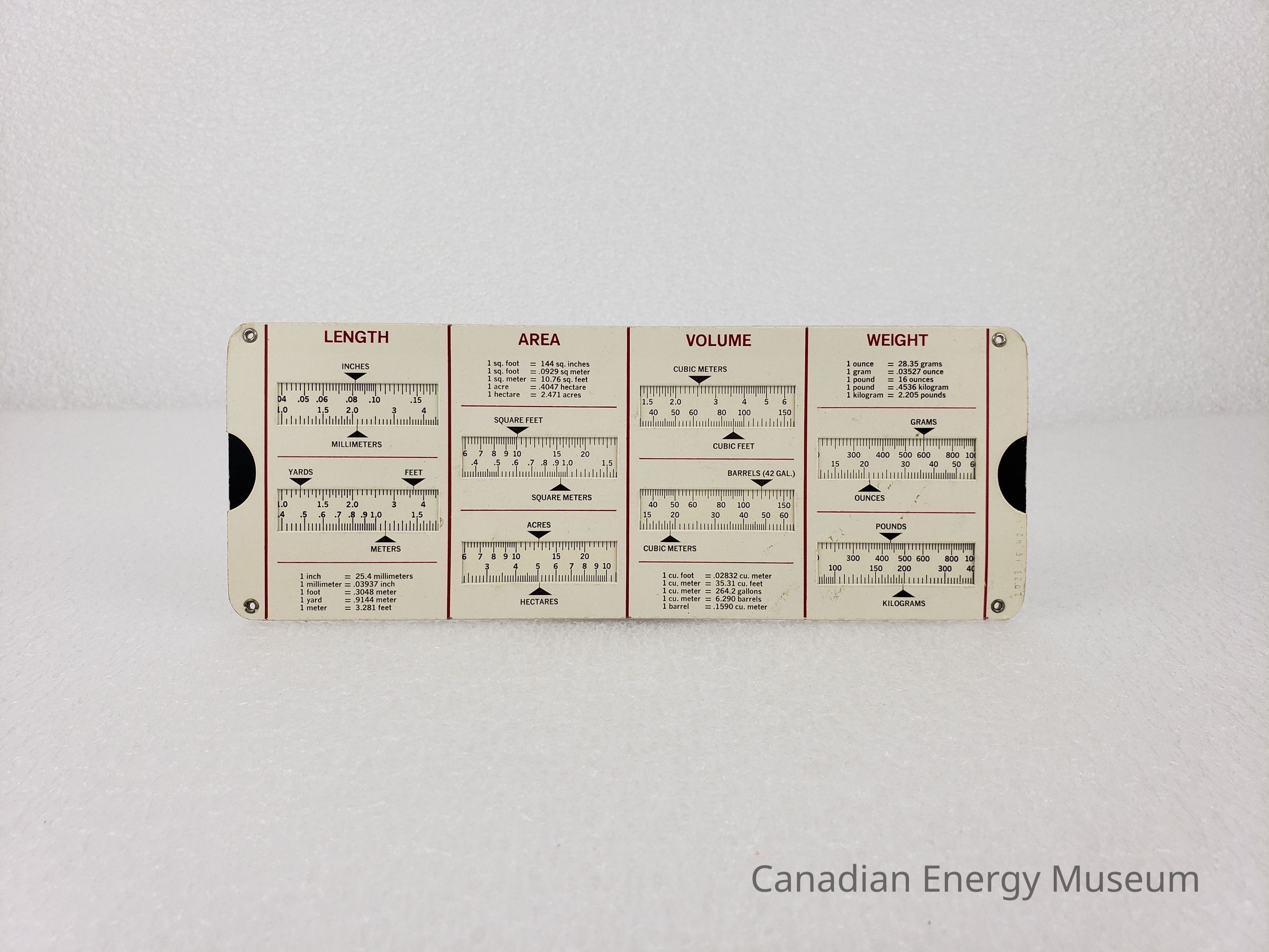 Features: A rounded-corner rectangular cardboard slide chart, with red and black print and with small silver eyelets in each corner. The measurements included are Length, Area, Volume, Weight, Pressure, Density, and Temperature.