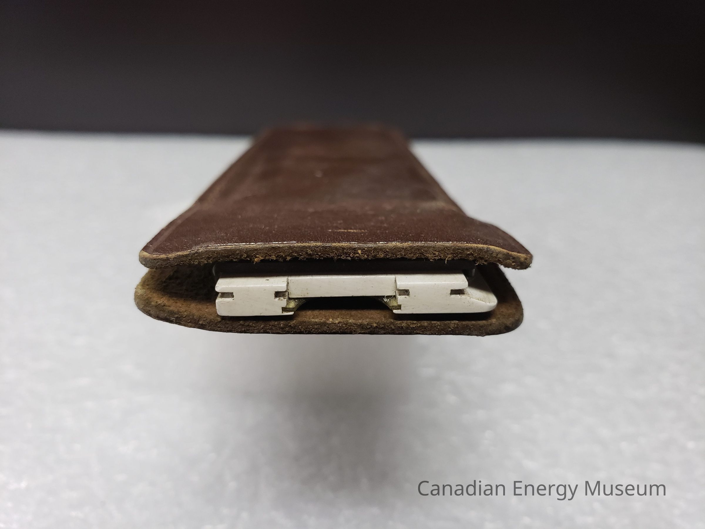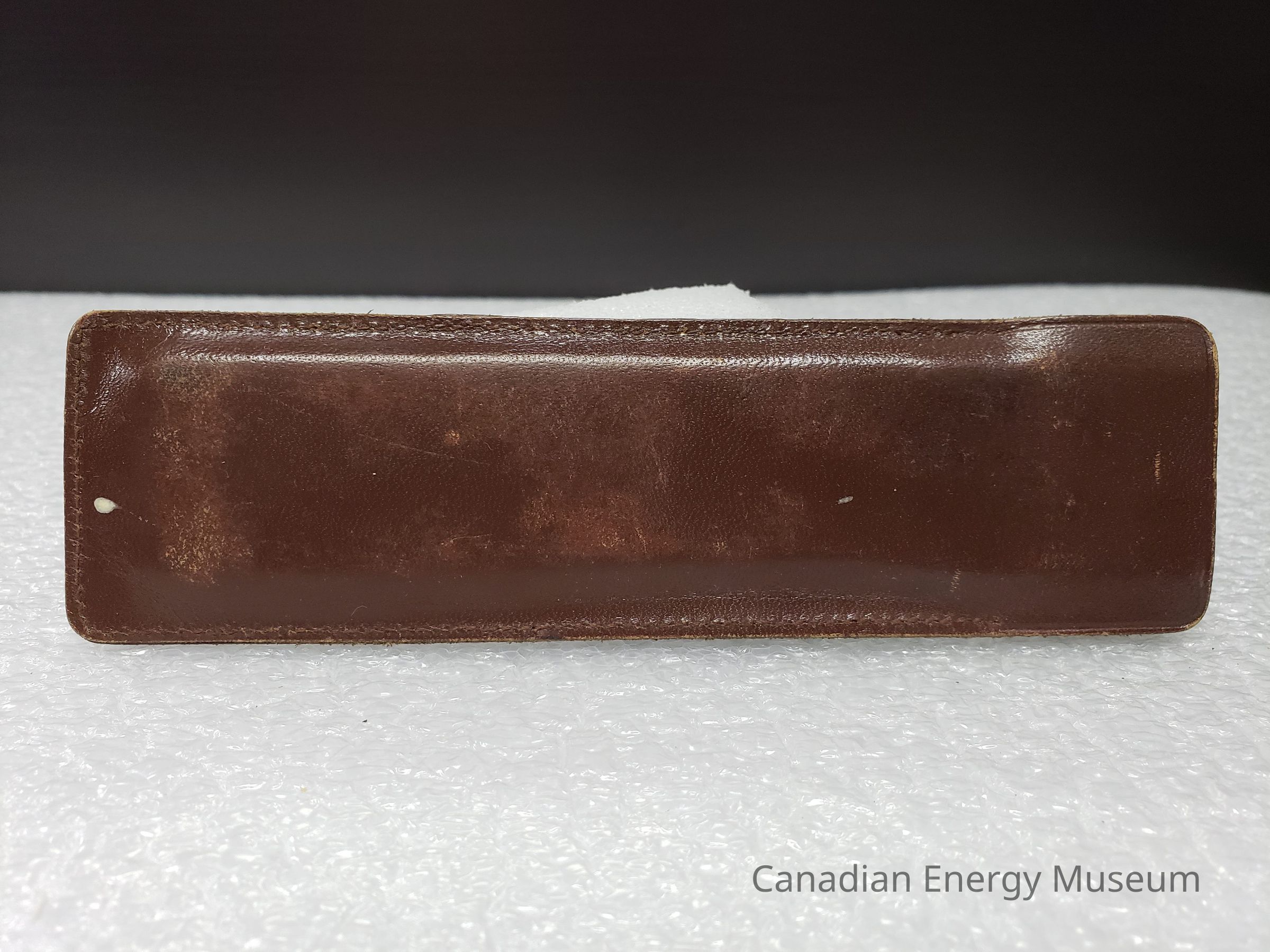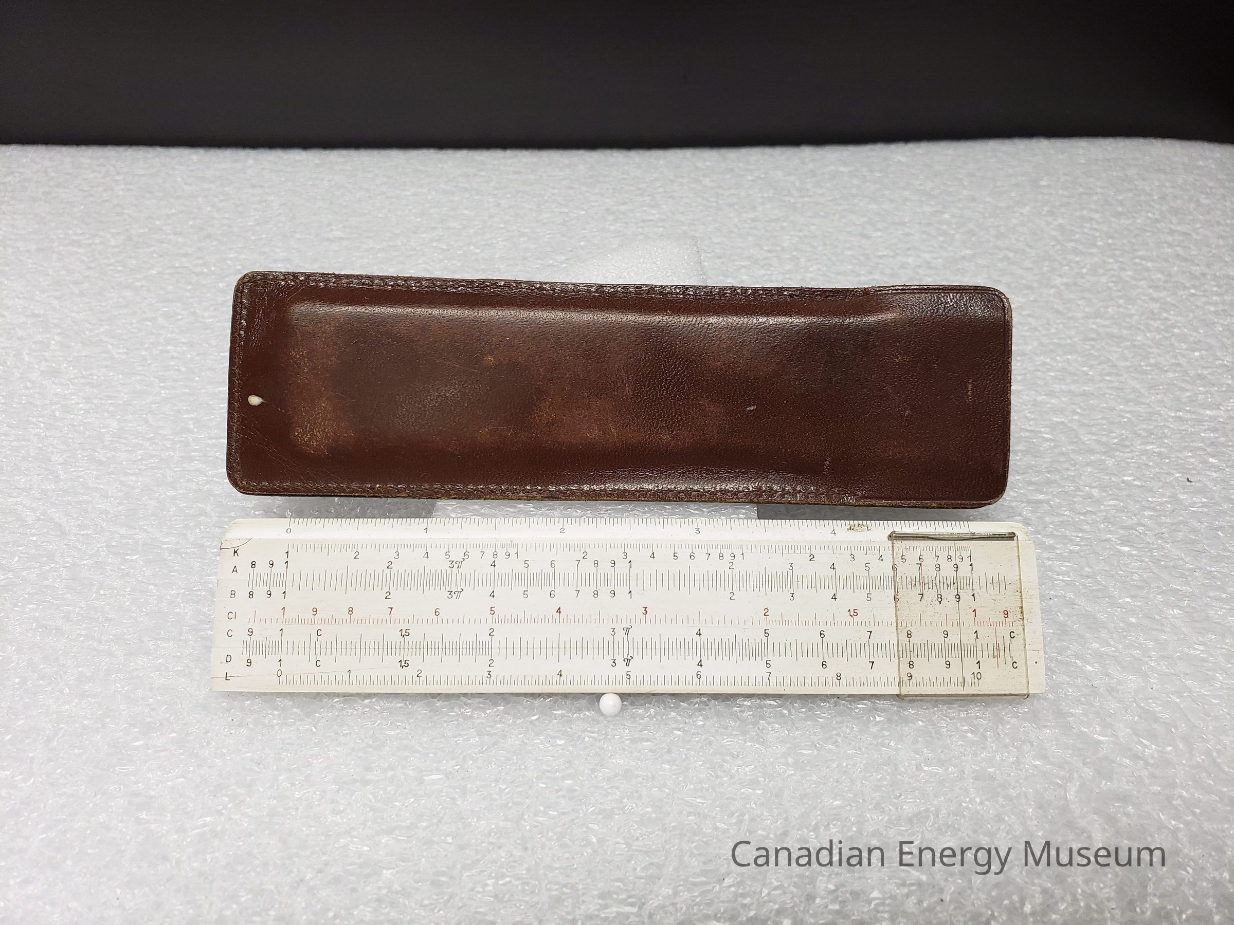 Leather Cover: A brown-coloured leather case, custom made for the slide rule. The opening has no closure flap, and is stitched together. The base of the back has "DENMARK" debossed into the leather, above the stitching.Collection