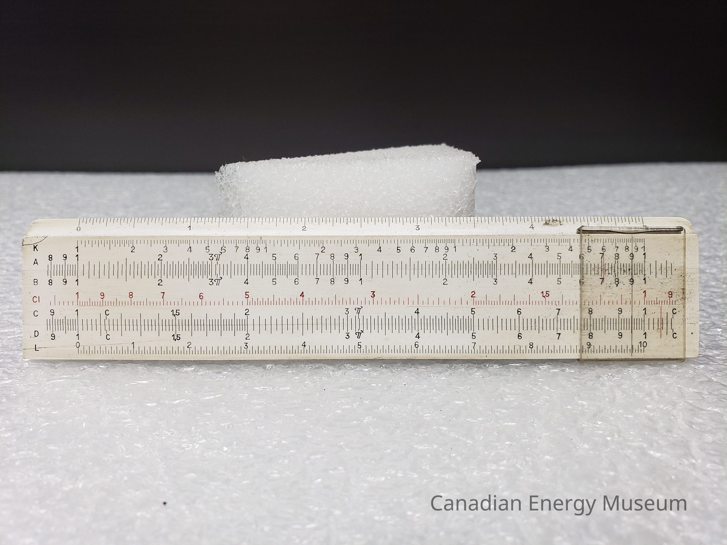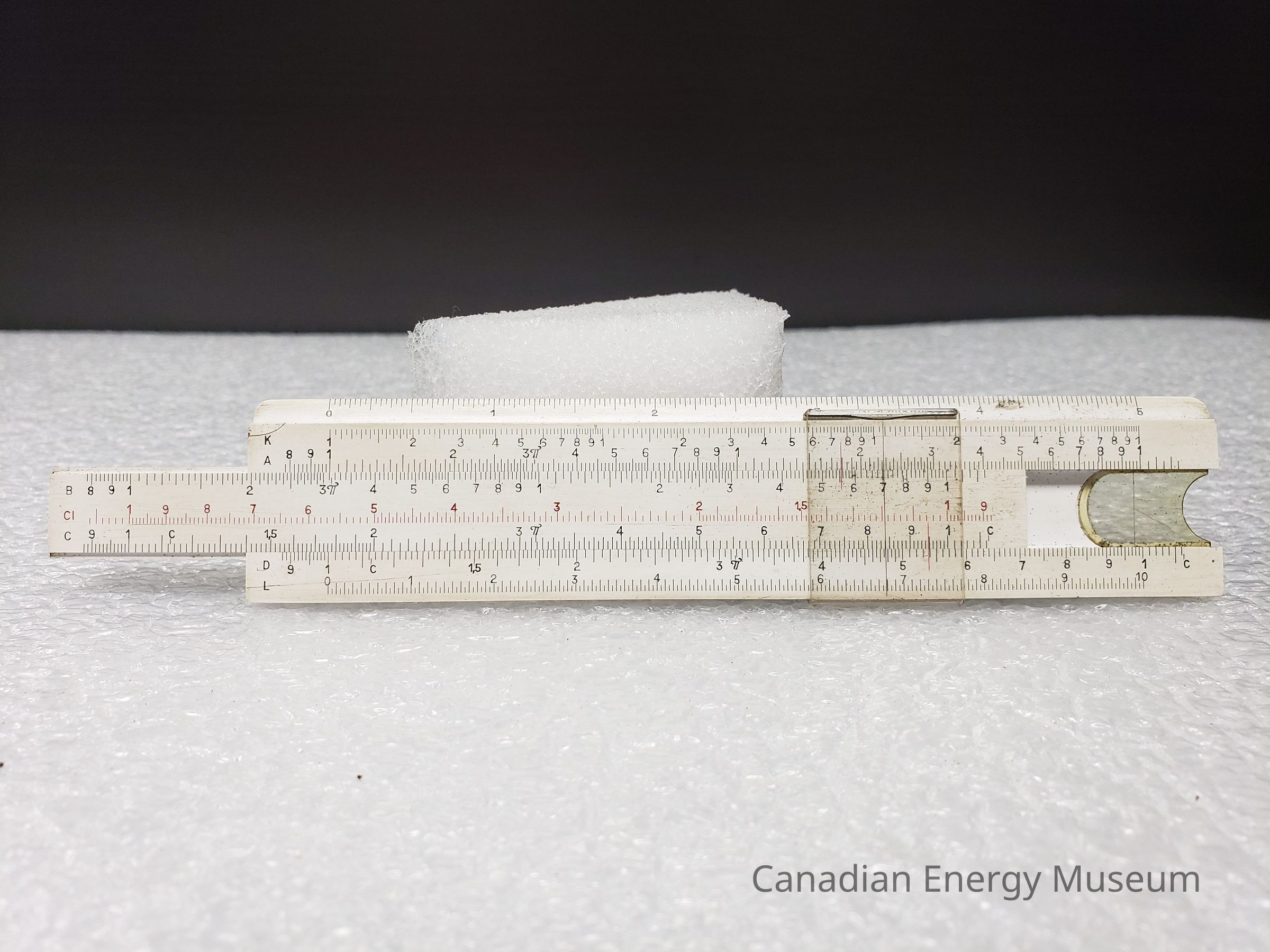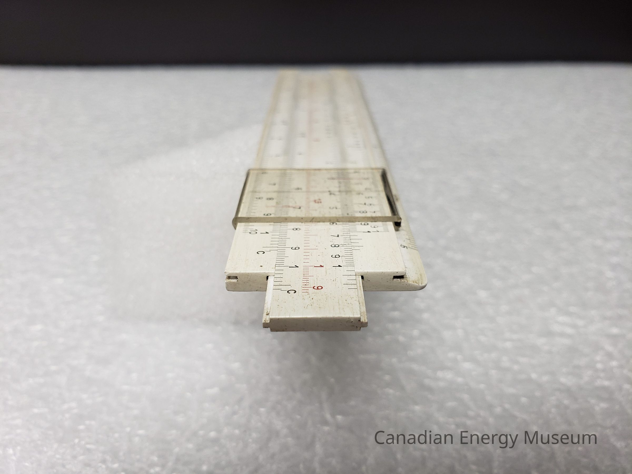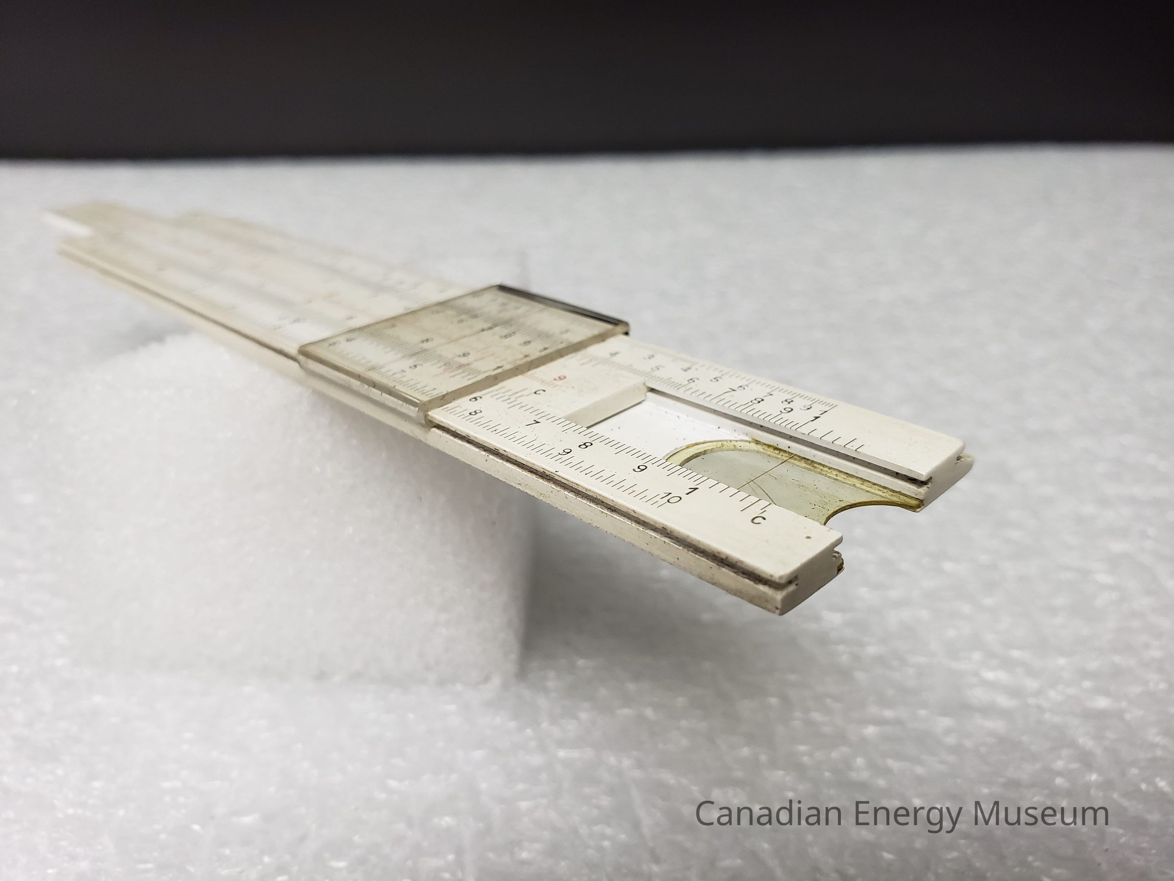 The clear window on the right end of the back side of the slide rule is yellowed.Structure