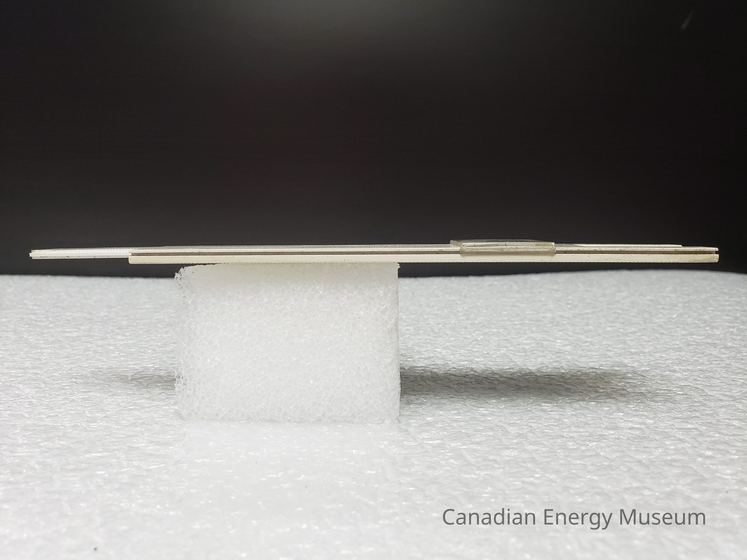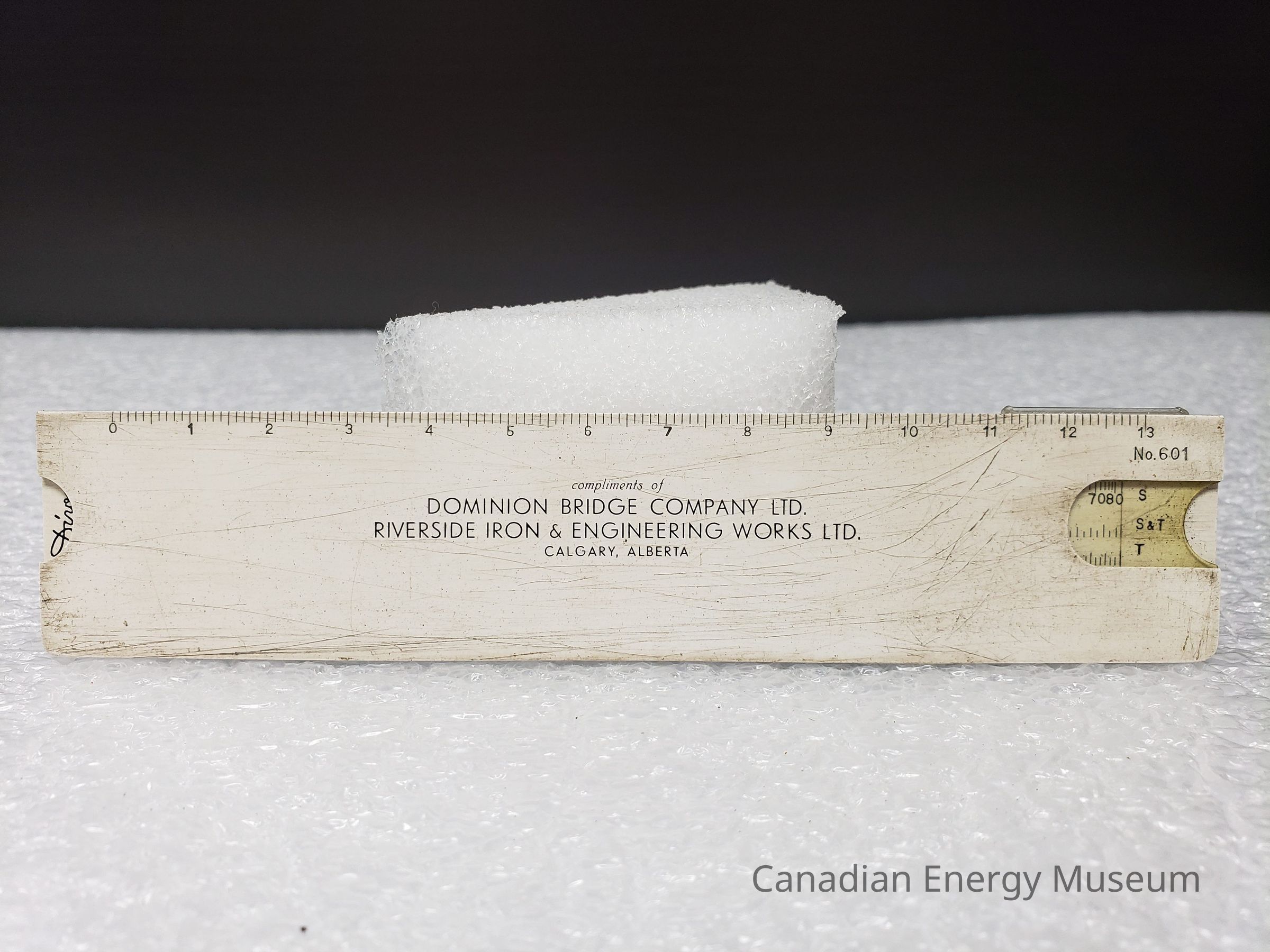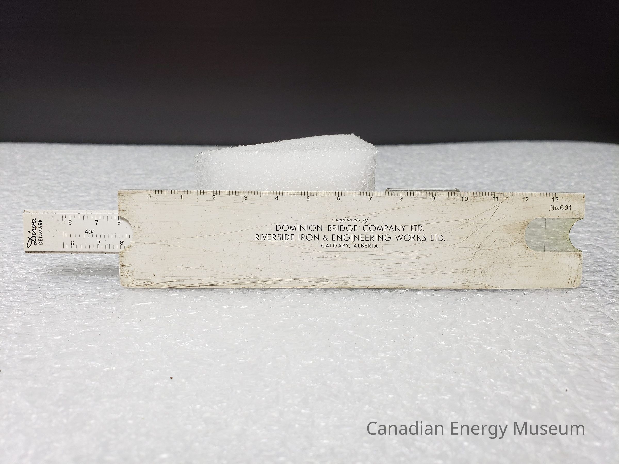 Slide Rule: A UTO (Denmark) manufactured plastic slide rule, in white with black print, with a clear plastic cursor. The front side bears the scales and cursor. On the reverse, is printed in black the text "complements of DOMINION BRIDGE COMPANY LTD.; RIVERSIDE IRON & ENGINEERING WORKS LTD.; CALGARY, ALBERTA". To the right is a curved cut-out with a clear plastic window, above which is the black model number "No.601".