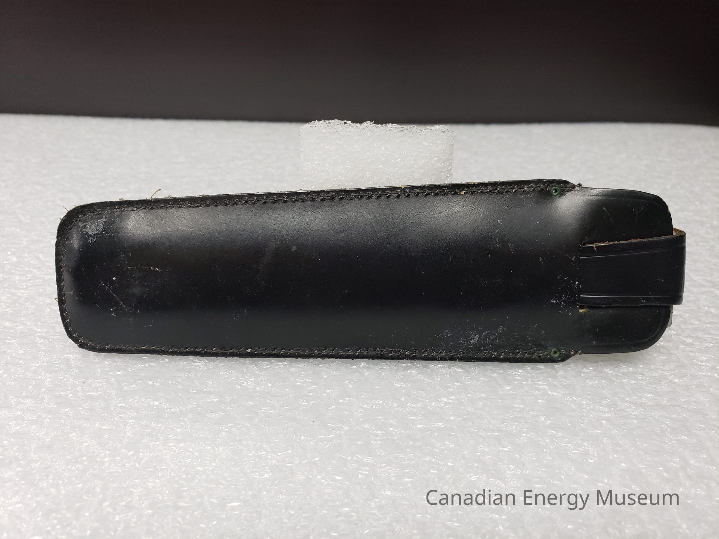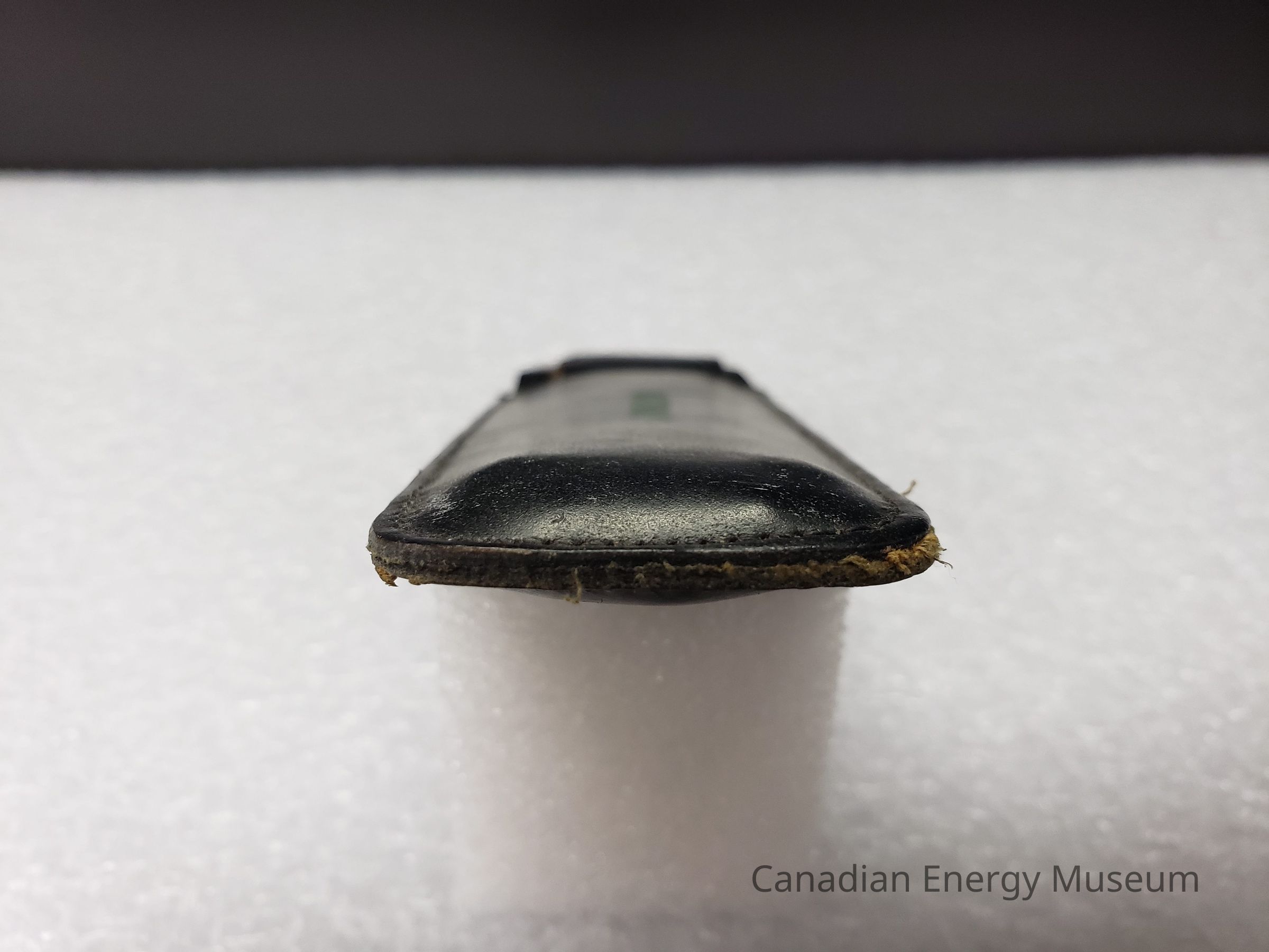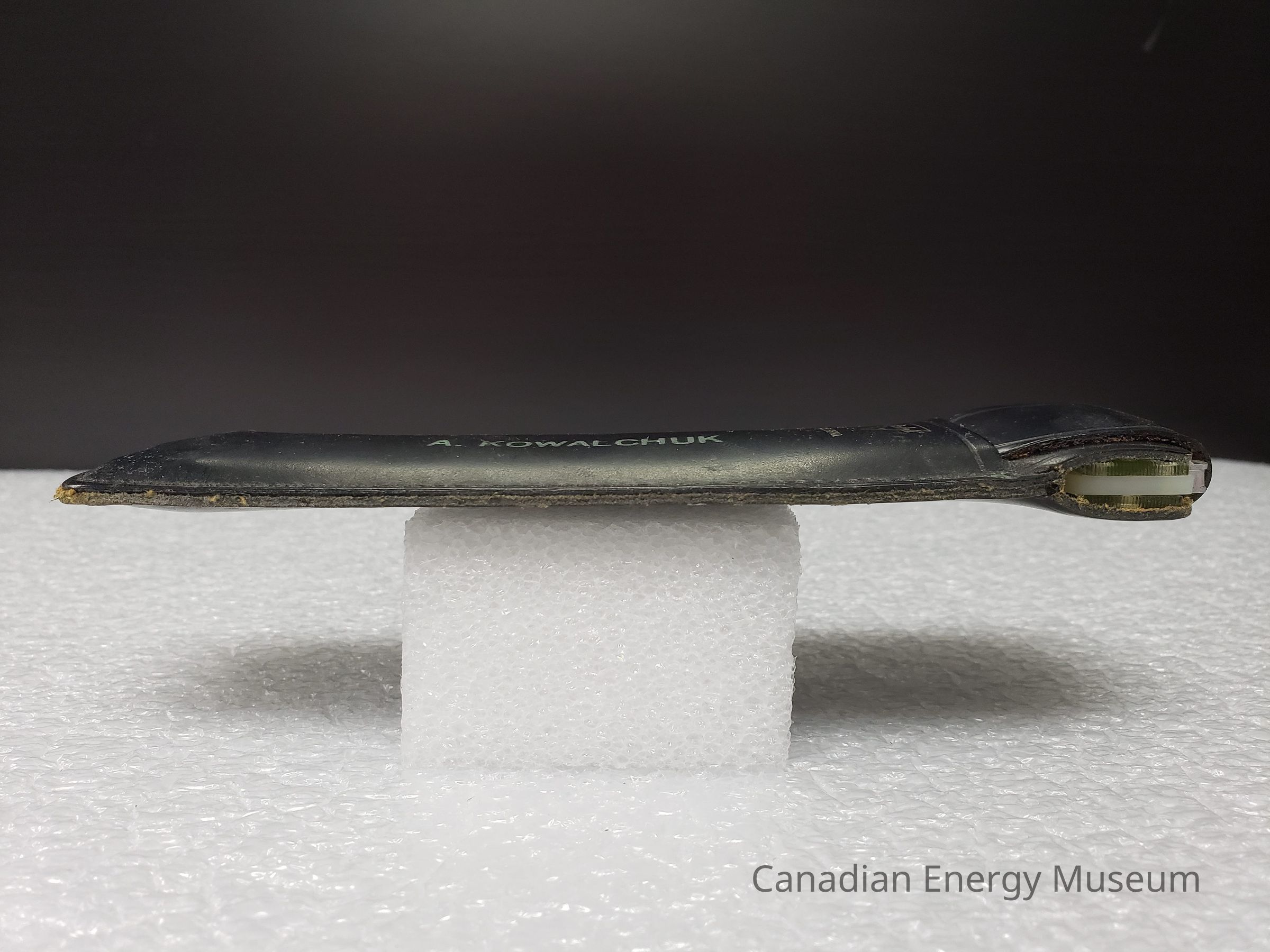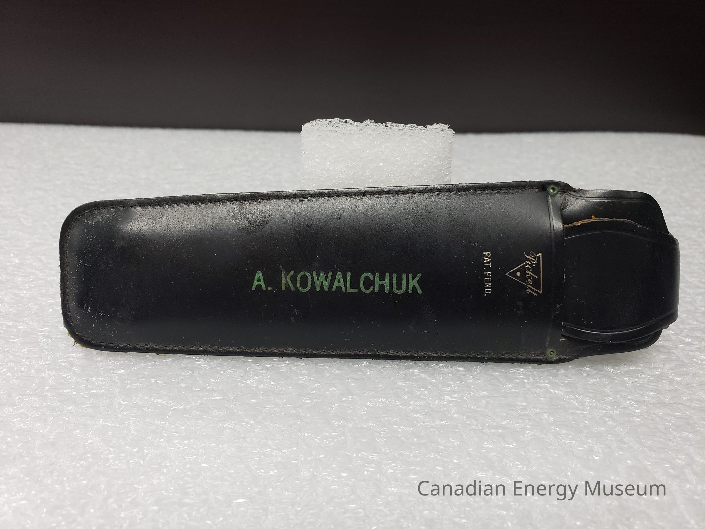 Leather Cover: A black-coloured leather case, custom-made for the slide rule, and has been customised with the name "A. KOWALCHUK" in the middle of the front side. To the right of the name, below the opening is also imprinted in gold the triangular Pickett logo and "PAT. PEND.". At the opening, there is a flap that secures the slide rule inside. Leather is stitched together, with some pressed detailing around the edge of the opening and flap.Collection