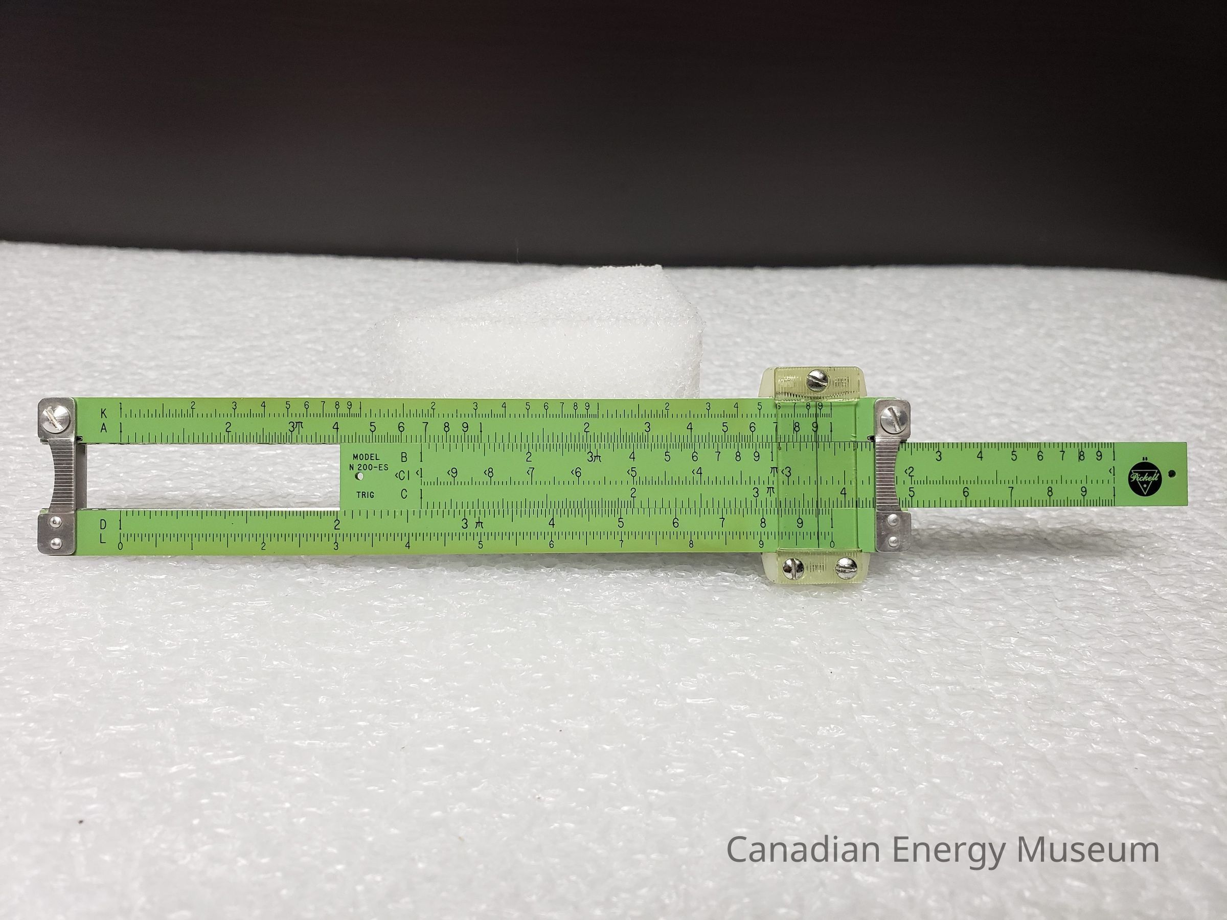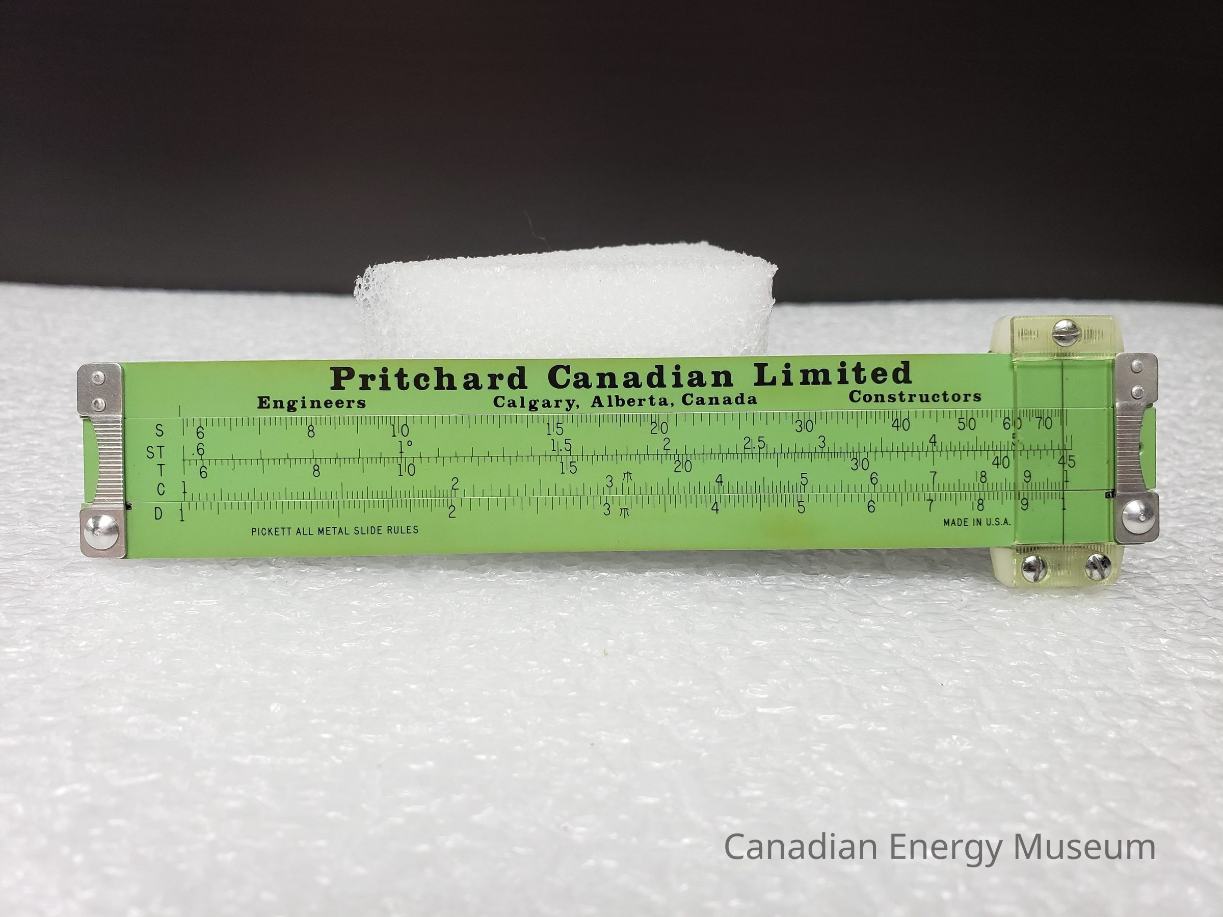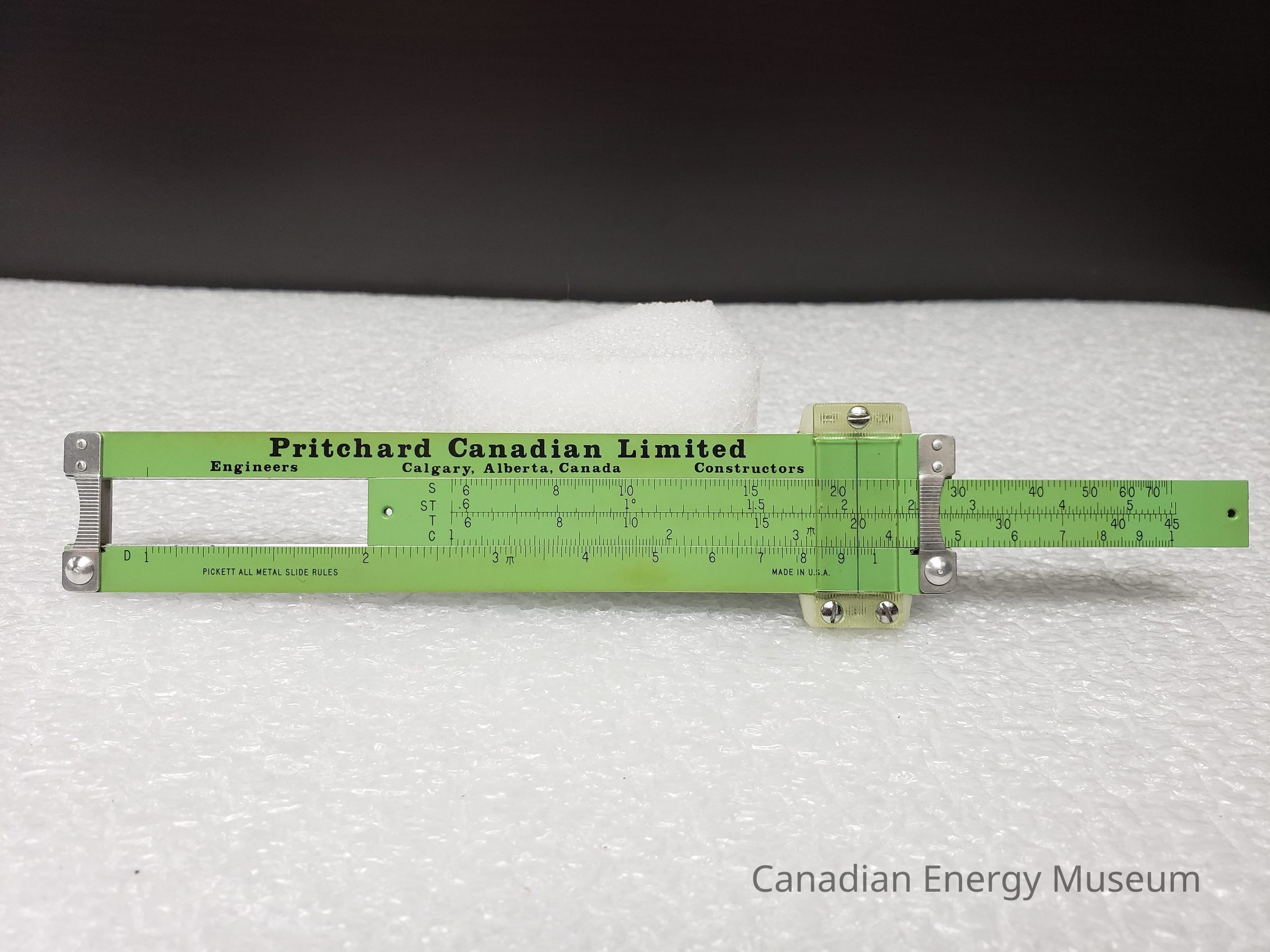 Slide Rule: An all-metal Pickett manufactured slide rule, in green. Bears branding for "Pritchard Canadian Limited; Calgary, Alberta, Canada; Engineers; Contractors" in black print on the front. Also bears the following black text along the base of the front side: "PICKETT ALL METAL SLIDE RULES" (left), and "MADE IN U.S.A." The back of the slide rule bears the model number (MODEL N 200-ES TRIG) on the left, and the Pickett logo on the right.