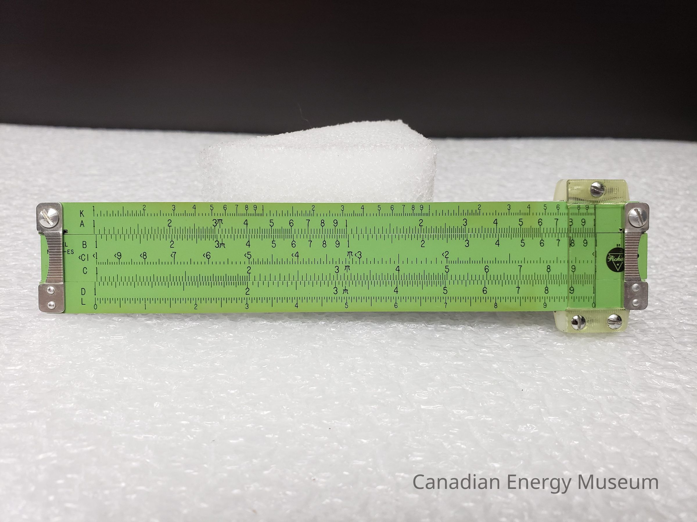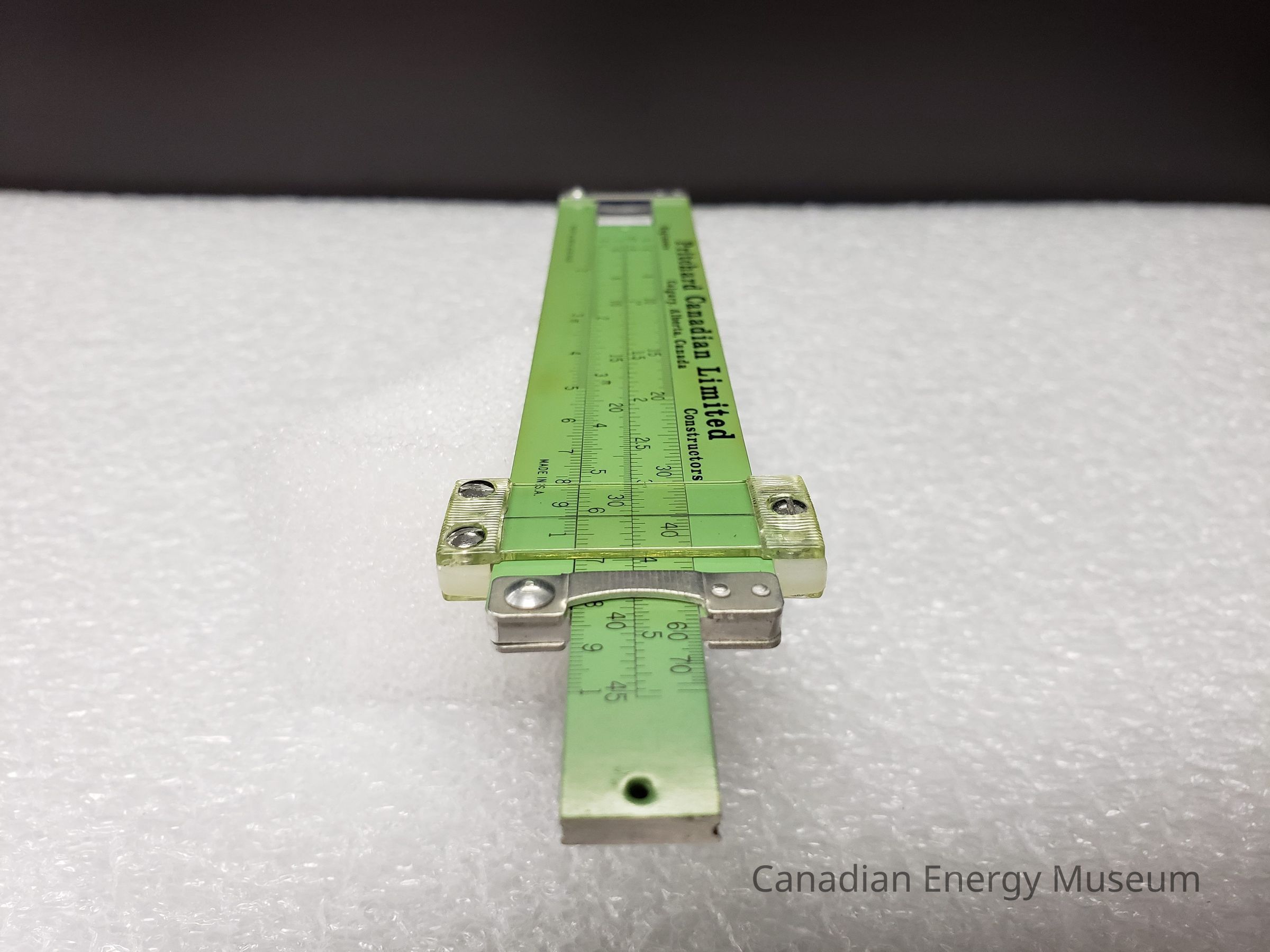 Ruler, Slide Rule, Slipstick, Measuring Tool, Pritchard Canadian Ltd., Calgary, Alberta, Canada, Green, Leather, Plastic, Metal, Construction, Pickett, 1970sDescription