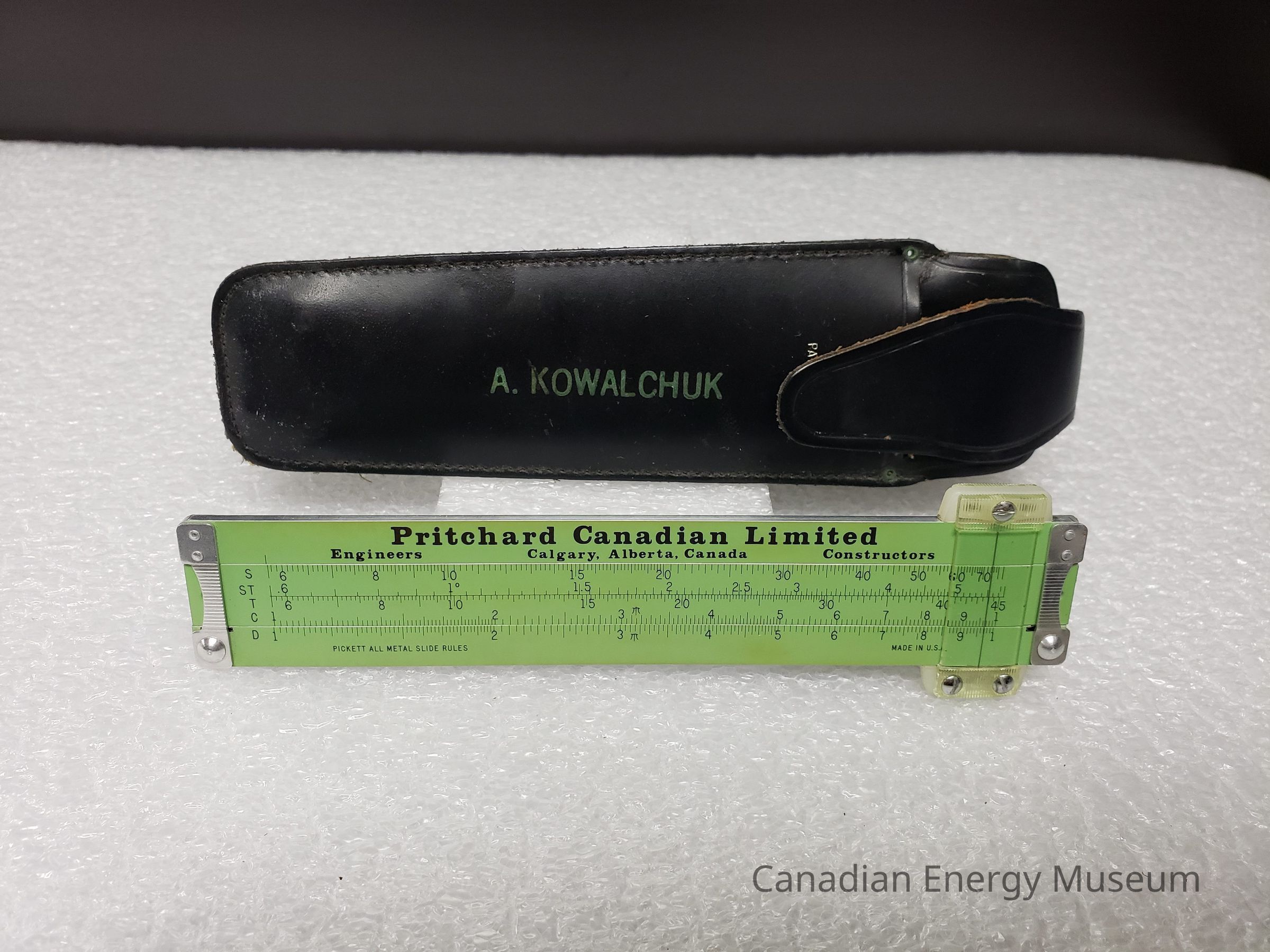A green Pickett manufactured slide rule, with leather storage case. Branded to Pritchard Canadian Ltd (Calgard, Alberta), customised for A. Kowalchuk.