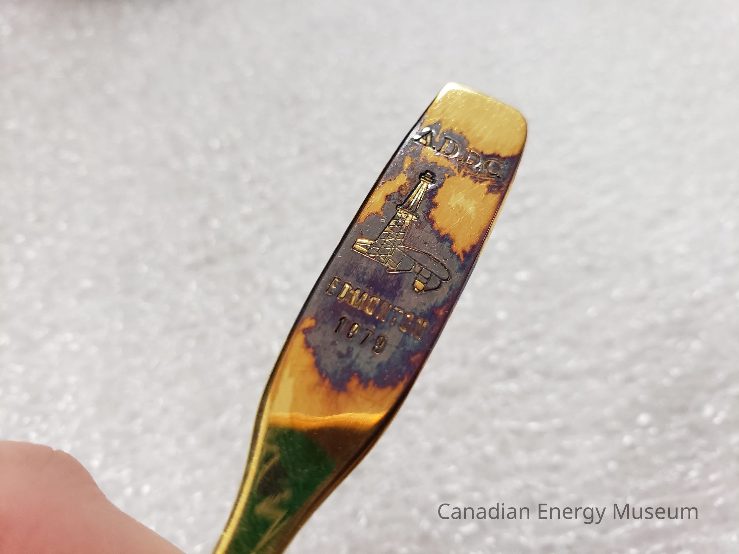 Design: Engraved with the ADDC's desk and derrick logo at the end of the spoon's handle. Above the design is "ADDC", and below is "Edmonton; 1979".