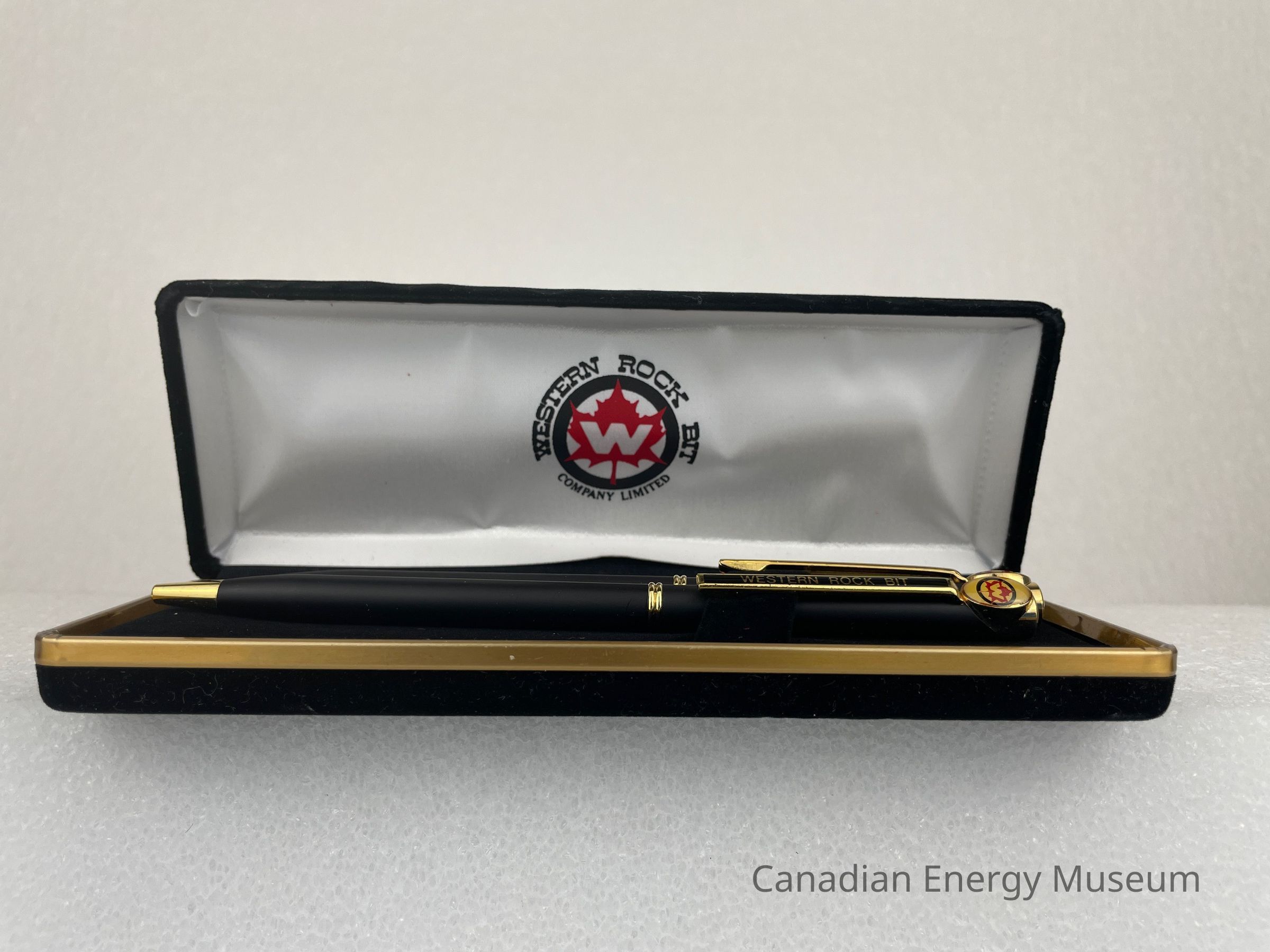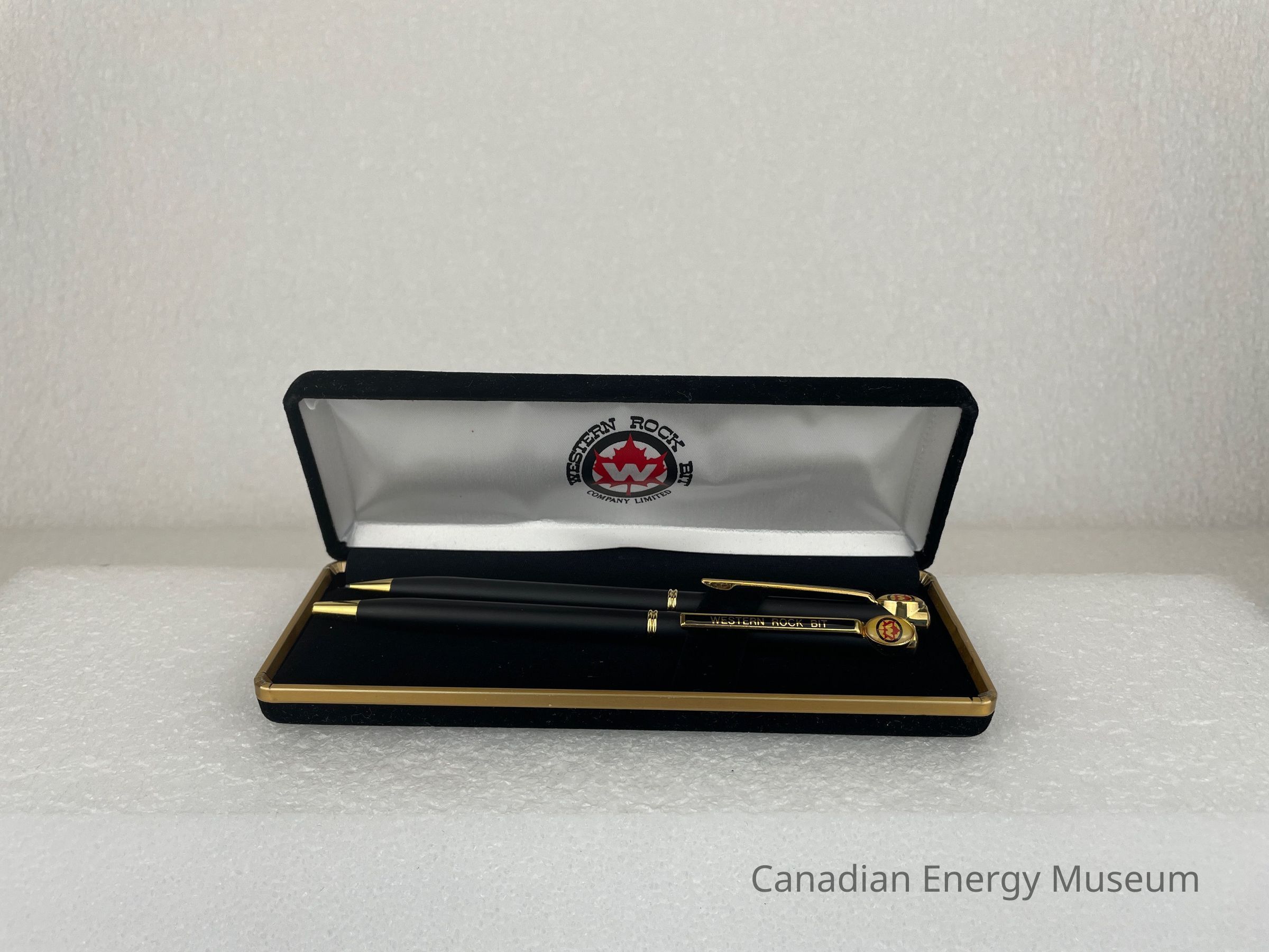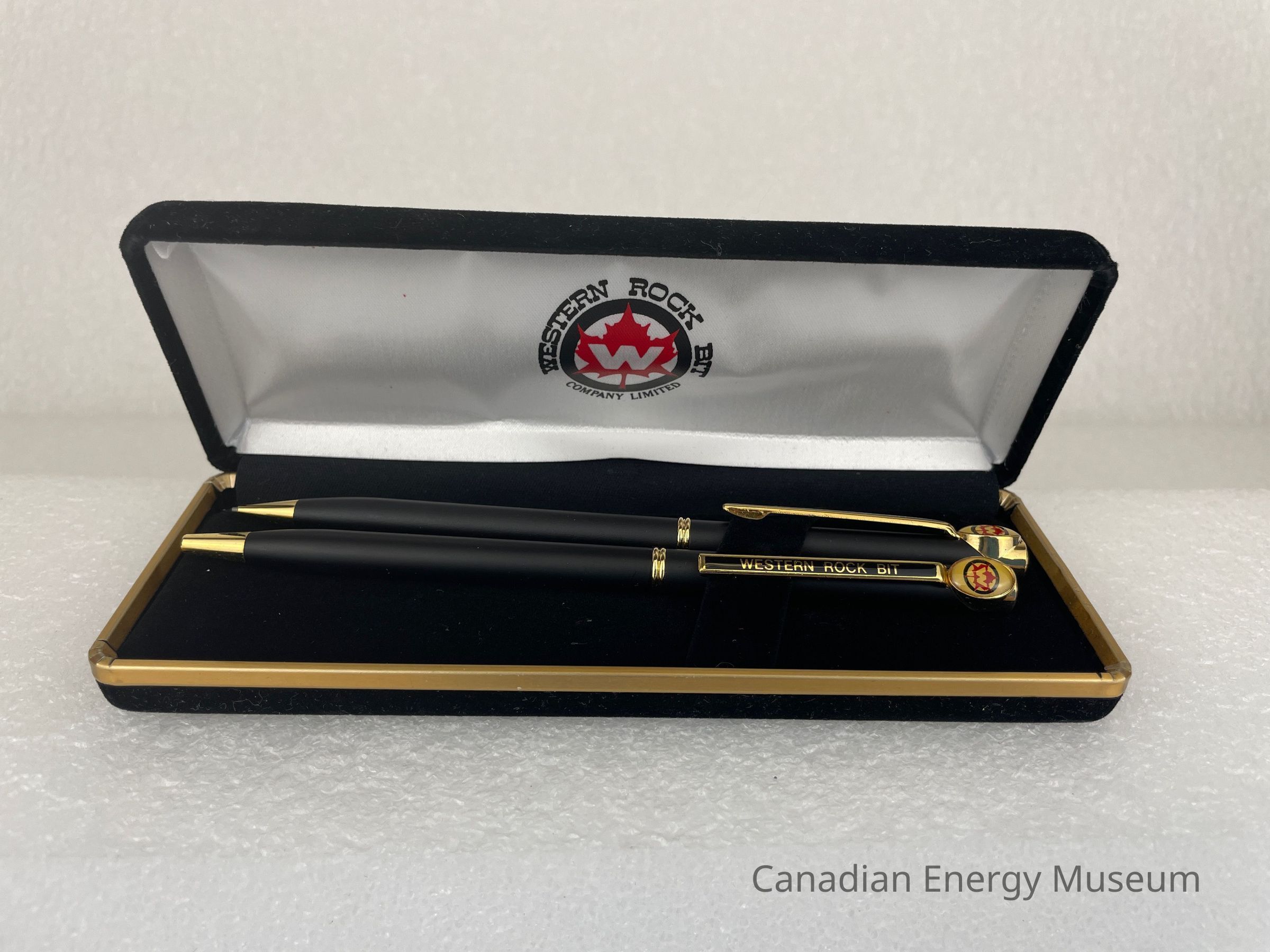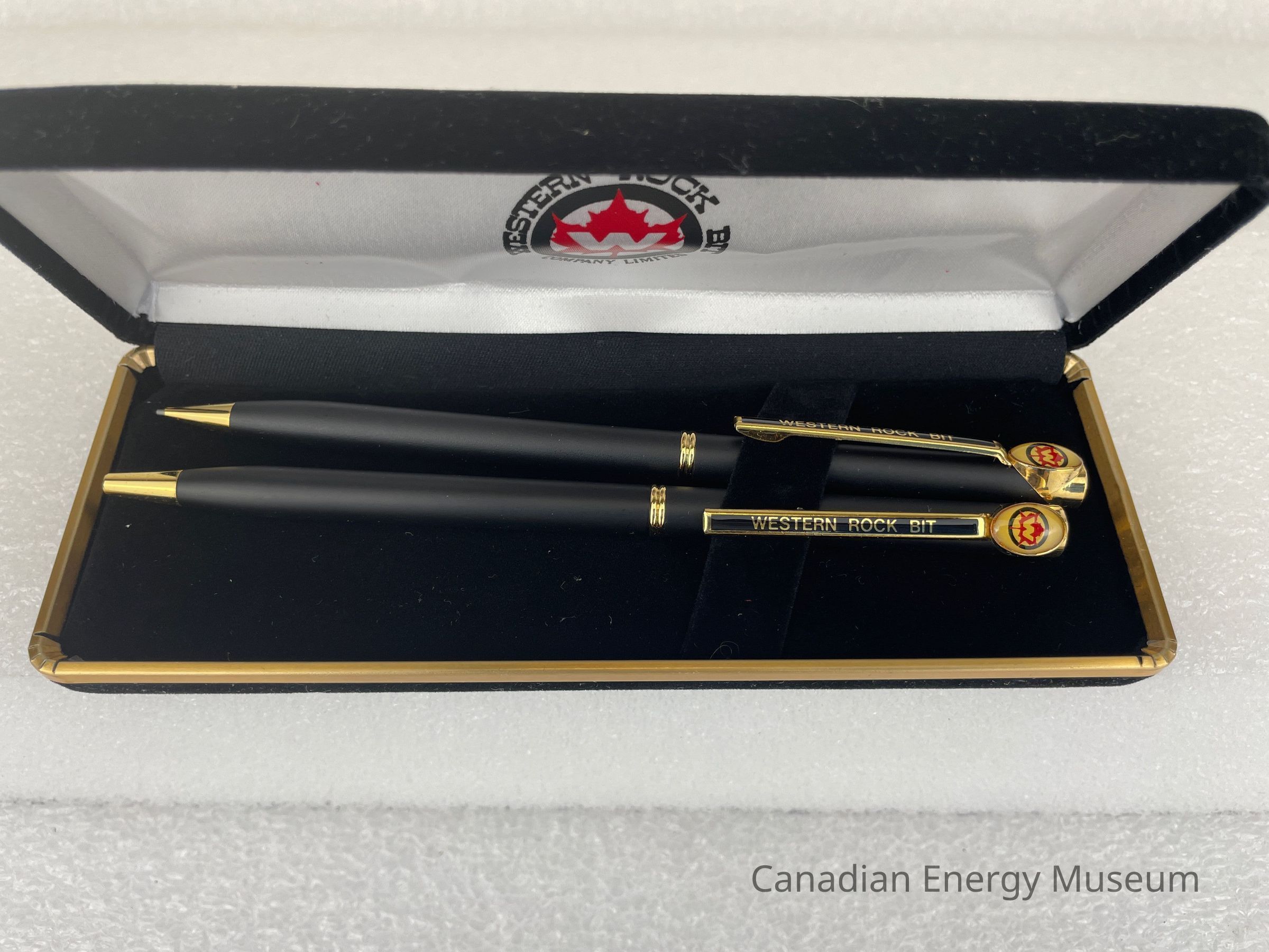 The case is a long, rectangular, black, velvet case. Along the edge of the bottom case is a gold band. The interior of the lid is covered in a white satin fabric with the Western Rock Bit logo displayed in the centre. The bottom of the case interior is flat, black velvet with a velvet, angled band of fabric for the pen and pencil to clip onto.Collection