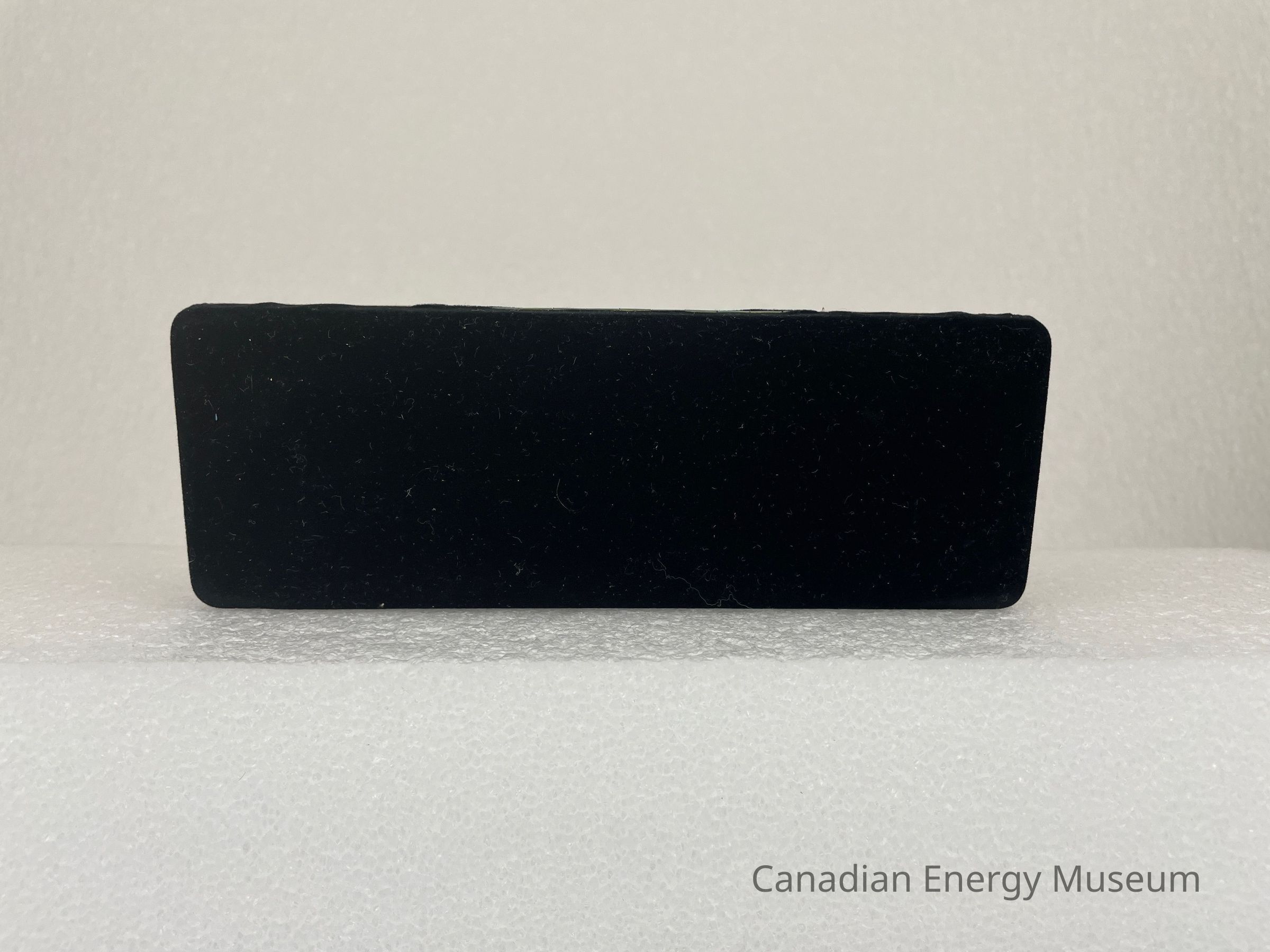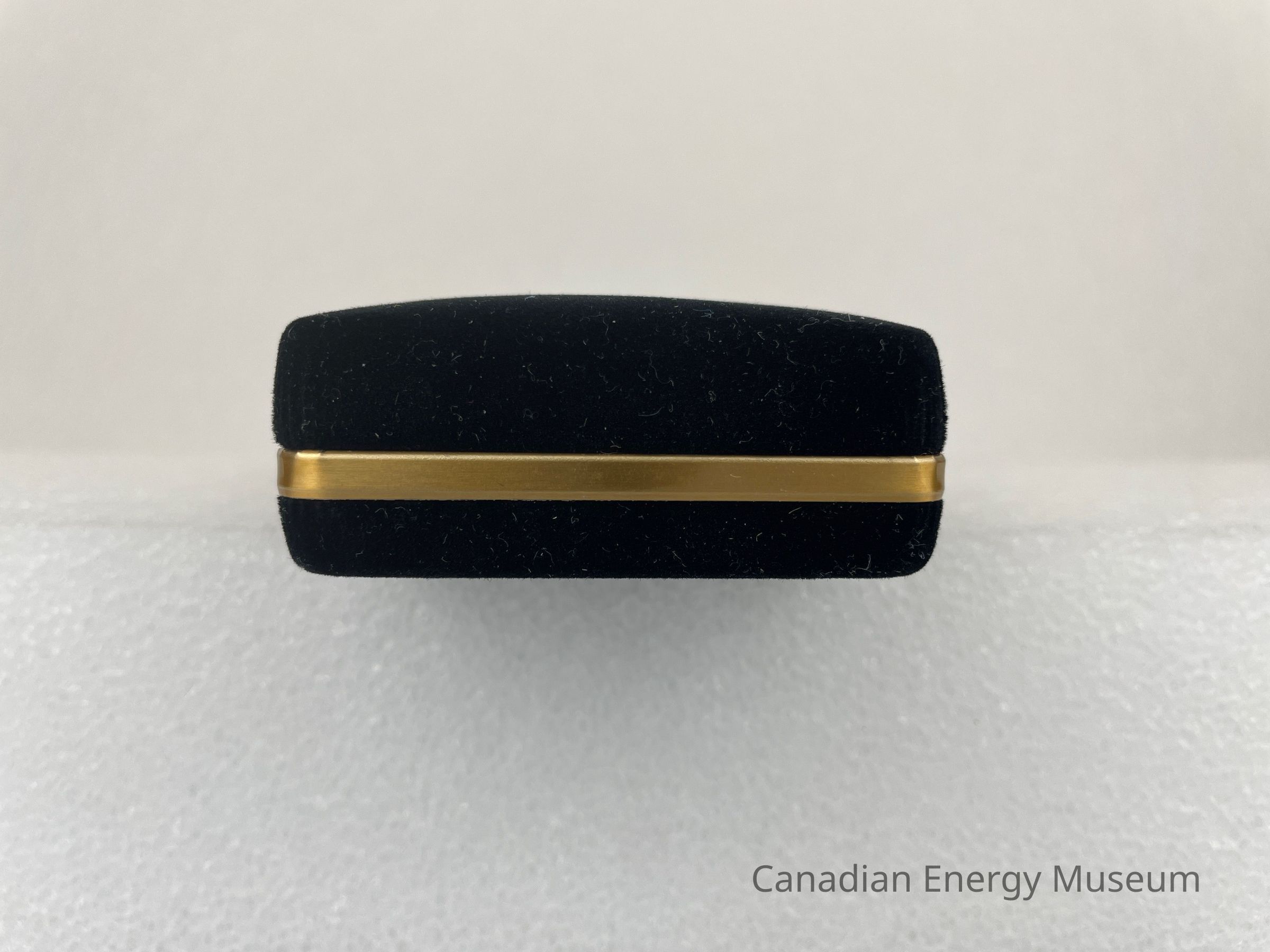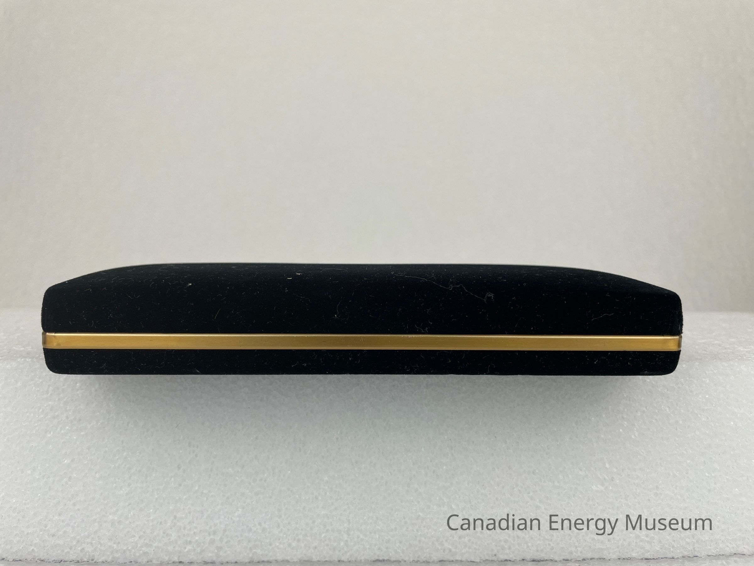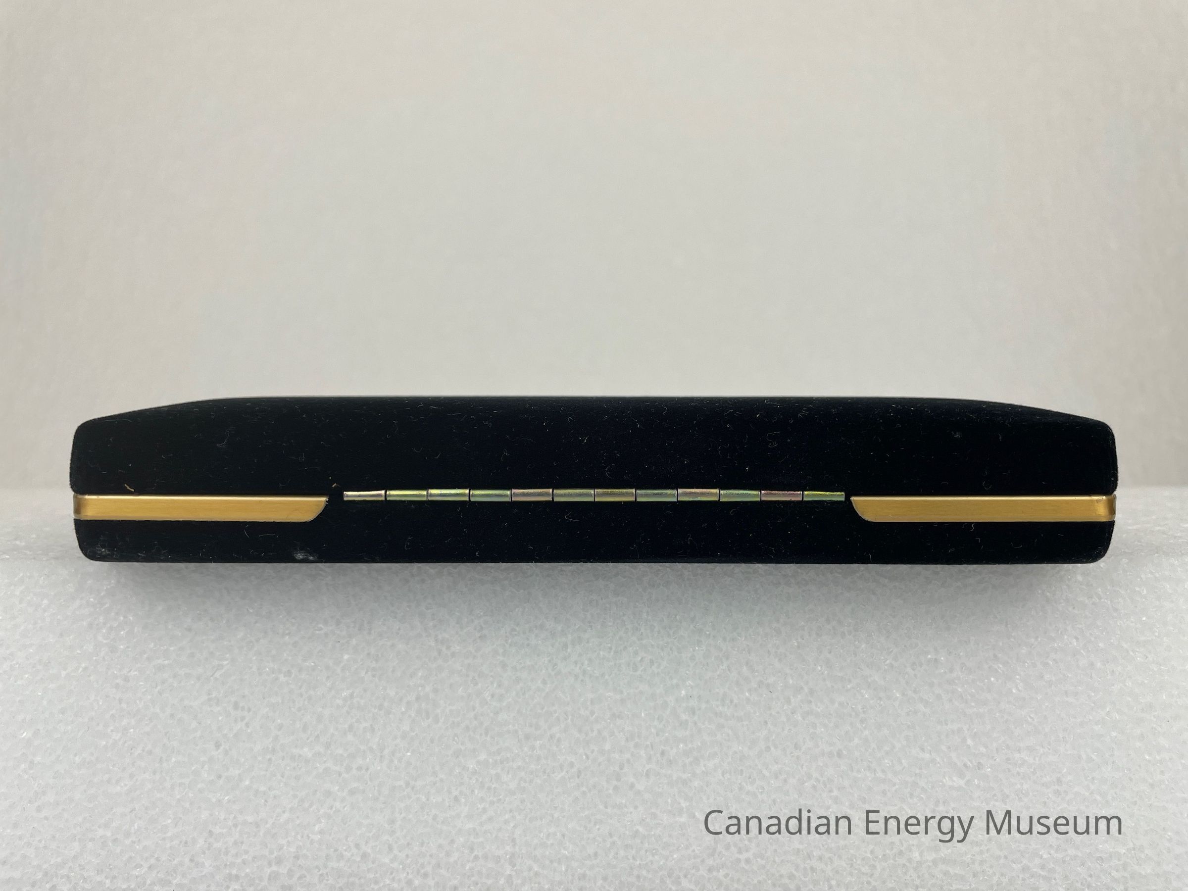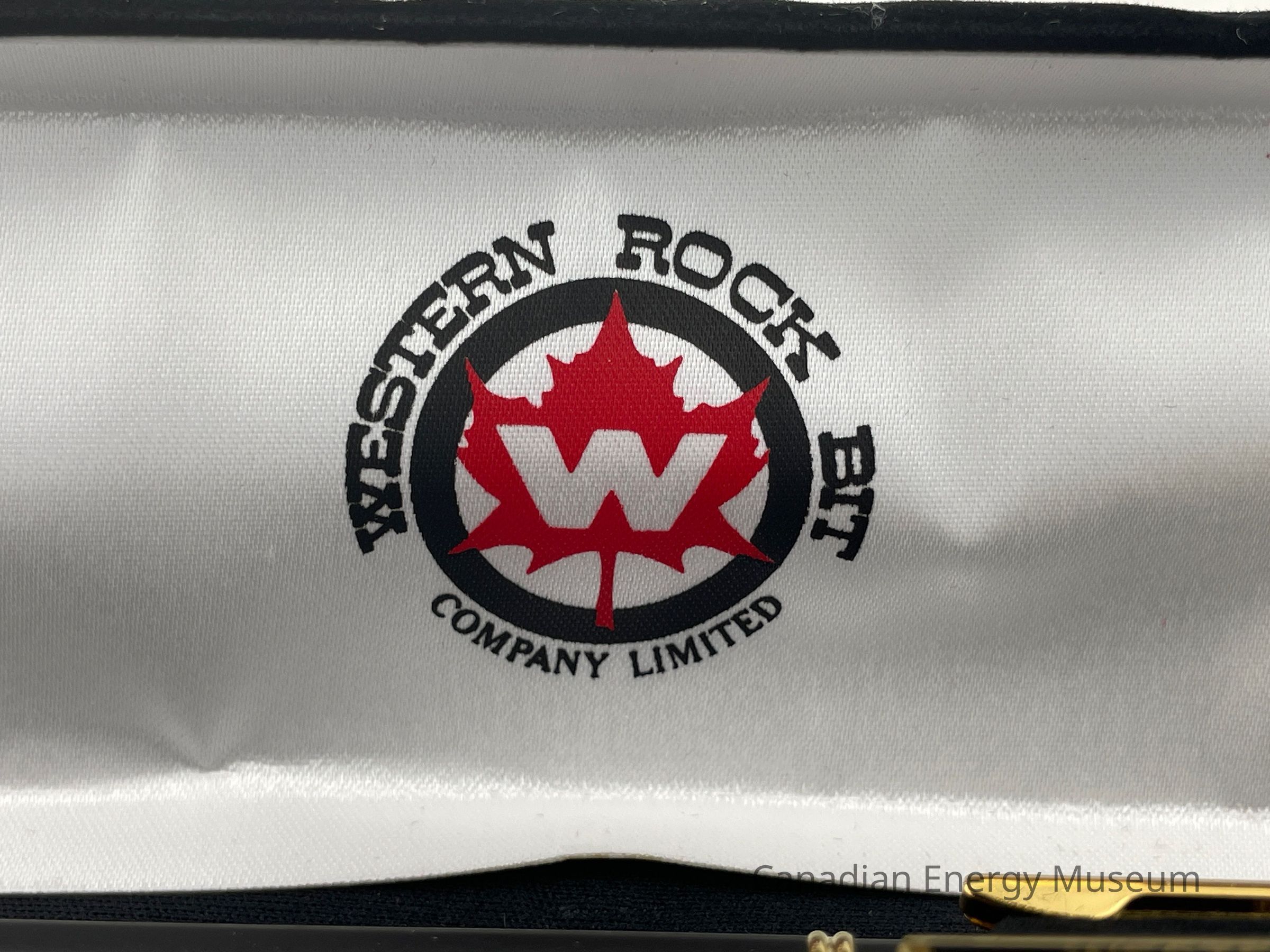 The case is a long, rectangular, black, velvet case. Along the edge of the bottom case is a gold band. The interior of the lid is covered in a white satin fabric with the Western Rock Bit logo displayed in the centre. The bottom of the case interior is flat, black velvet with a velvet, angled band of fabric for the pen and pencil to clip onto.Collection