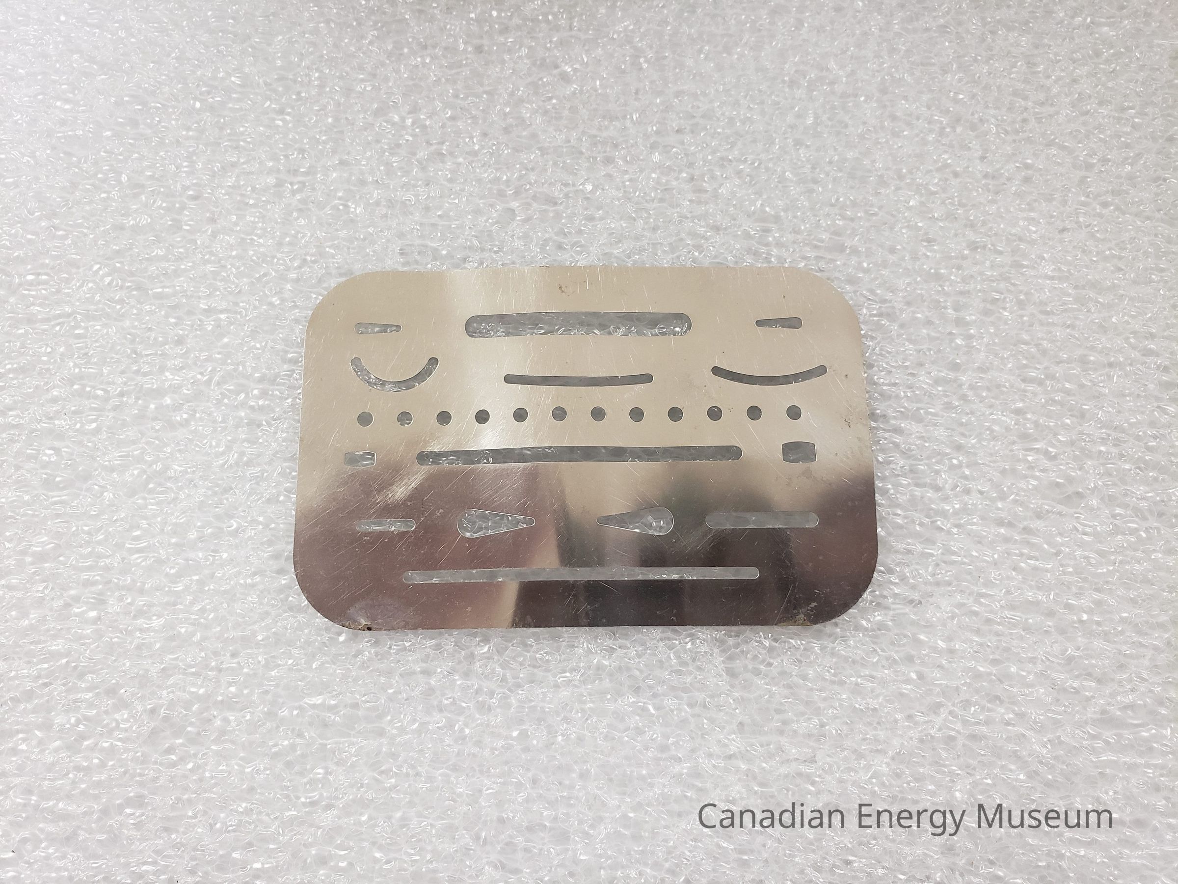 A small thin metal rectangle with curved corners,that appears to be a stencil. Has assorted shapes cut out.Collection