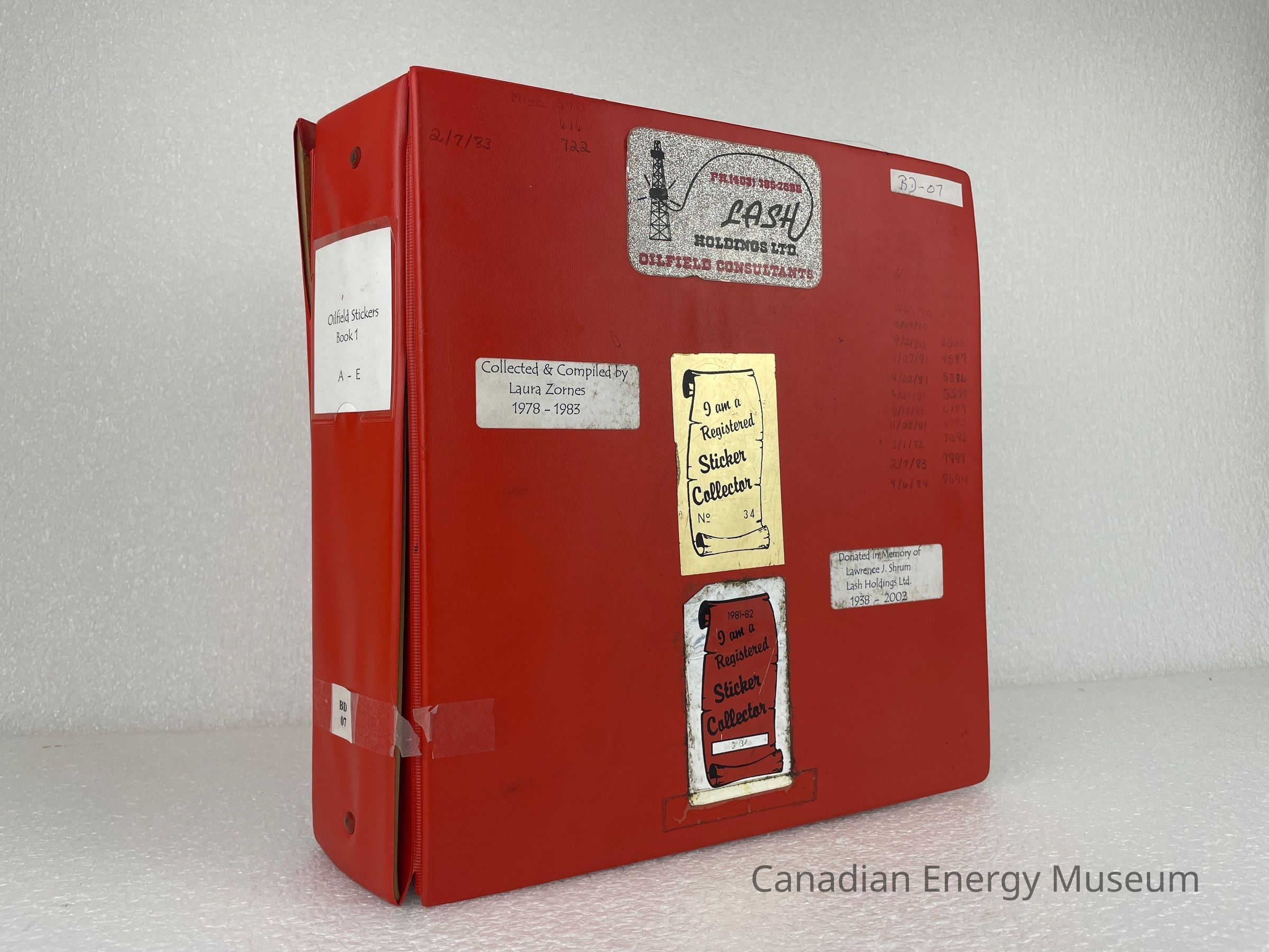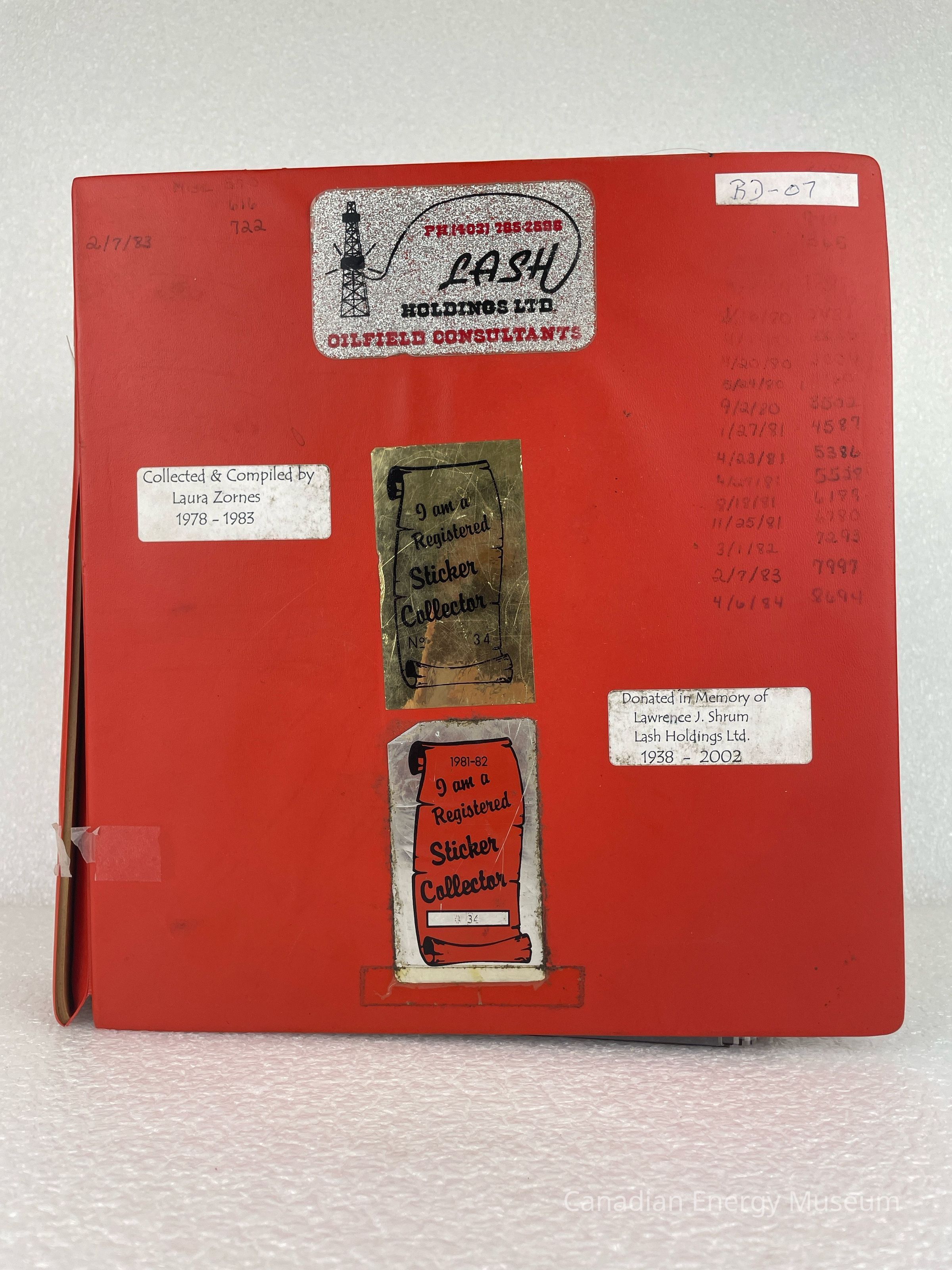 A red binder filled with 109 sheets filled with assorted stickers, double-sided. The front of the binder displays three stickers running down the middle; the top sticker is branded for Lash Holdings Ltd., the middle sticker is gold with black text reading, "I am a Registered Sticker Collector", and the bottom sticker is silver with a red scroll and the same black text as the middle sticker. Two white labels are placed on the front. The first is to the left of the stickers with black text reading, "Collected & Compiled by Laura Zornes 1978-1983", and the label to the right reads, "Donated in memory of Lawrence J. Shrum Lash Holdings Ltd. 1938-2002". The front also displays rows of handwriting in black ink. The spine of the binder displays a square white label held within a clear plastic holder. The label displays black text reading, "Oilfield Stickers Book 1 A-E".