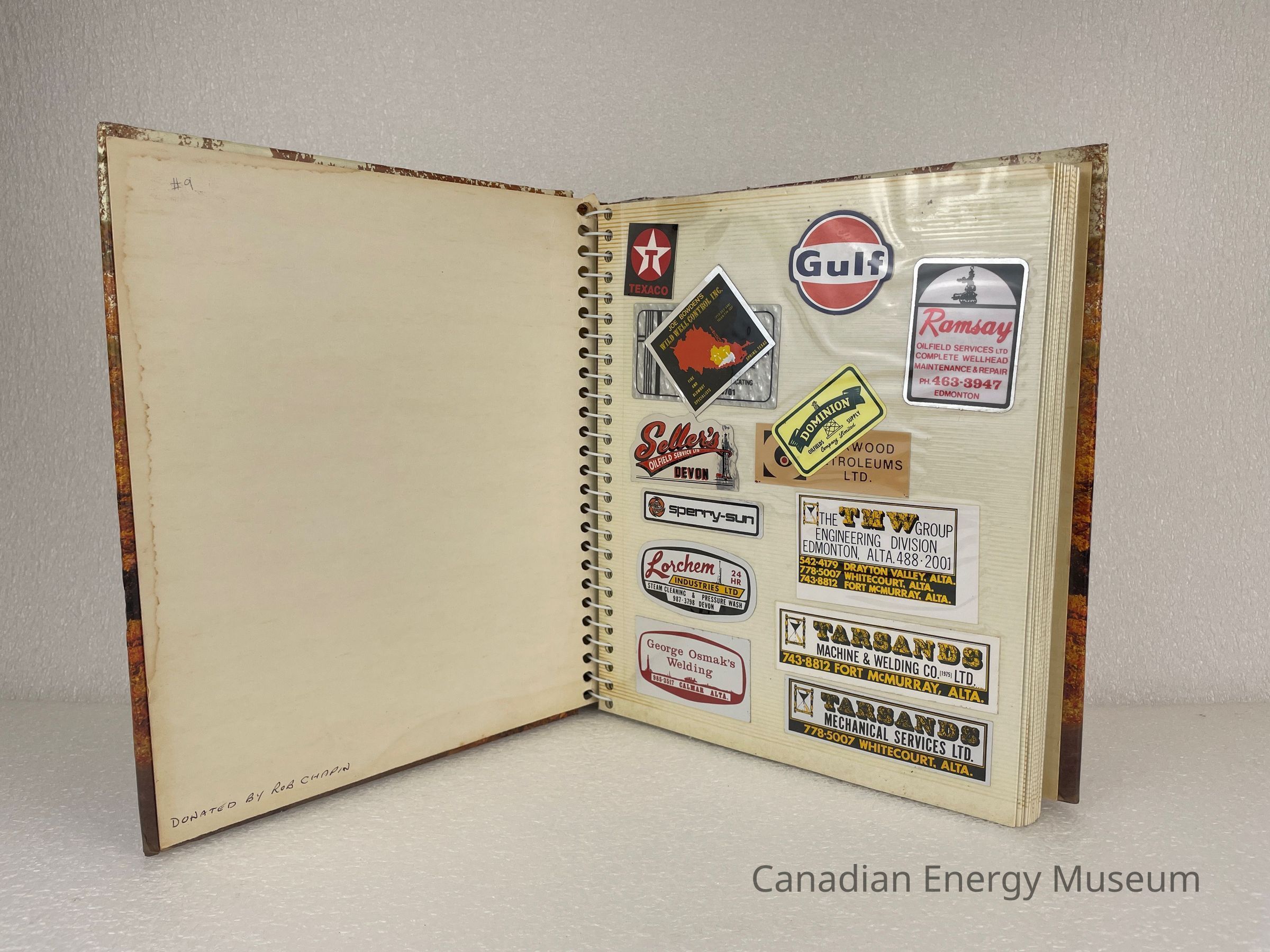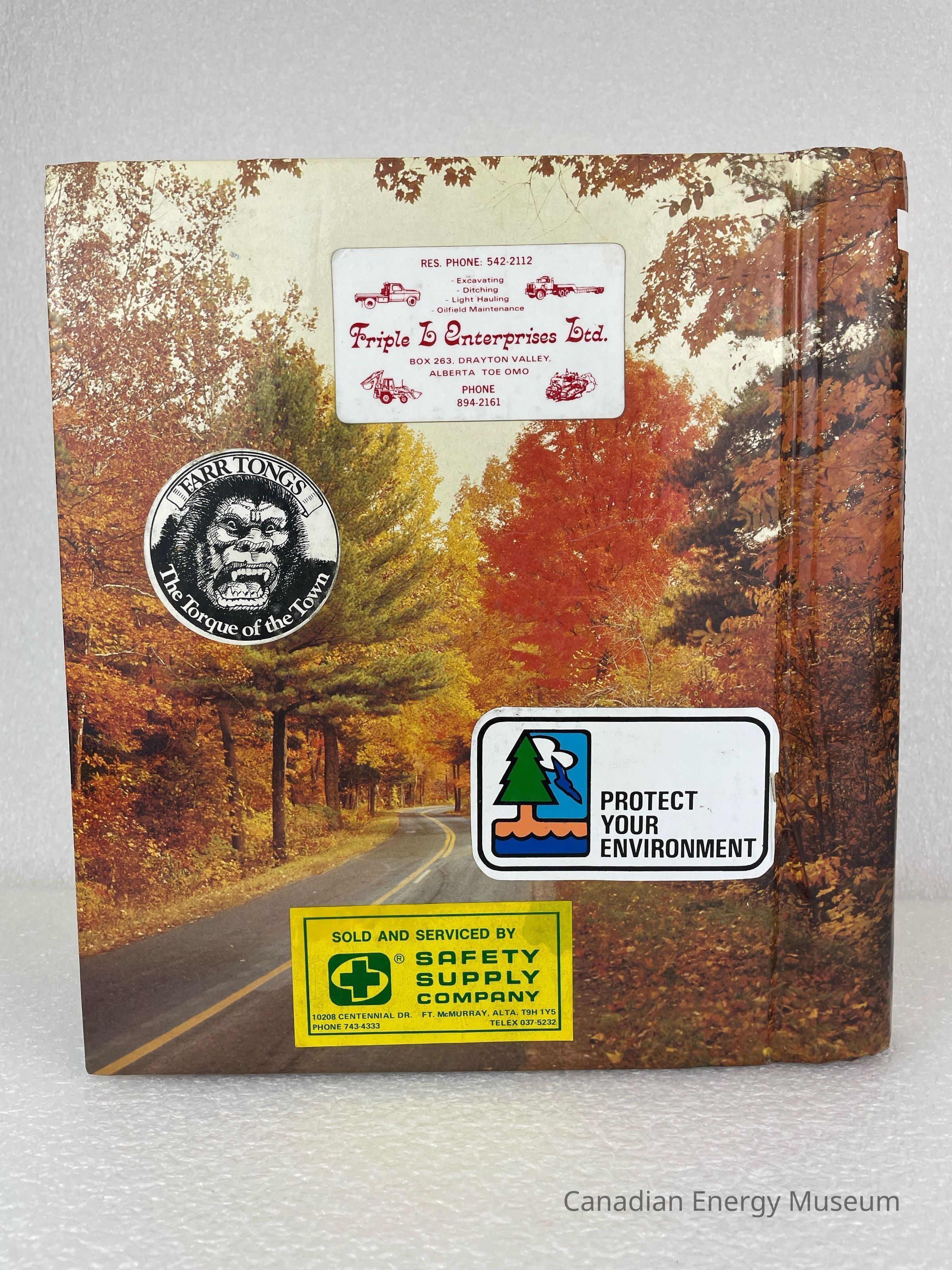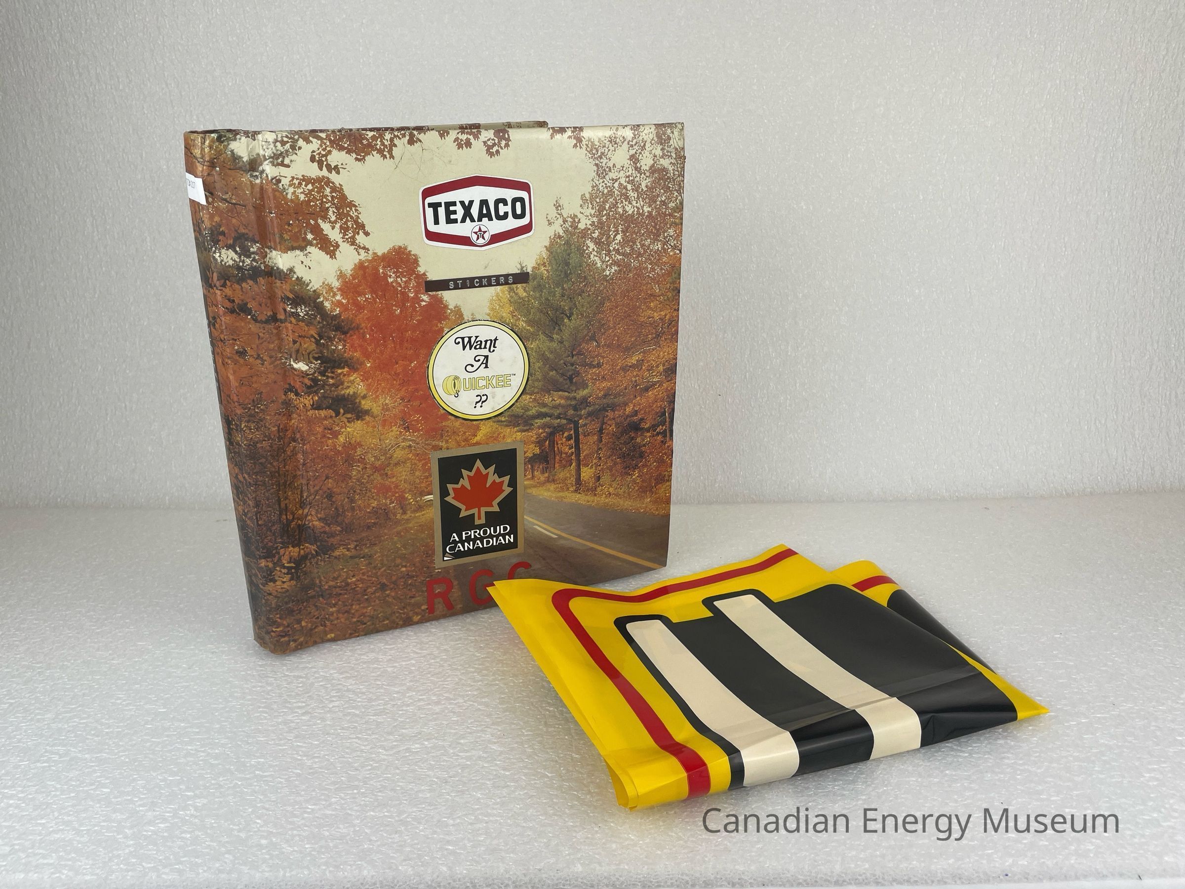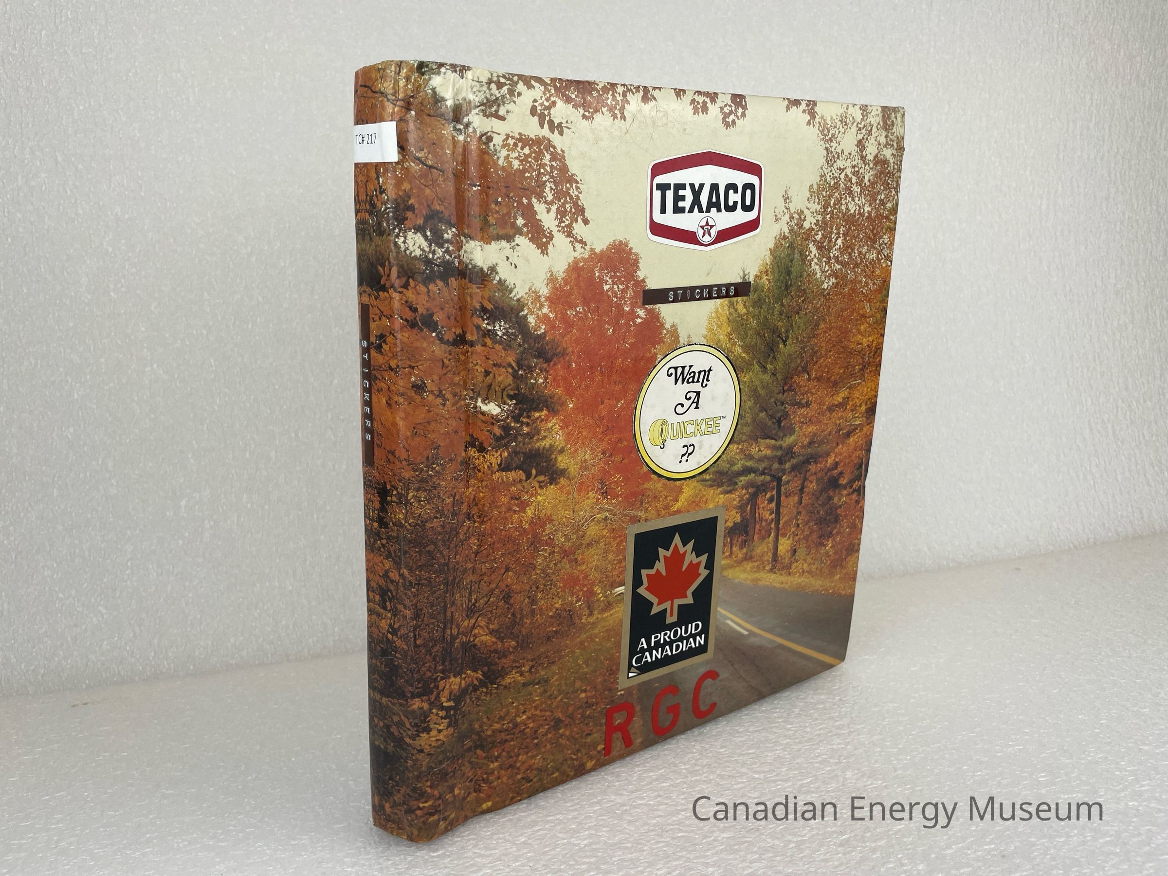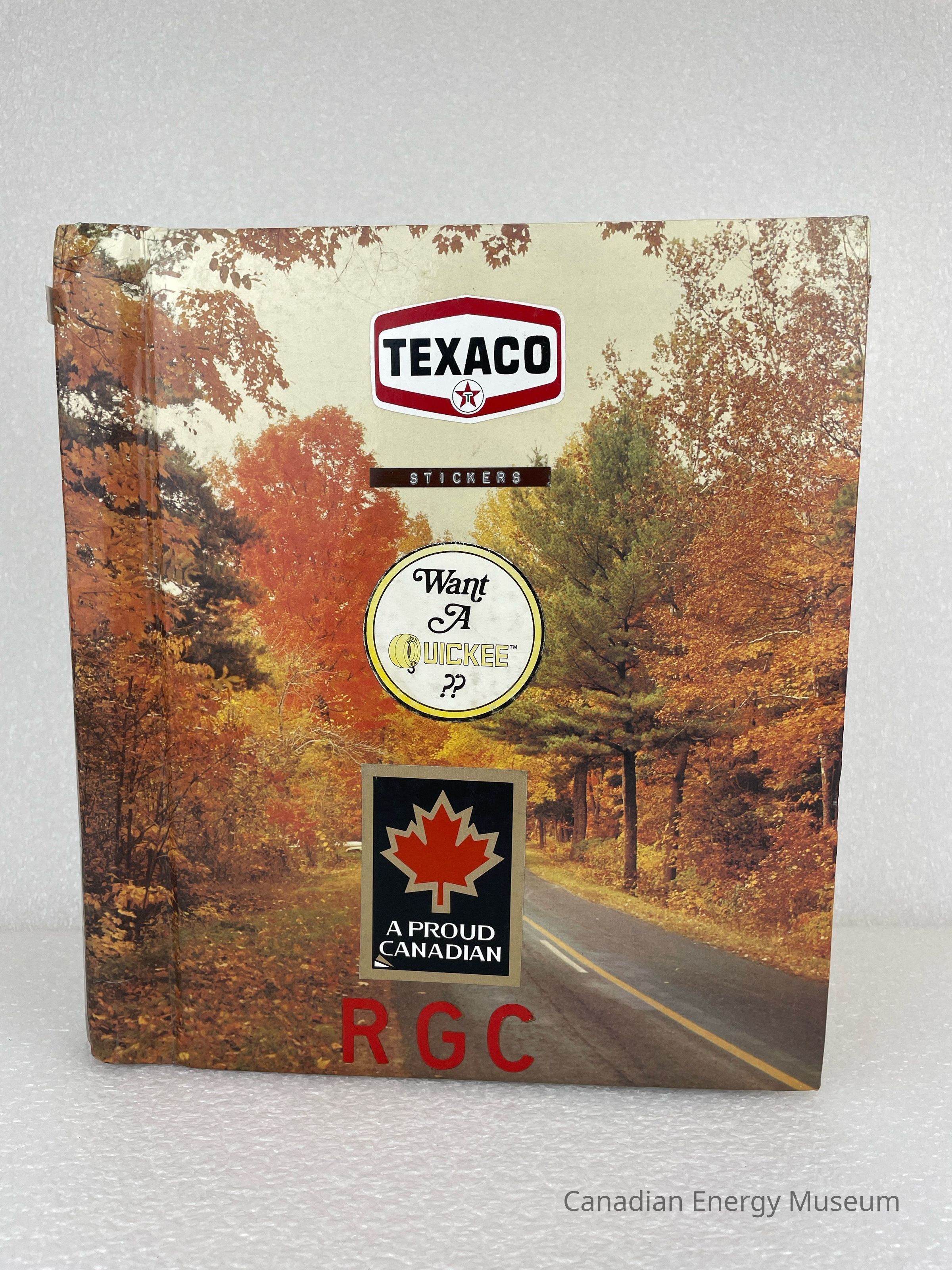 A photo album of assorted stickers. The cover is of a fall scenery with multi-coloured trees. The front cover features three stickers branded for Texaco, Want A Quickee, and A Proud Canadian. At the bottom of the front are three letter stickers spelling "RGC" and near the top, underneath the Texaco sticker, is a brown label with debossed white text reading "STICKERS". The back cover displays four stickers branded for Triple L Enterprises Ltd., FARR Tongs, Protect Your Environment, and Safety Supply Company. A plastic sign is folded and kept at the back of the album. It is a bright yellow with black and red text branded for Auto Meter Completion Instruments. Inside are 20 sheets, double-sided with assorted stickers, and held by a white coil.Collection