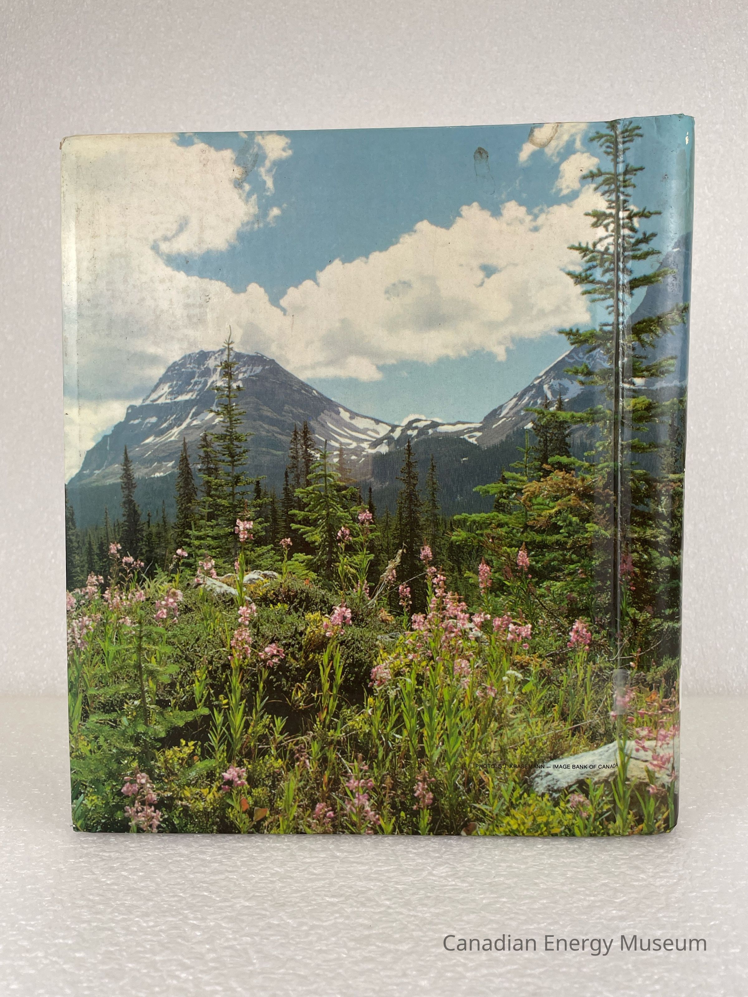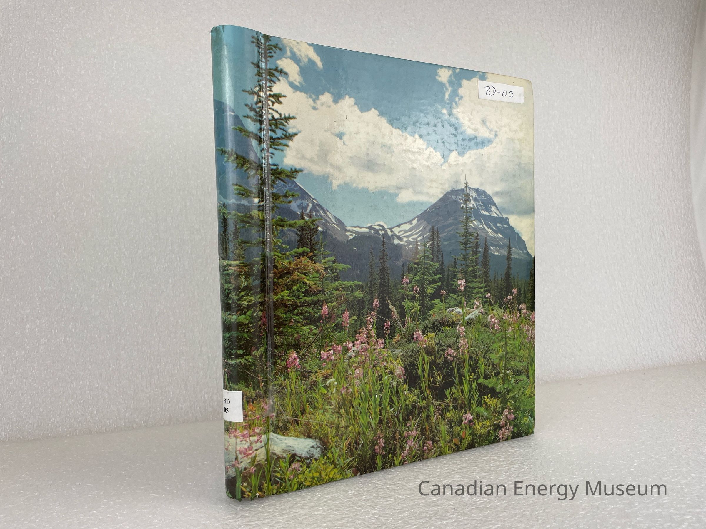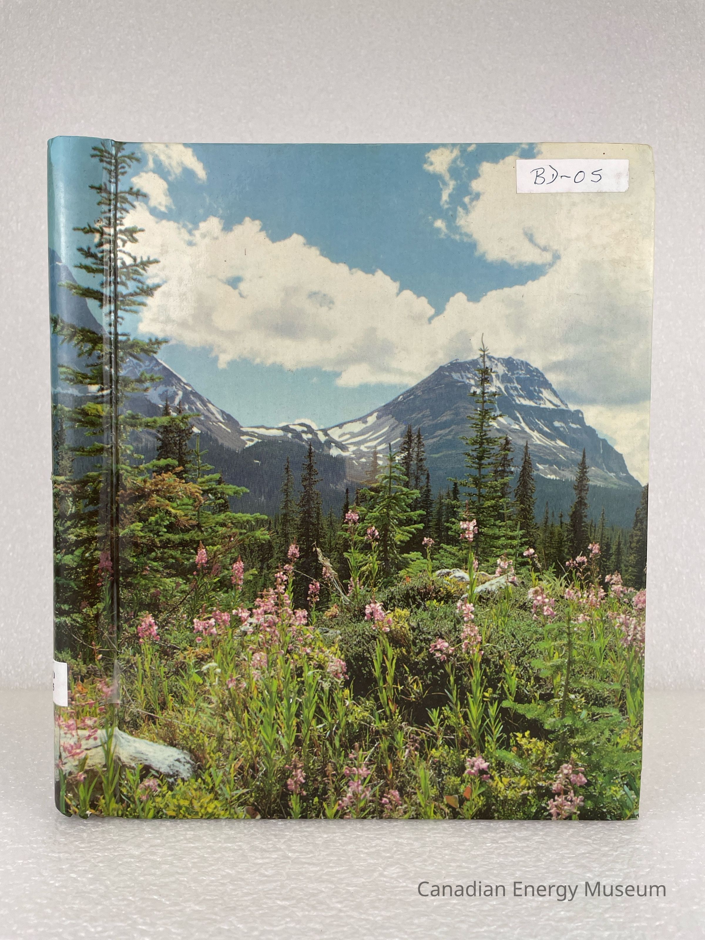 A photo album of assorted photographs and stickers. The cover features an image of a rocky mountain scene with greenery, trees, and pink flowers. 6 sheets are held within a white metal coiled binding. The inside cover displays a black stamp reading, "THIS BOOK BELONGS TO C.P.I.C." and handwriting in black pen reading, "Donated by: Bill Schurer".Collection