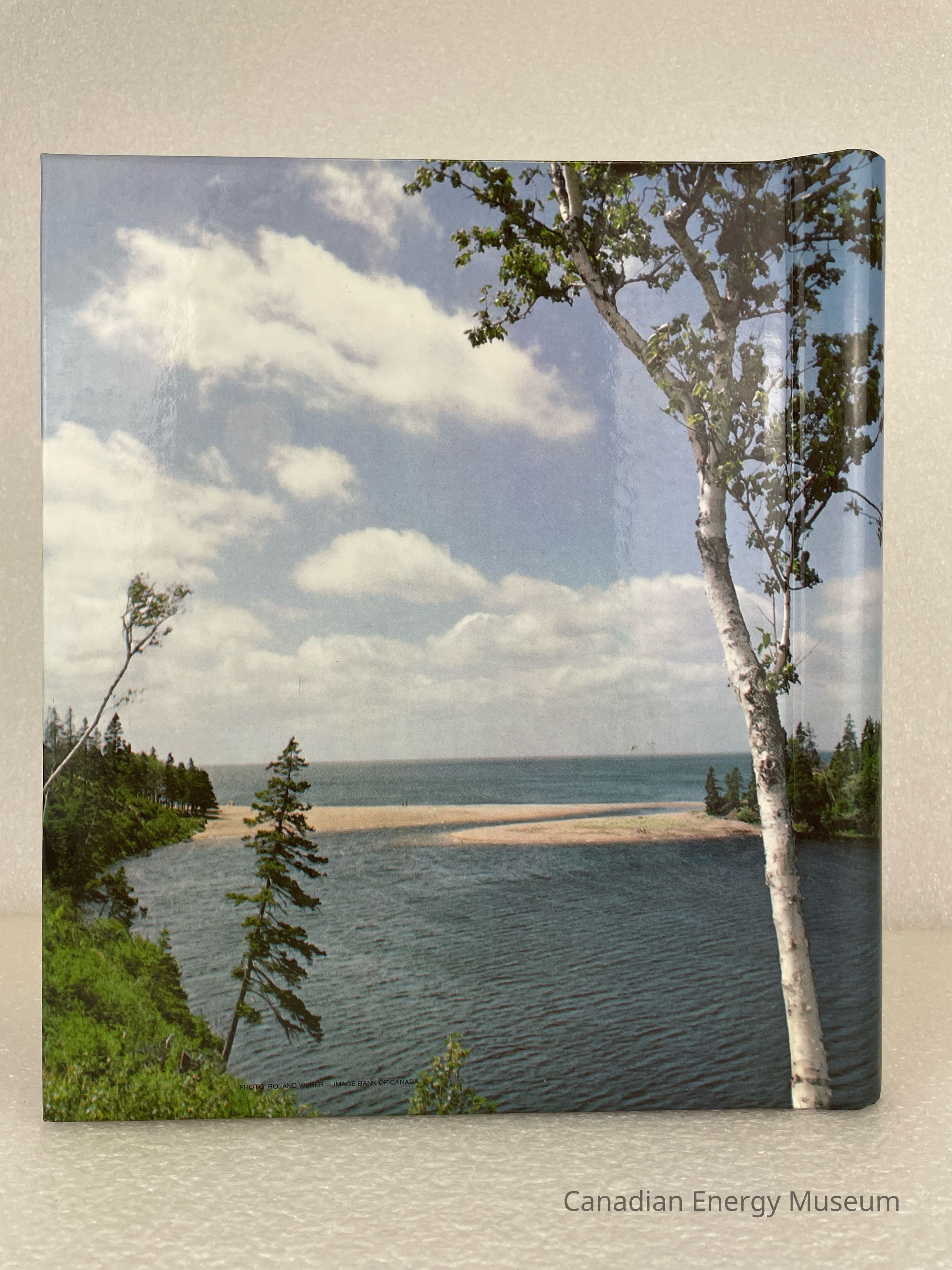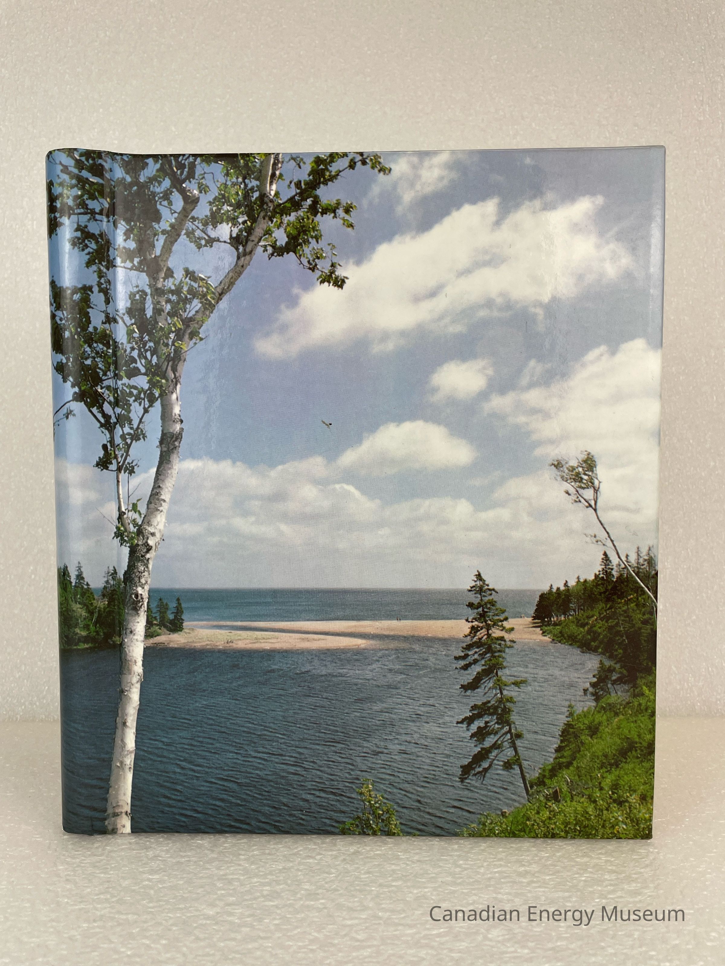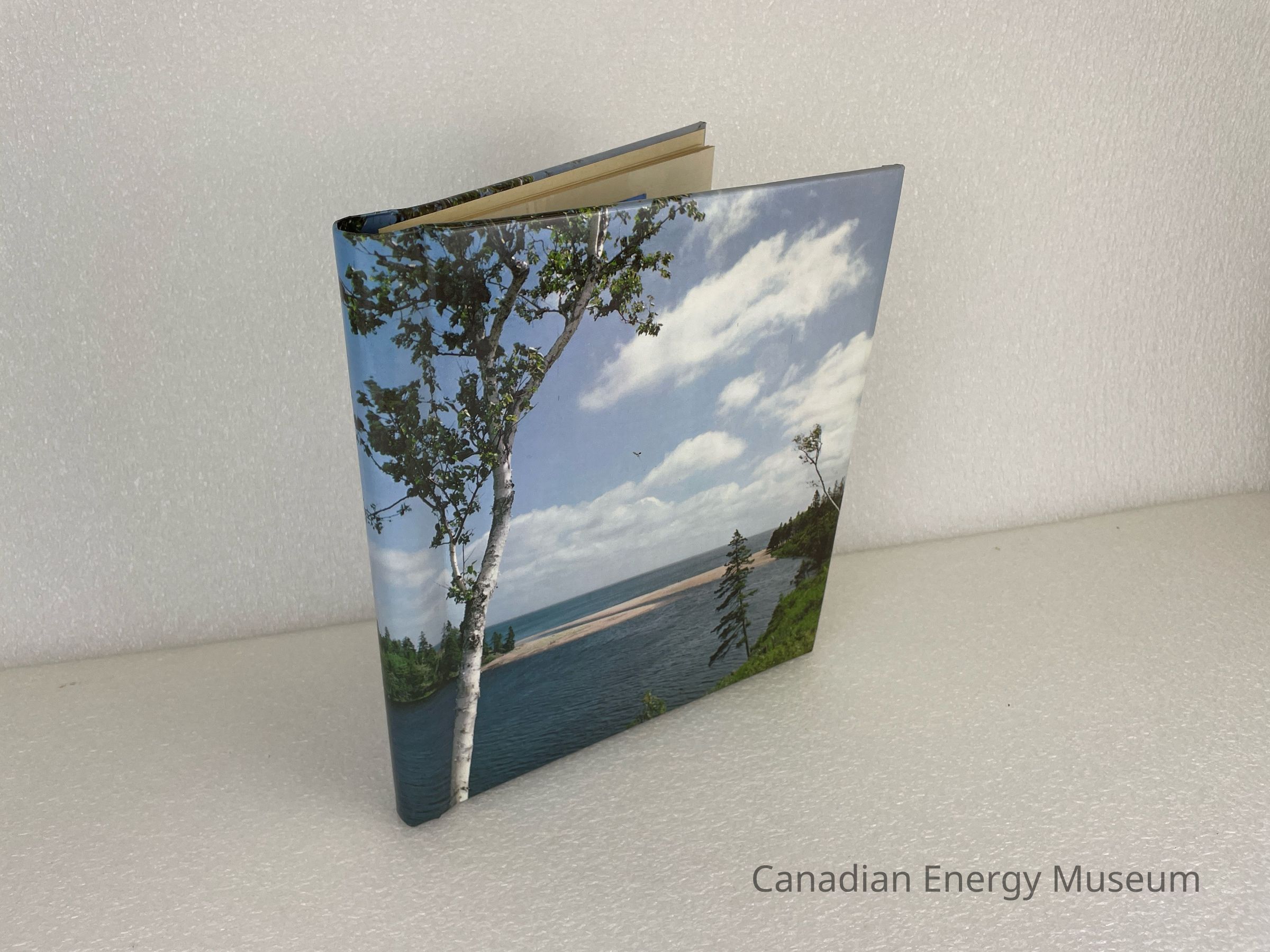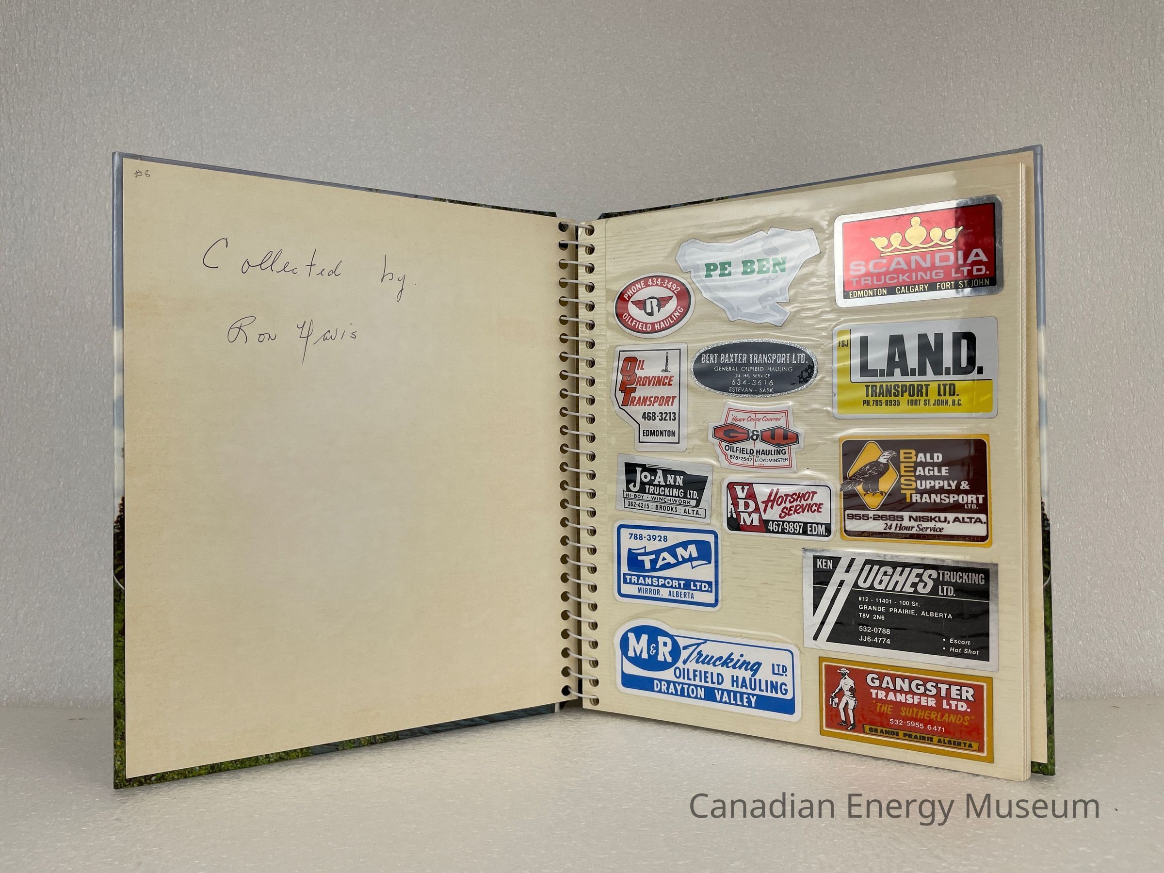 A photo album of assorted stickers. The cover is of a beach scene with trees and water. The inside cover displays handwriting in pencil reading, "Collected by Ron Davis". Inside are 6 sheets, double-sided with assorted stickers, and held by a white coil.Collection