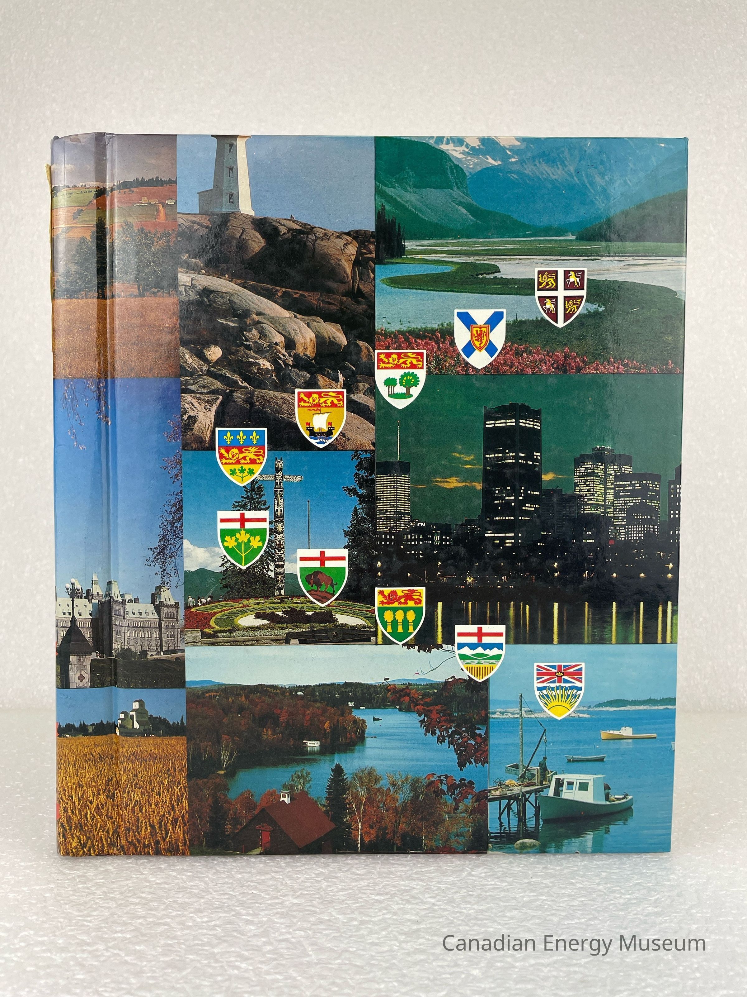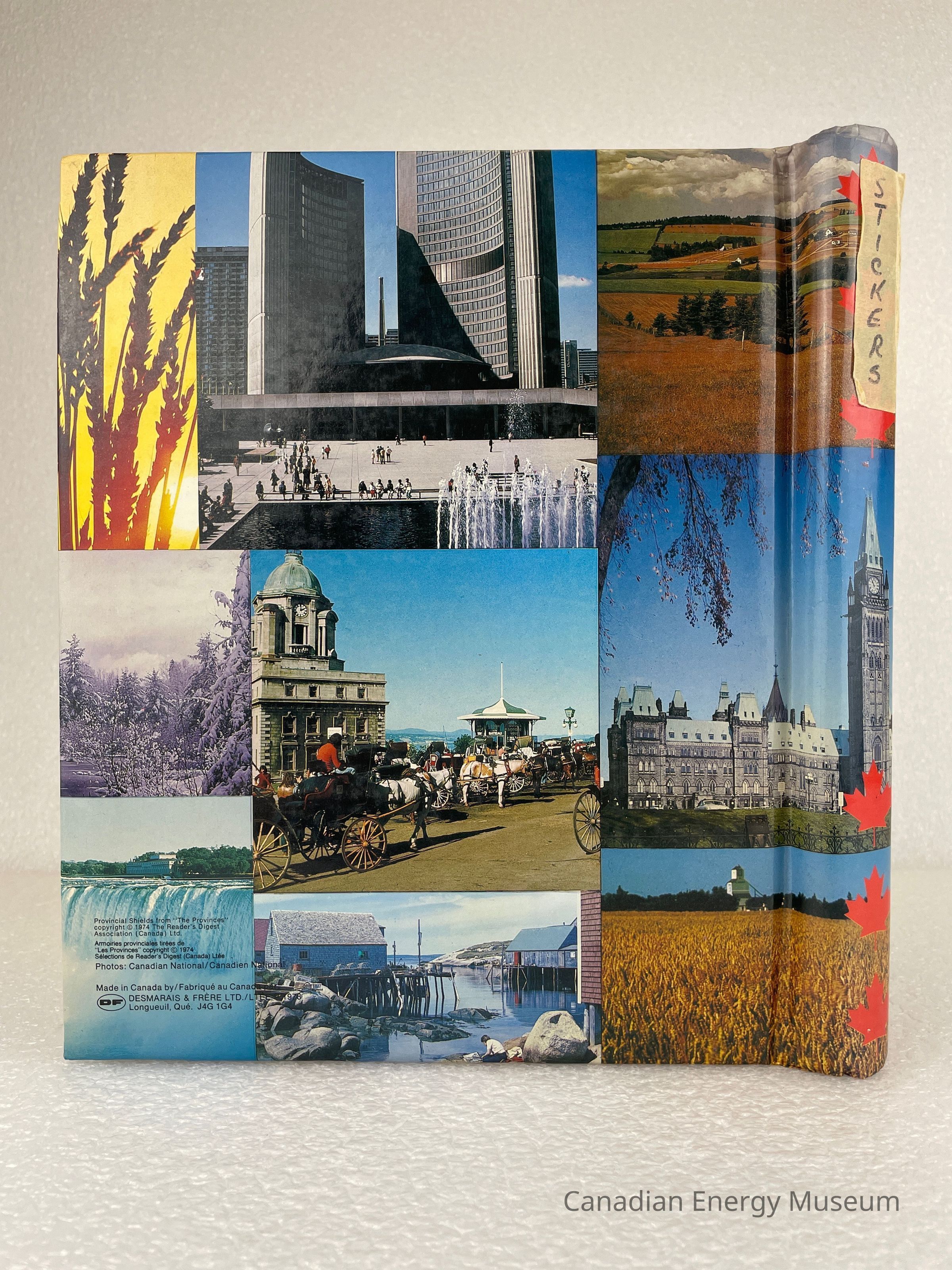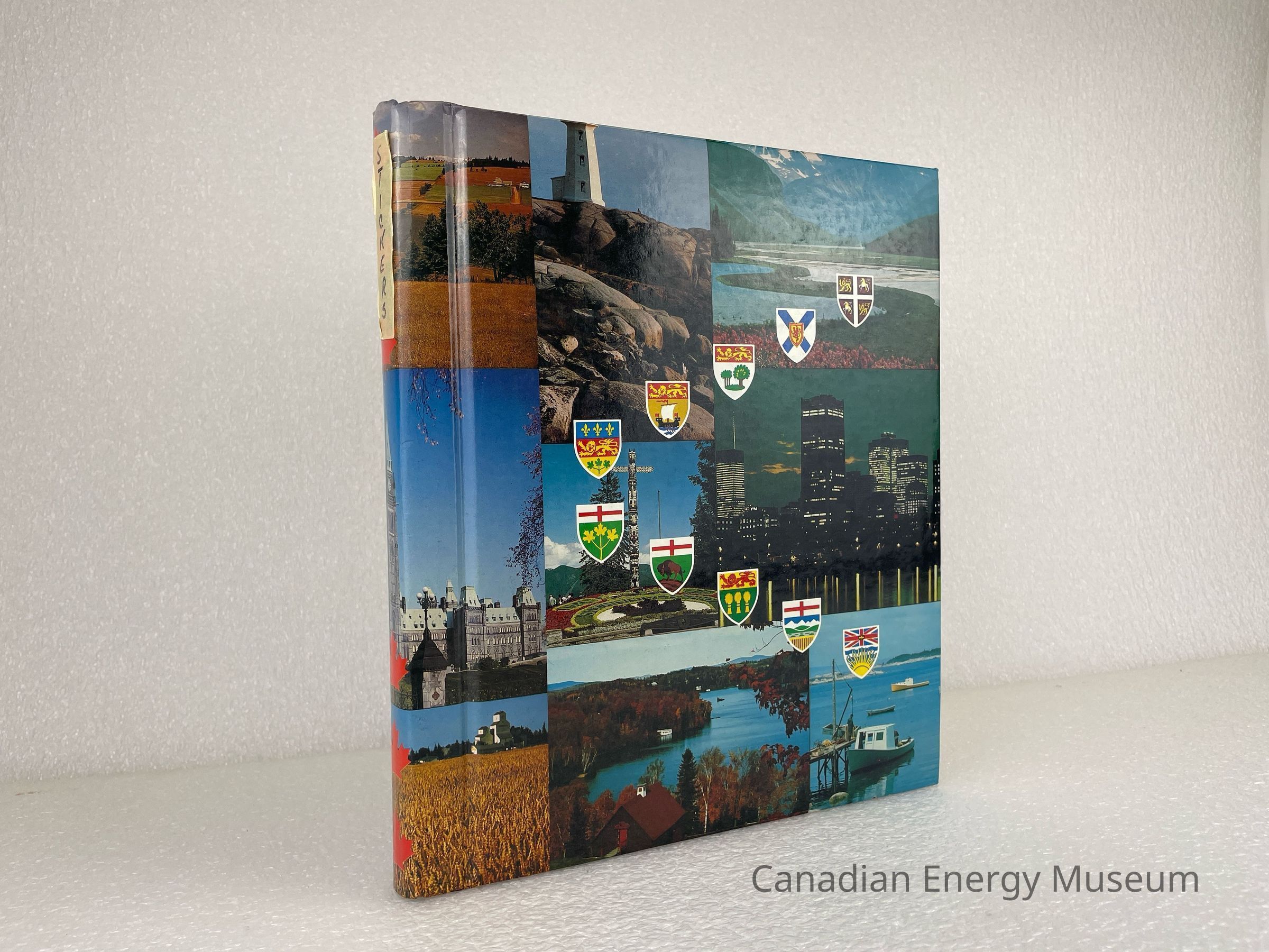 A photo album of assorted stickers. The cover features multiple photos of various places and things, with all ten crests of the Canadian provinces. A piece of masking tape with text written in Sharpie reading, "STICKERS", is placed at the top of the spine. 13 sheets are held within a white metal coiled binding. The inside cover displays a white label with black text reading, "Donated by Ross Golightly".Collection