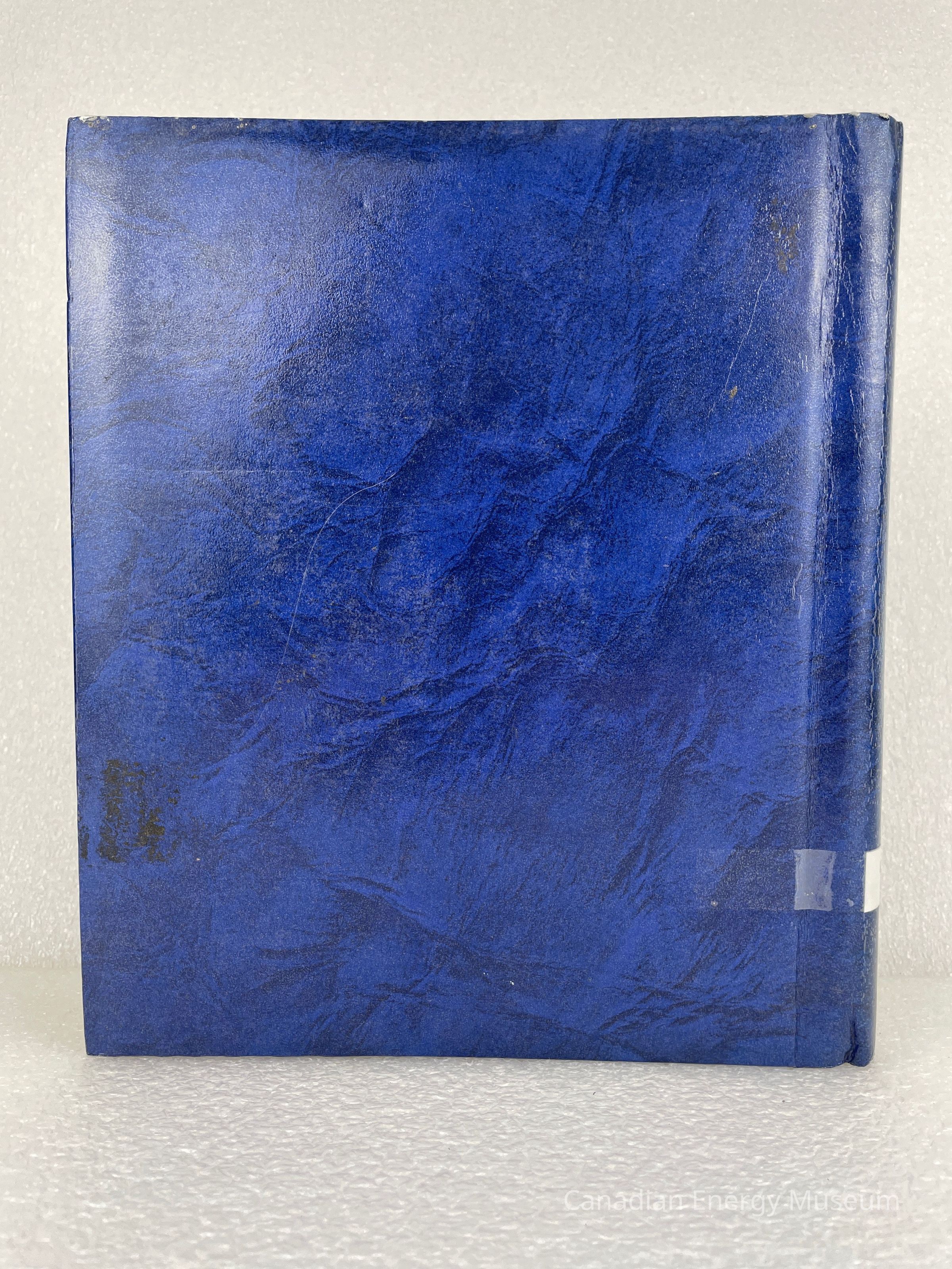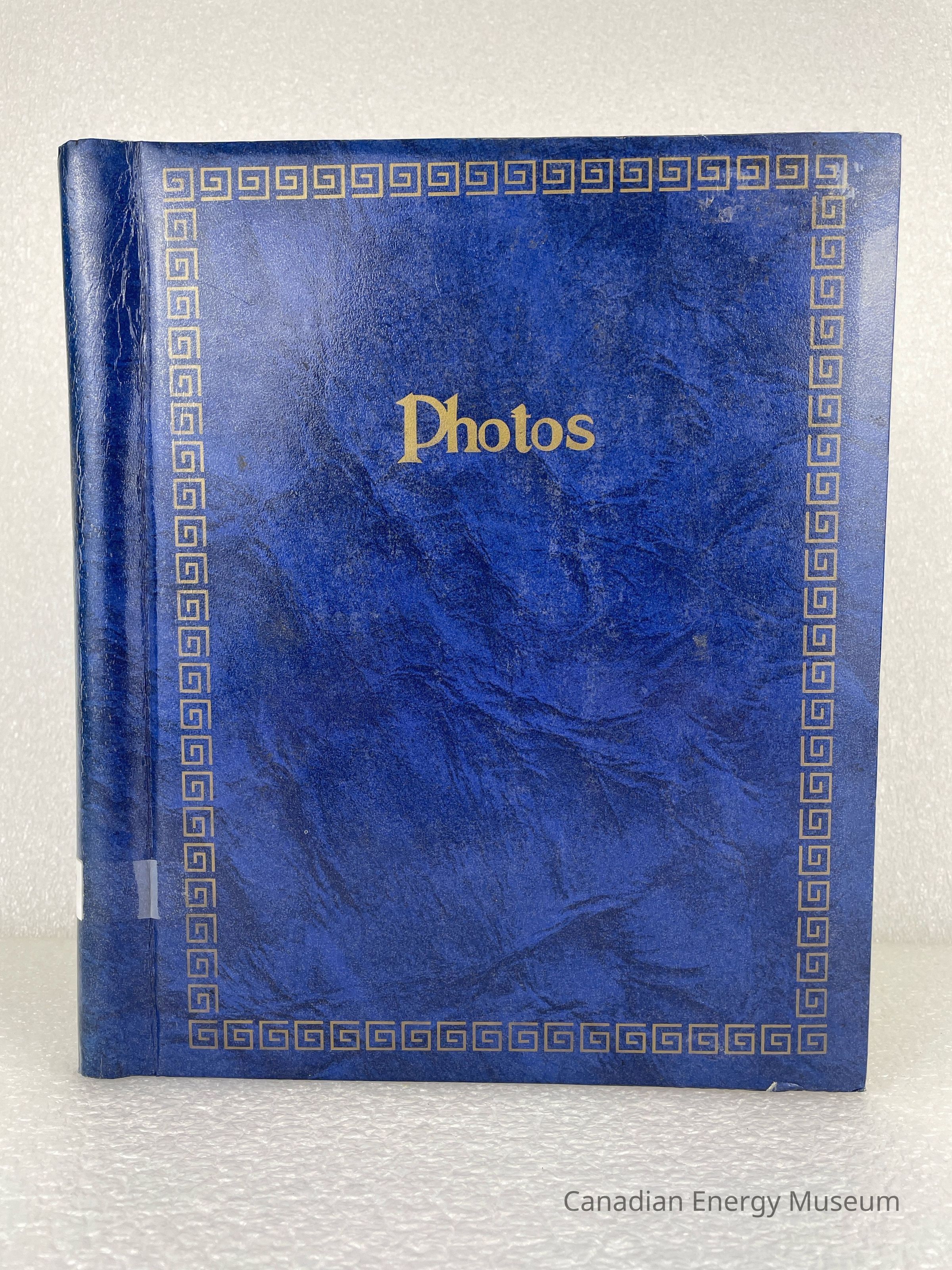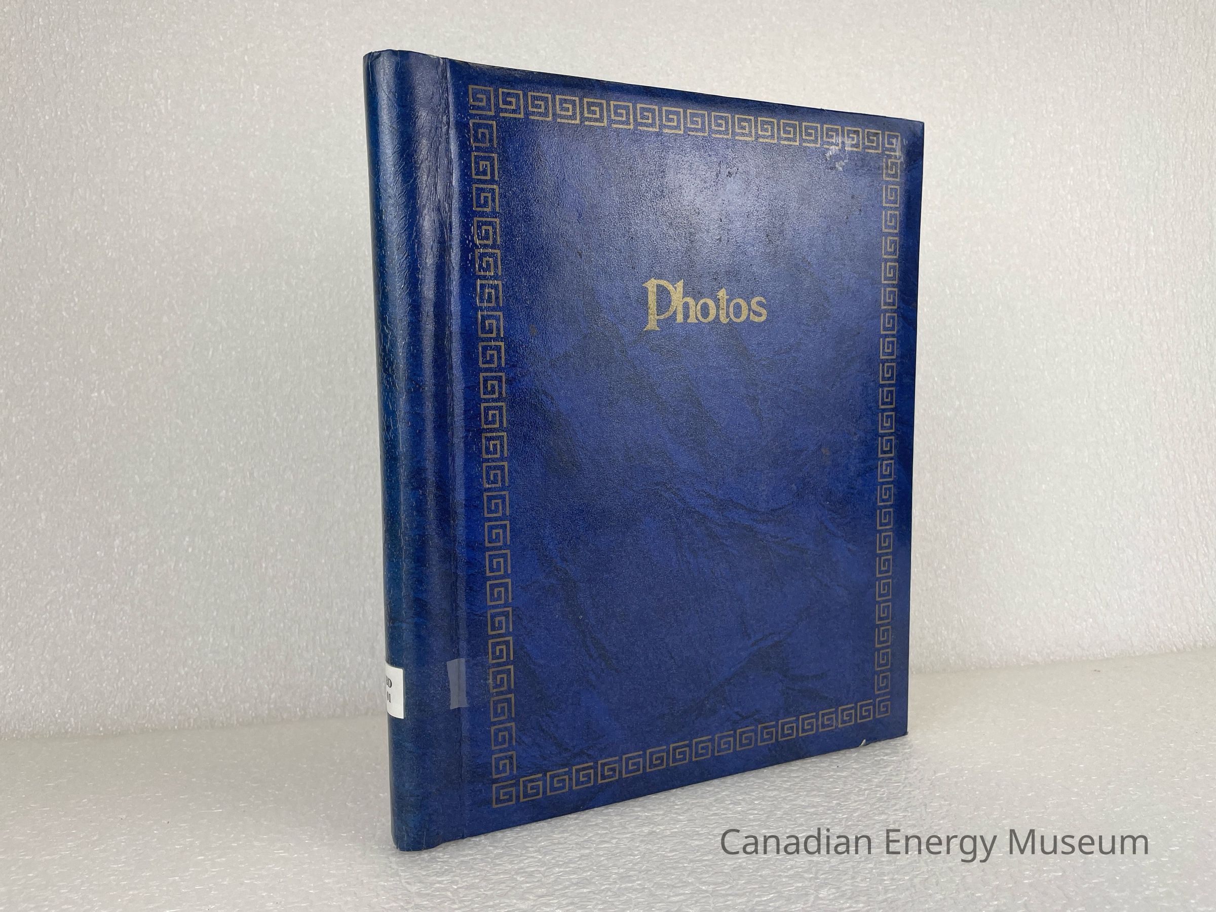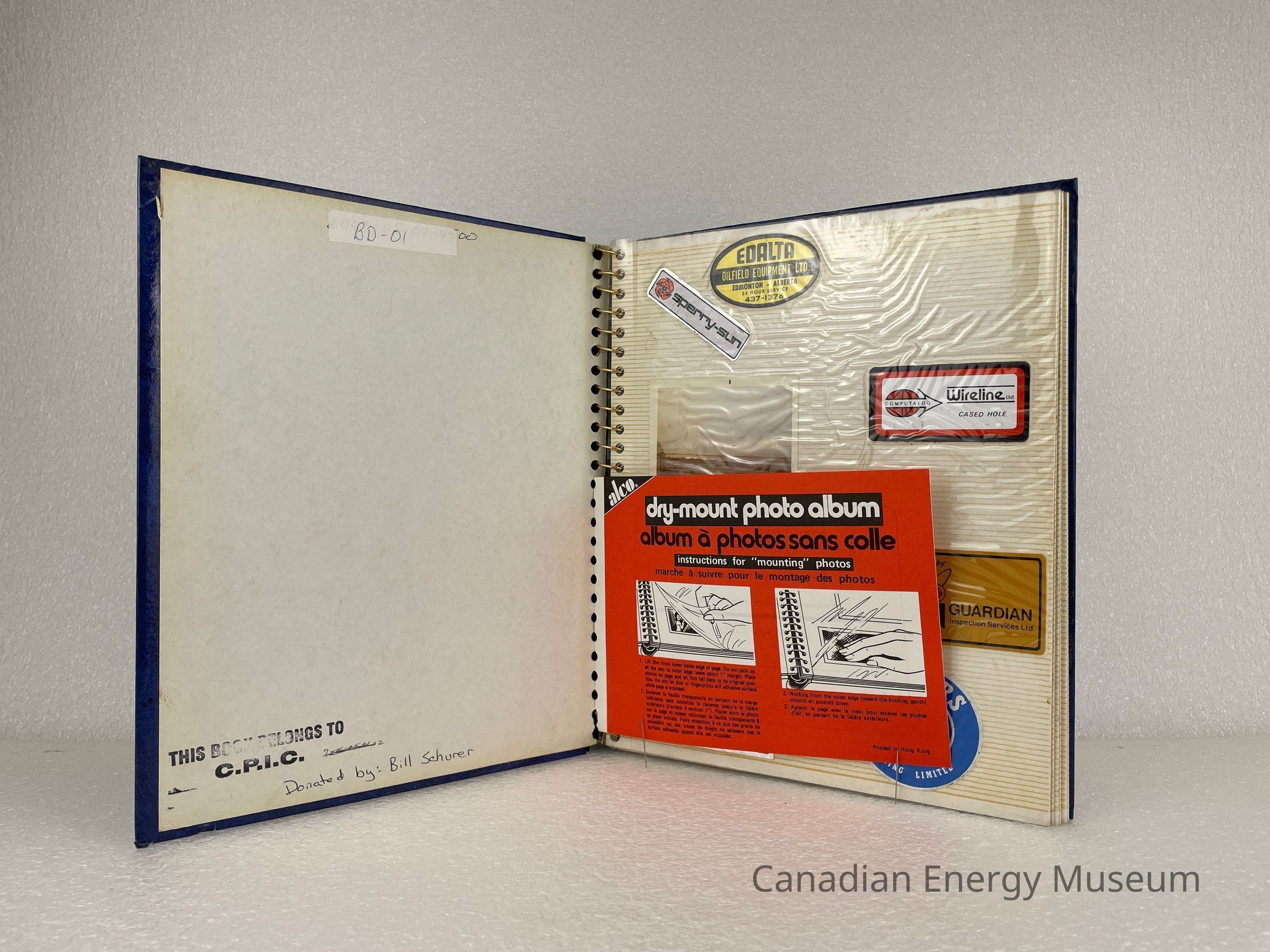 A photo album of assorted stickers. The cover is dark blue with gold text on the front reading, "Photos", and gold geometric shapes create a border. 10 sheets are held within a gold metal coiled binding. The inside cover displays a black stamp reading, "THIS BOOK BELONGS TO C.P.I.C." and handwriting in black pen reading, "Donated by: Bill Schurer". There is an insert before the first sheet with an orange-red background and black text that explains how to use the album.Collection