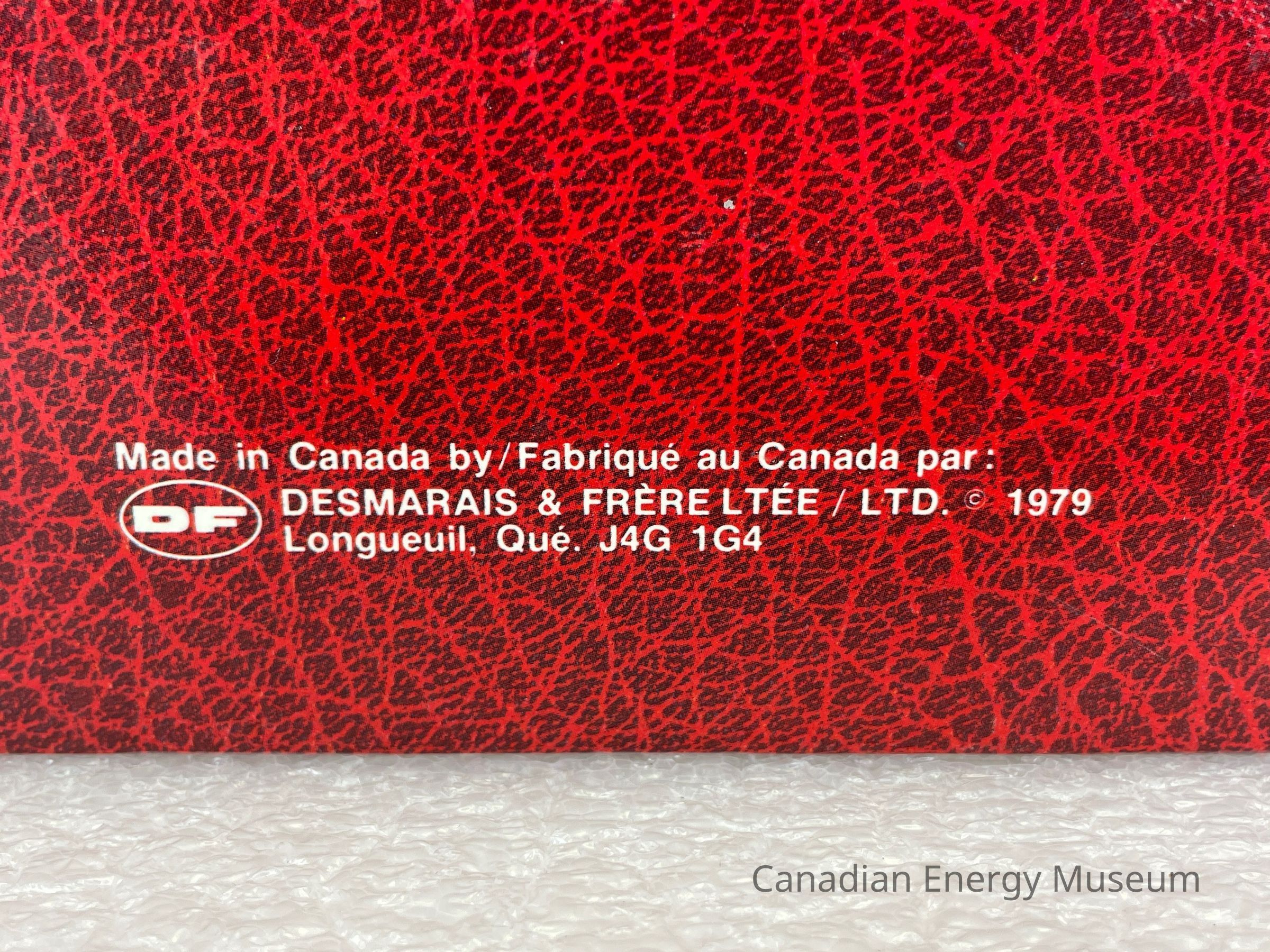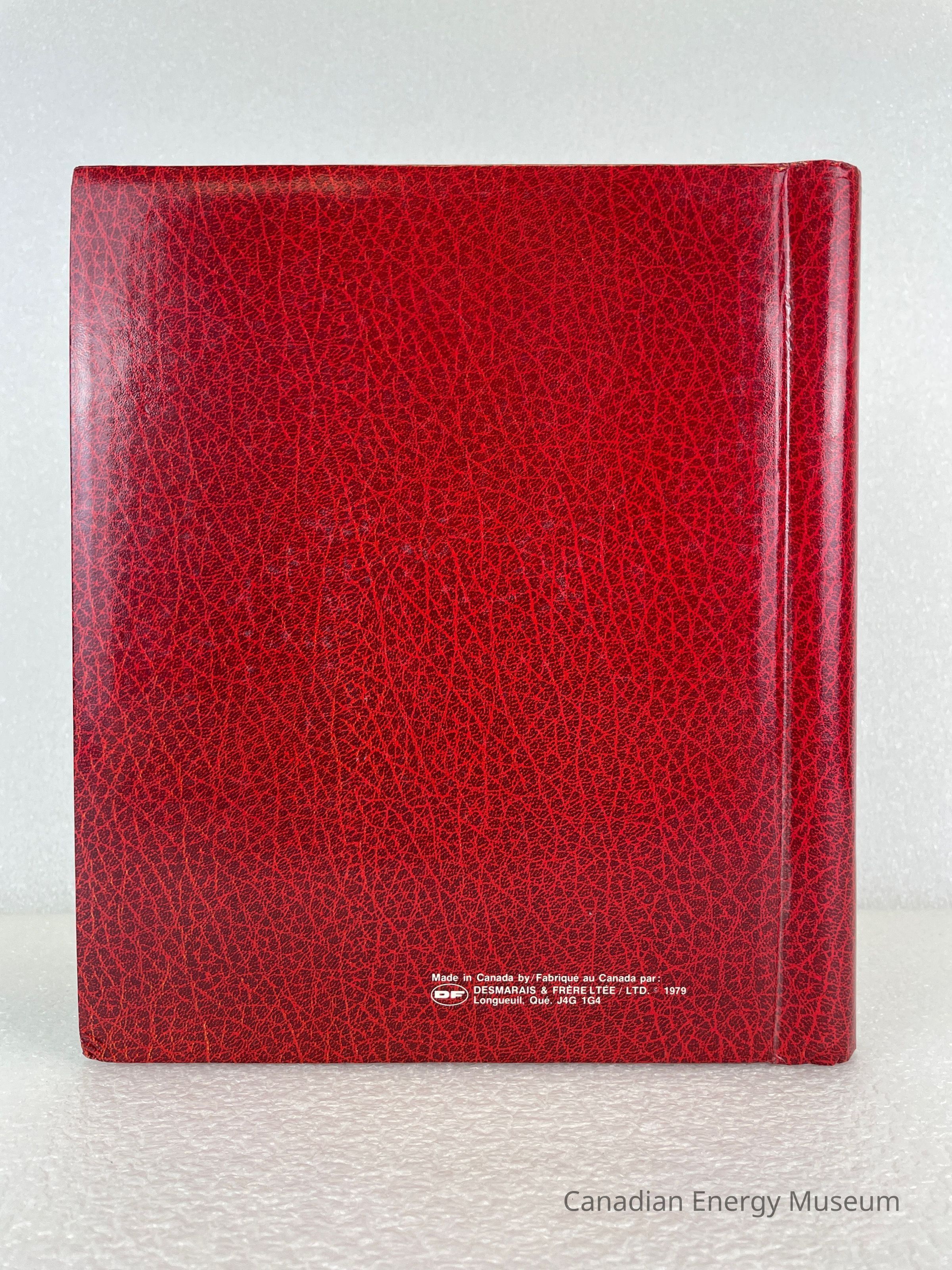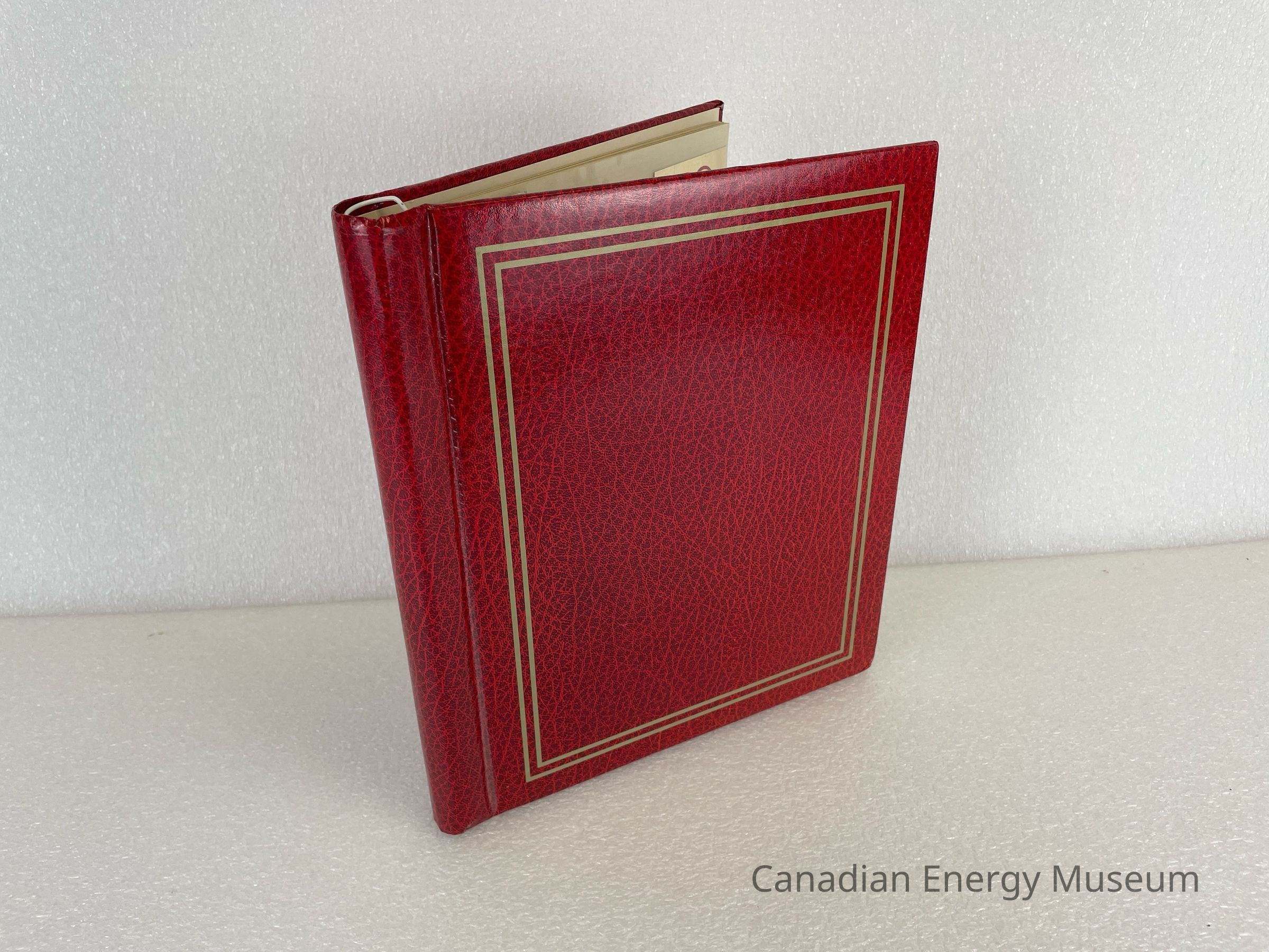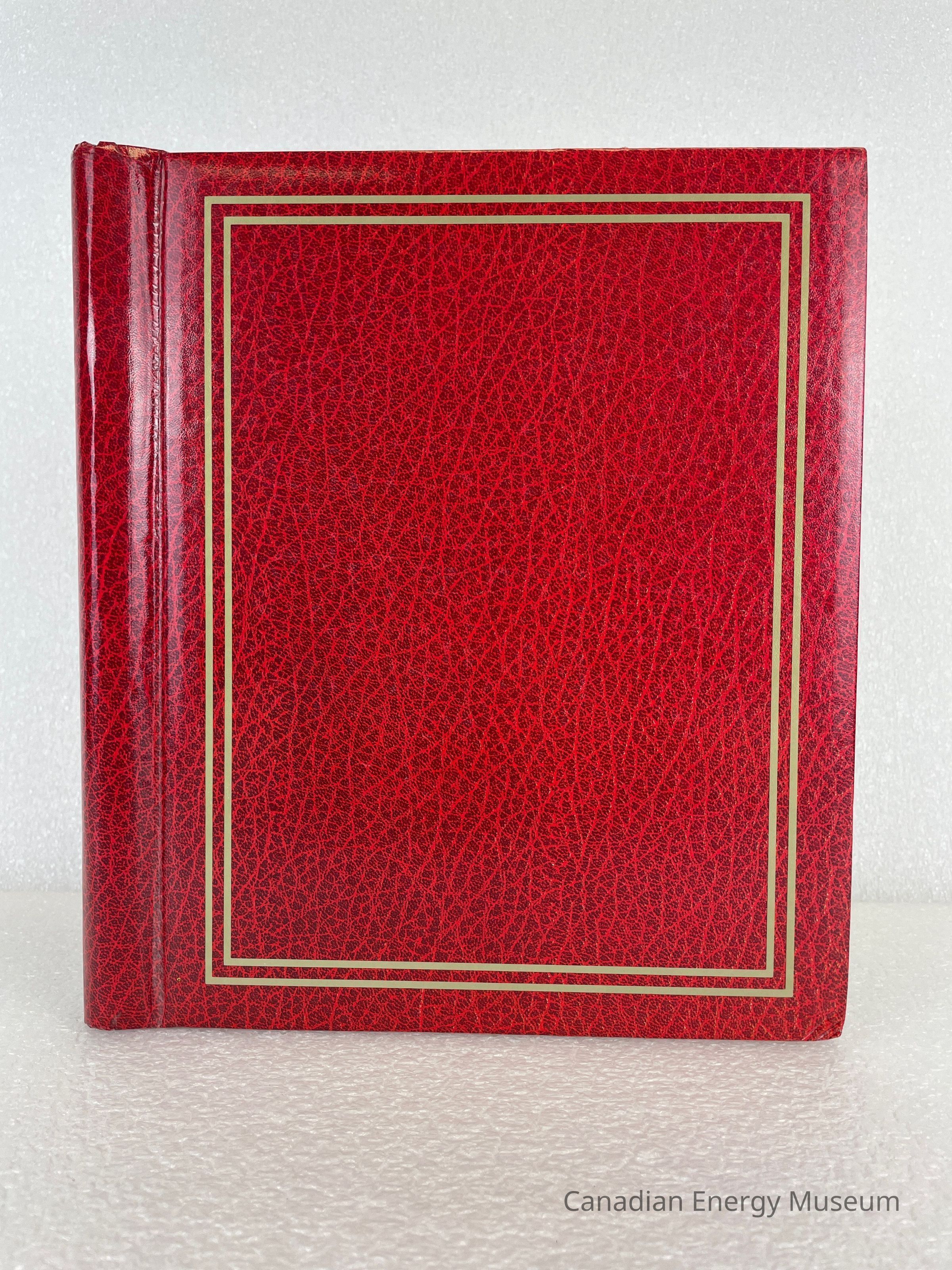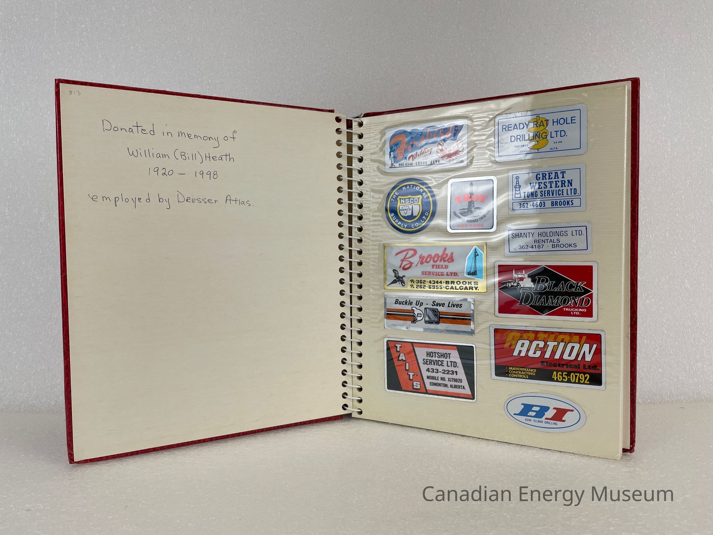 A photo album of assorted stickers. The cover is red with two gold rectangle outlines bordering the front cover.The back cover displays the manufacturer's mark in white. The inside cover displays handwriting in pencil reading, "Donated in memory of William (Bill) Heath 1920-1998", and "employed by Dresser Atlas". Inside are 8 sheets, double-sided with assorted stickers, and held by a white coil.Collection