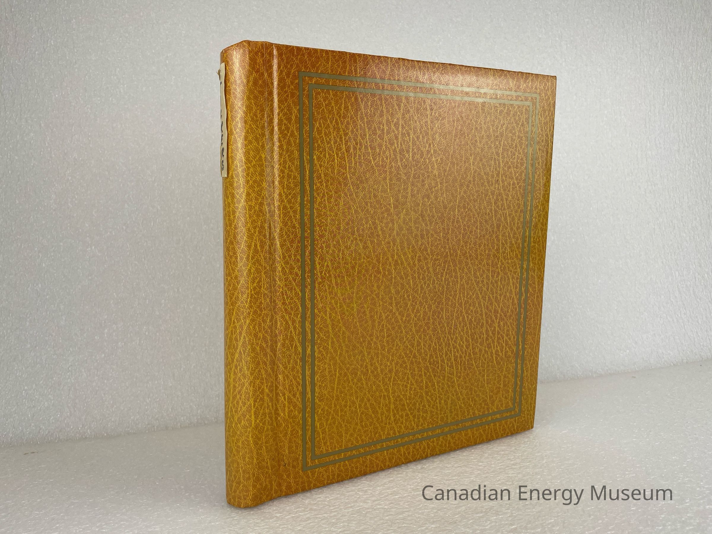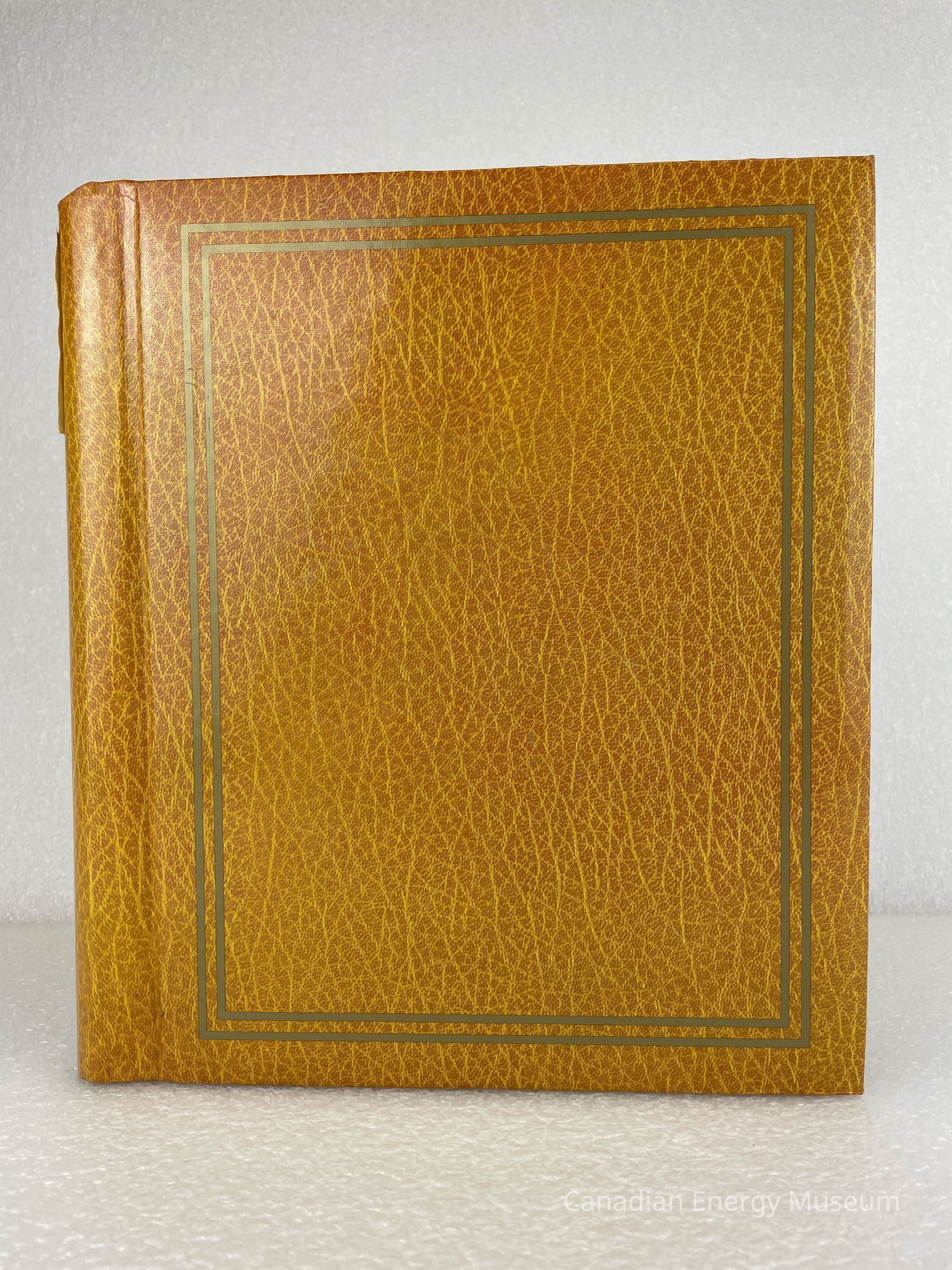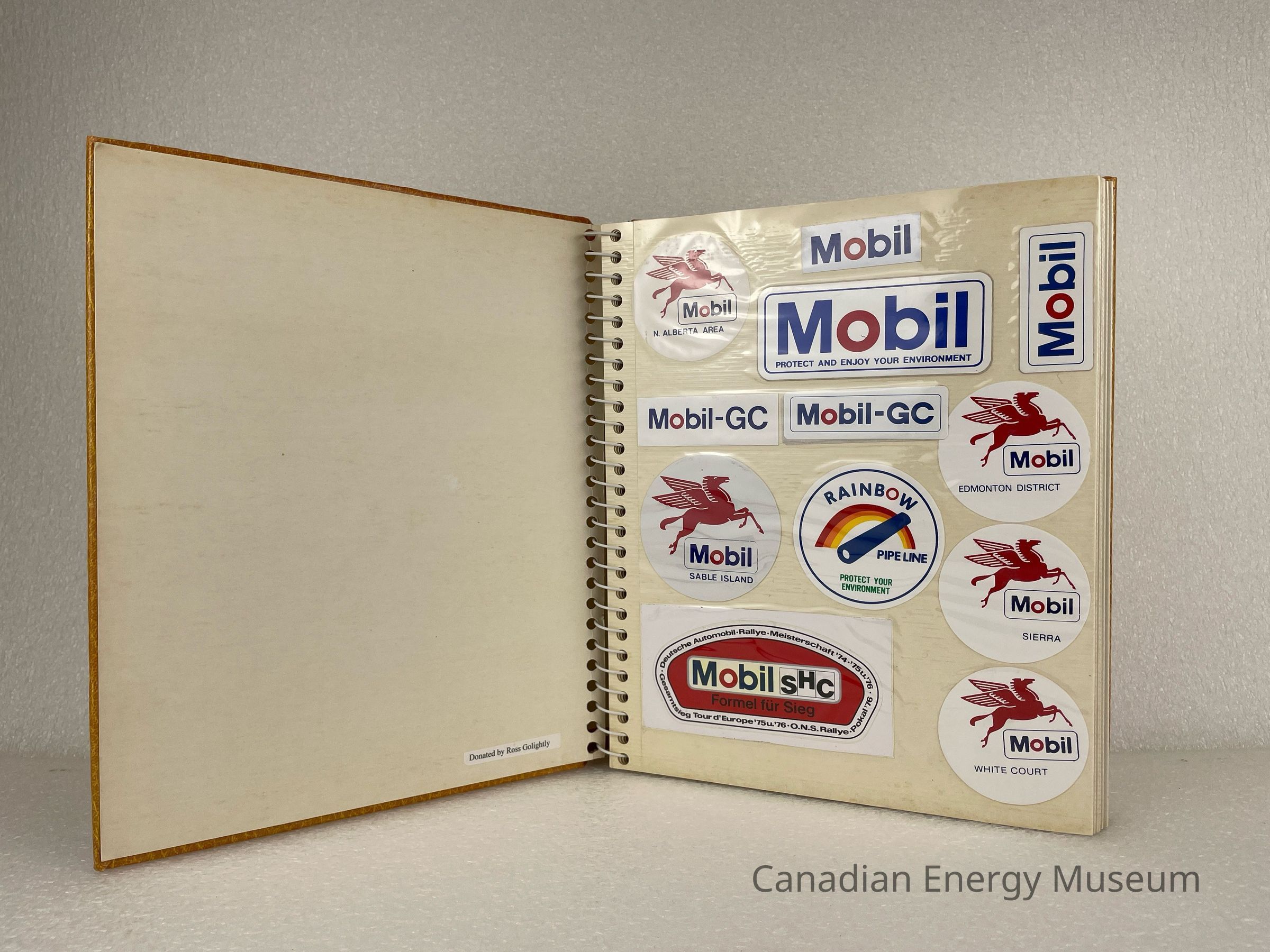 A photo album of assorted stickers. The cover is yellow with a pattern, making it look like fake leather. Two gold outlines of rectangles outline the front cover. A piece of masking tape with text written in Sharpie reading, "STICKERS", is placed at the top of the spine. 13 sheets are held within a white metal coiled binding. The inside cover displays a white label with black text reading, "Donated by Ross Golightly".Collection