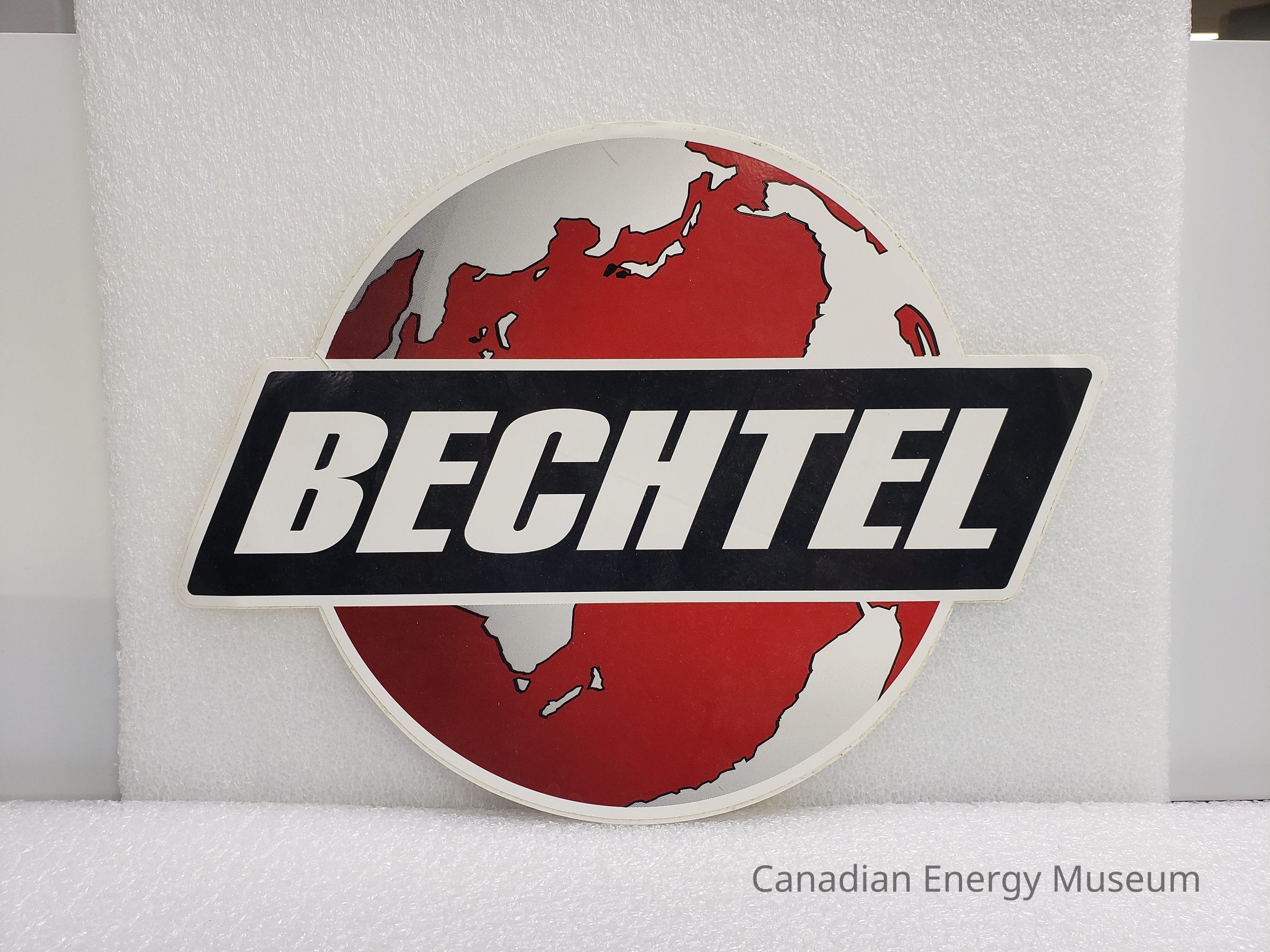A large-sized round (with custom edges) sticker/decal, branded to Bechtel. White backgrounds, with red and black details.Collection