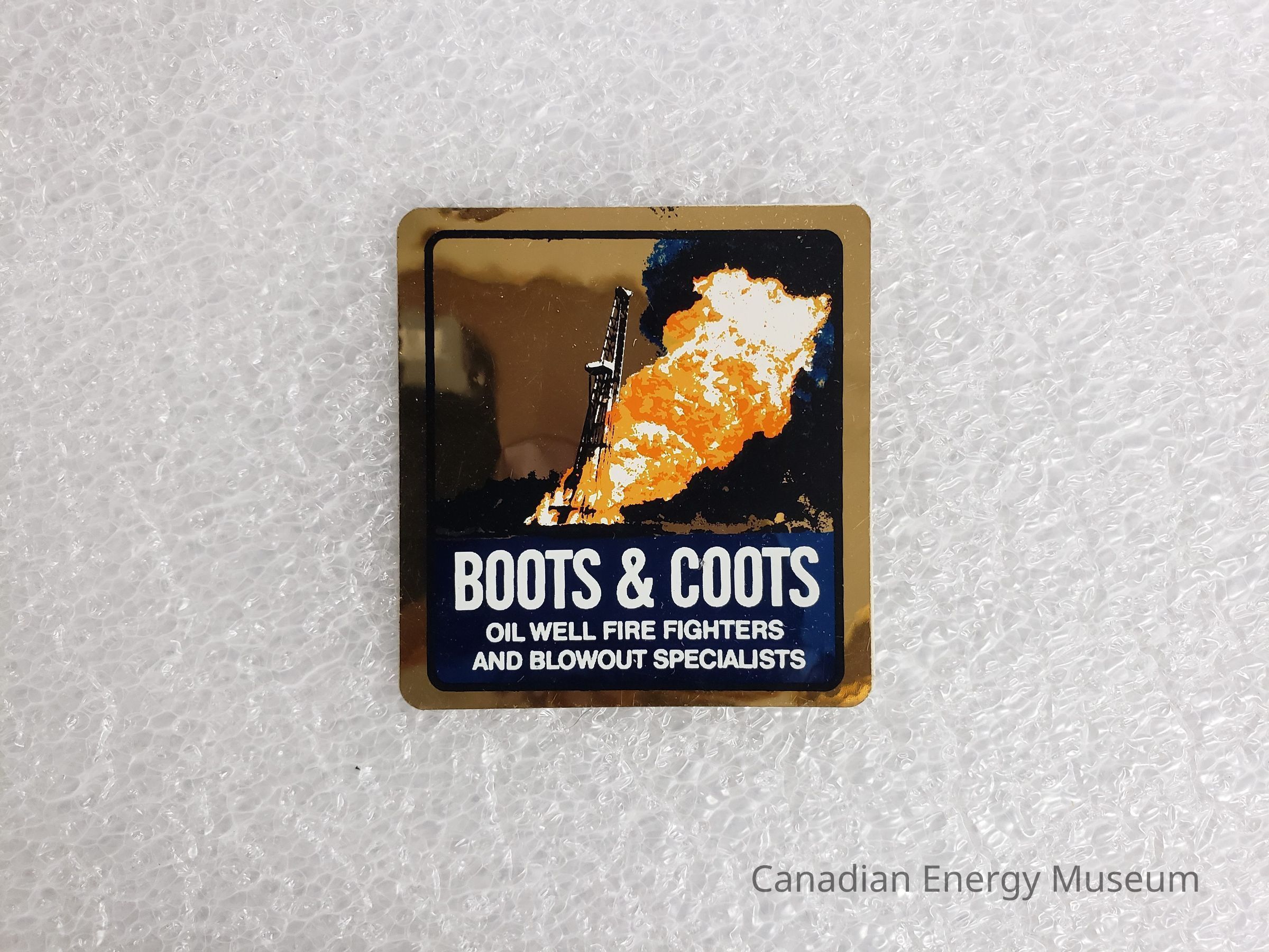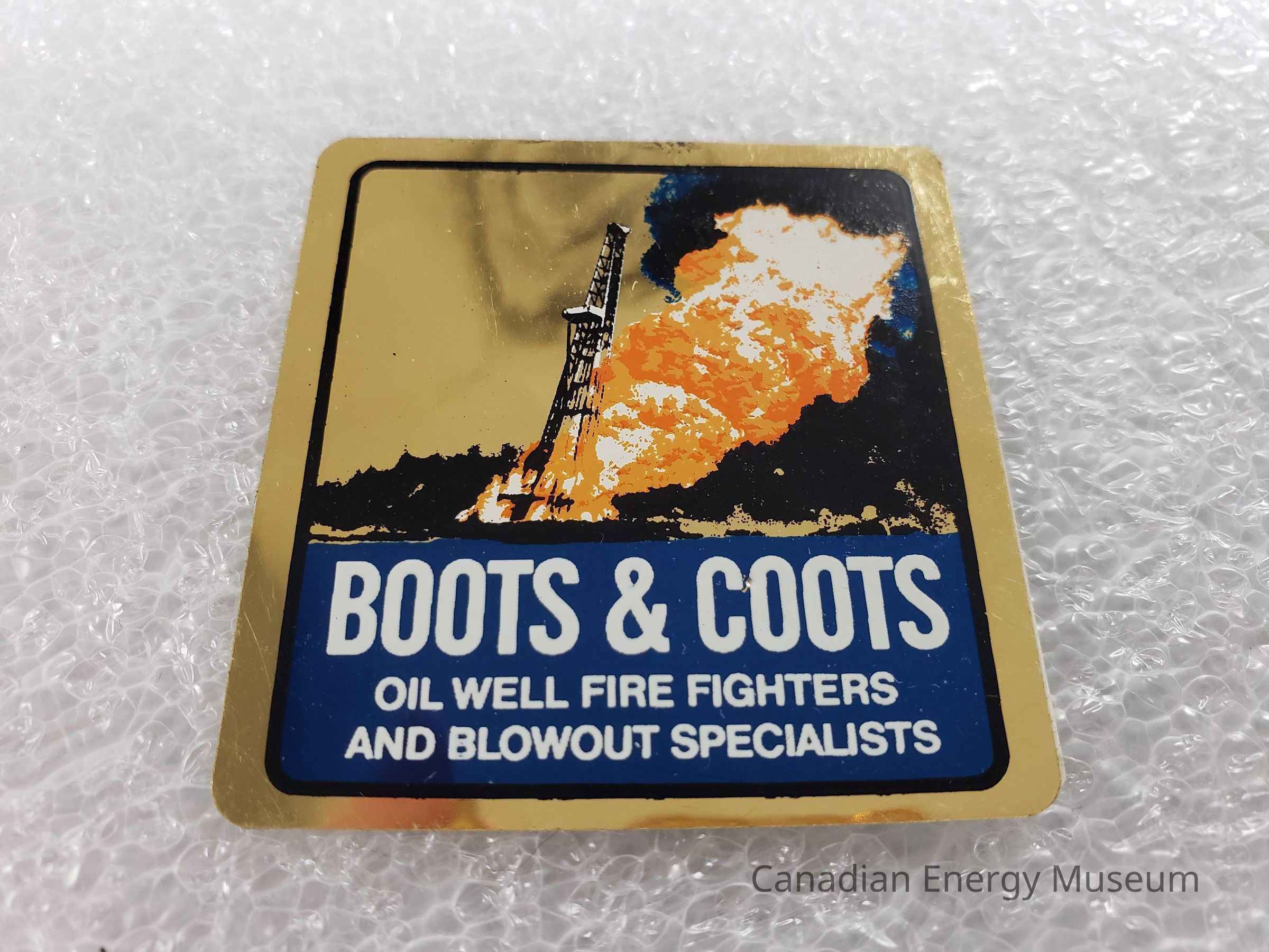 Features: metallic gold base, with black, blue, white, and orange print. Rounded corners. Inner black line border with rounded corners. Illustration of oil well blowout across top to lower-middle. Lower third filled in navy-blue with white text reading: "BOOTS & COOTS; OIL WELL FIRE FIGHTERS AND BLOWOUT SPECIALISTS".Collection