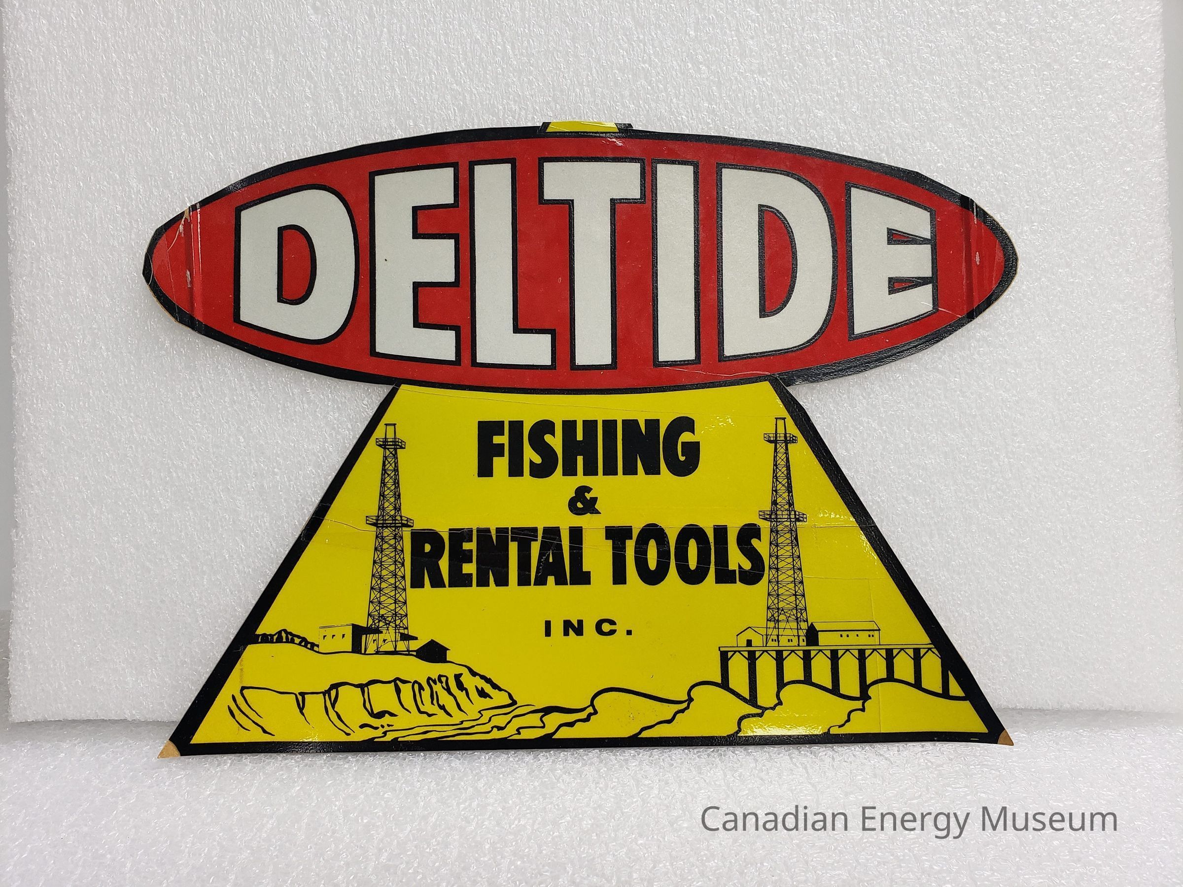 A large-sized custom-shaped (Triangle and Oval) sticker/decal, branded to Deltide Fishing & Rental Tools Inc. Red and yellow backgrounds, with black and white detailing.Collection