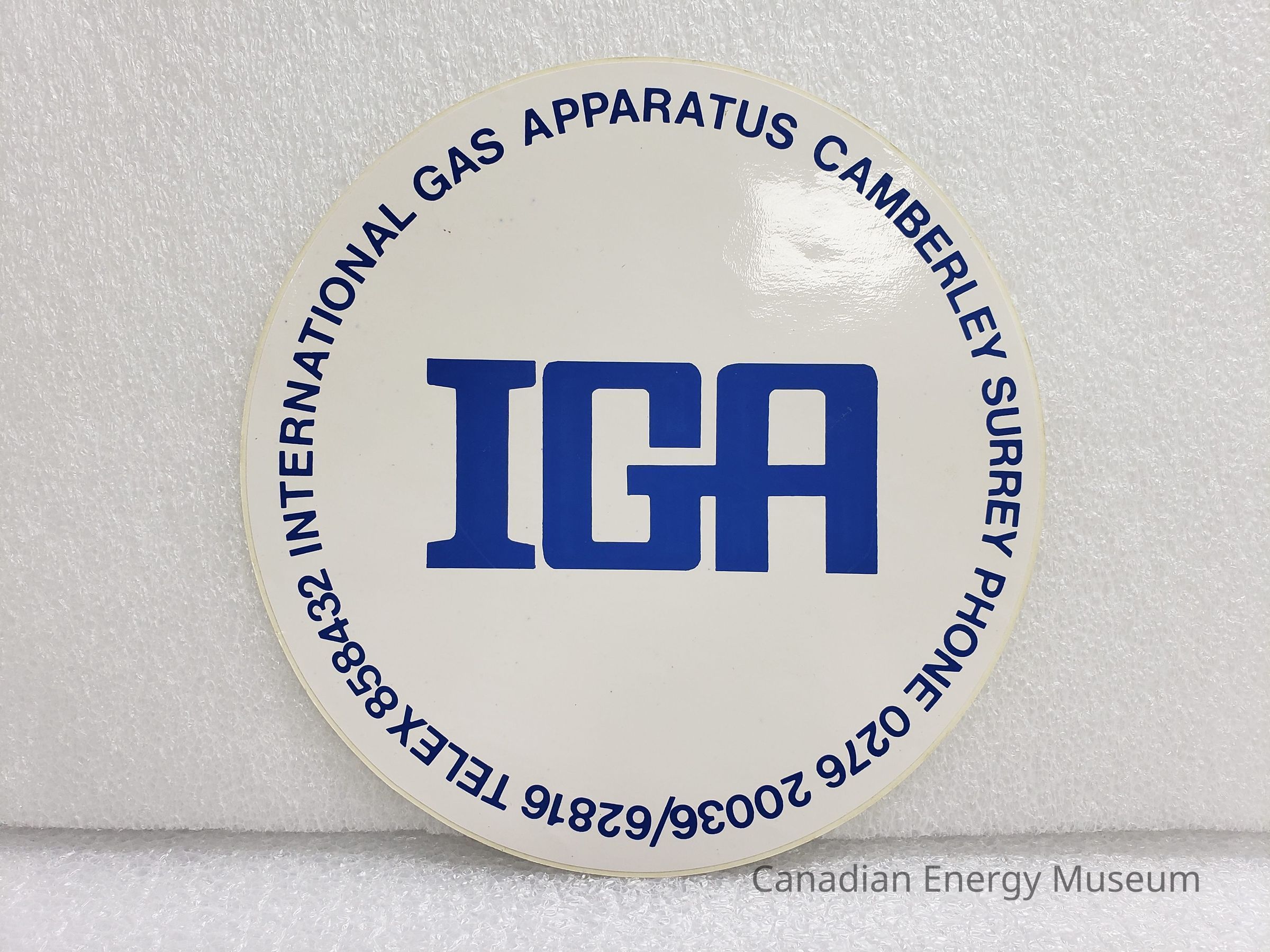 A large-sized round sticker/decal, branded to International Gas Apparatus (IGA), (Camberley Surrey). White background, blue text.Collection