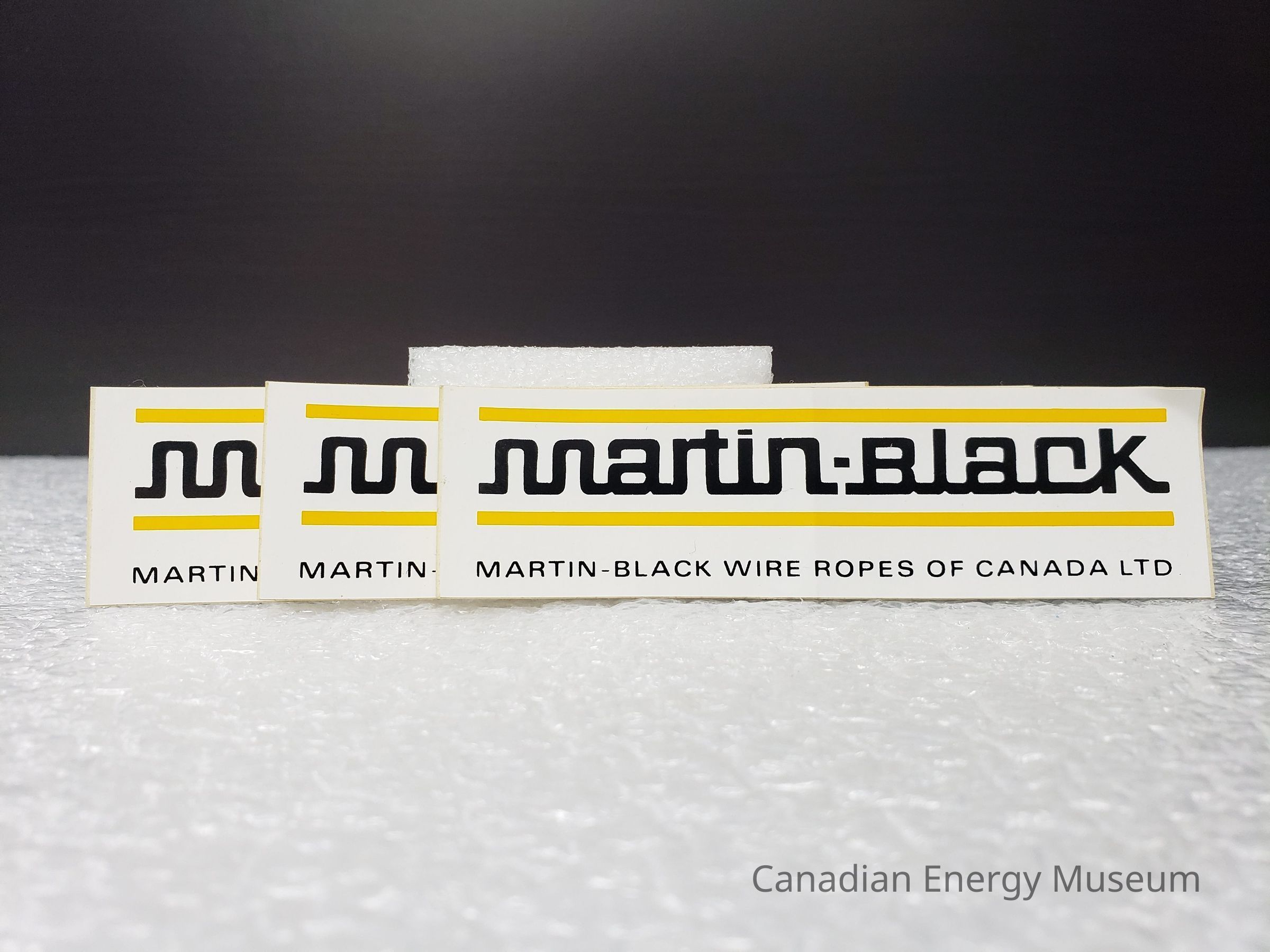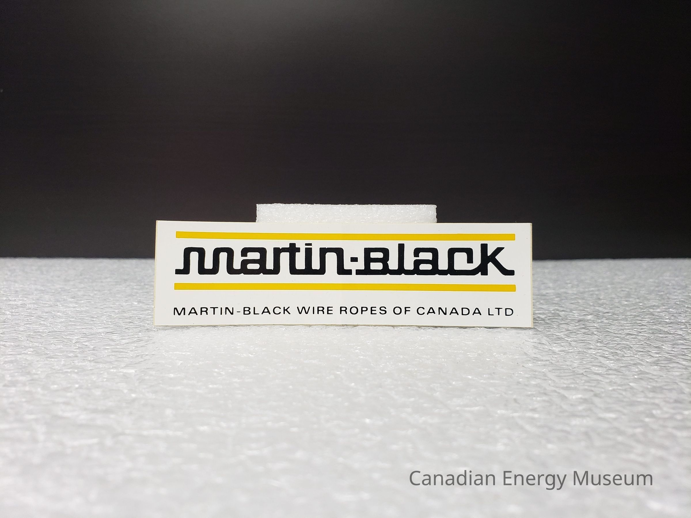 The sticker is an elongated rectangle, with a white base. In the top portion is the black, stylised block text "MARTIN-BLACK" sandwiched between two horizontal yellow lines. Along the bottom is the black text "MARTIN-BLACK WIRE ROPES OF CANADA LTD".Collection