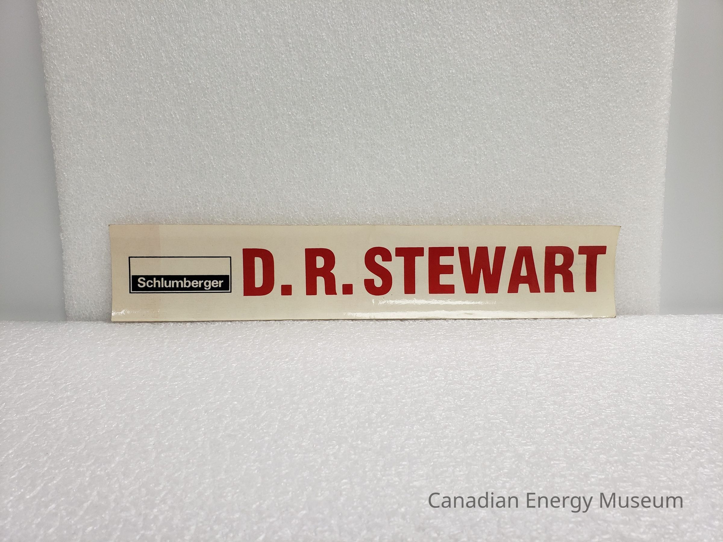 A large-sized rectangular sticker/decal, branded to Schlumberger, with text "D.R. STEWART". White backgrounds, with red text and black logo.Collection