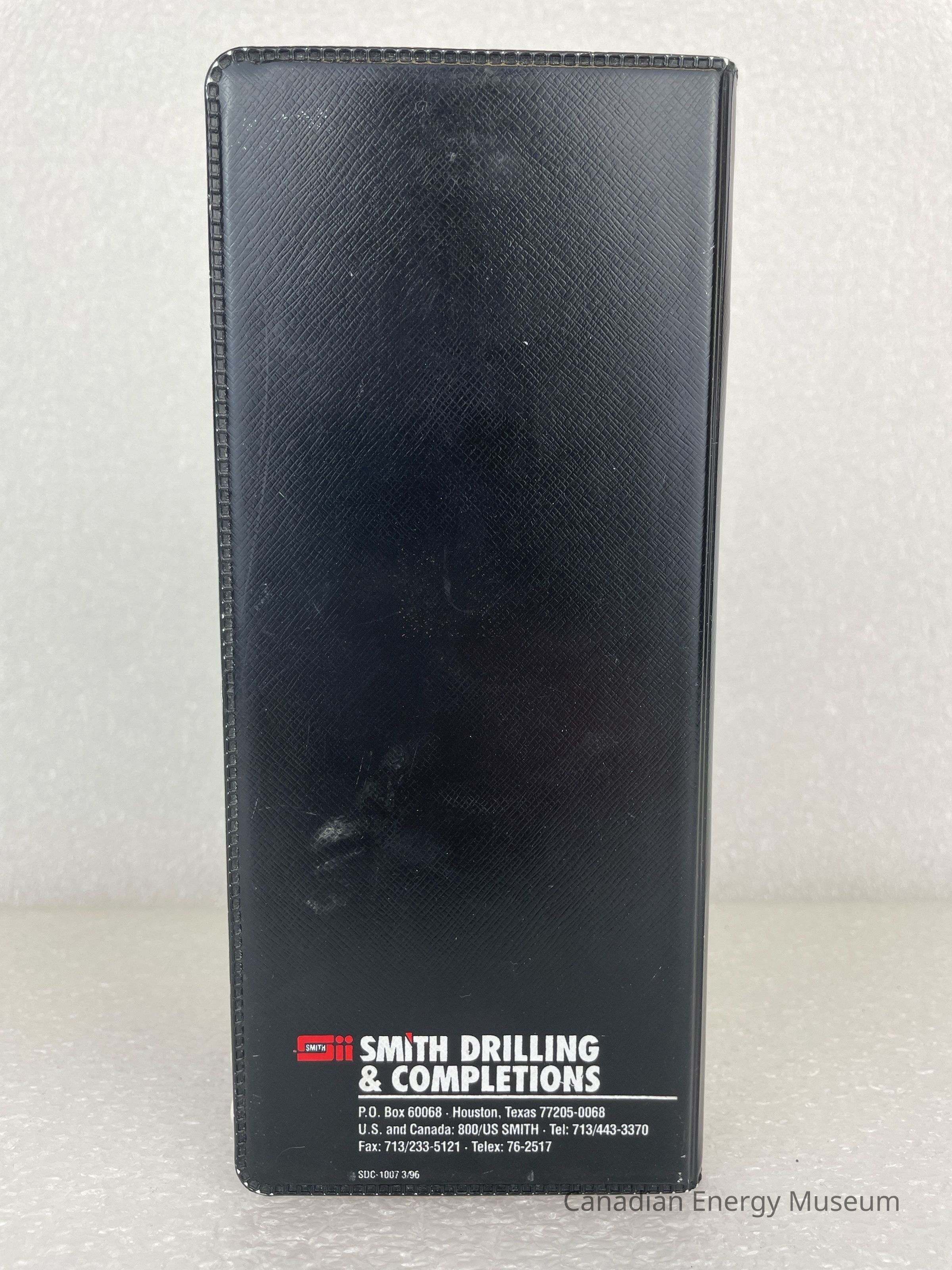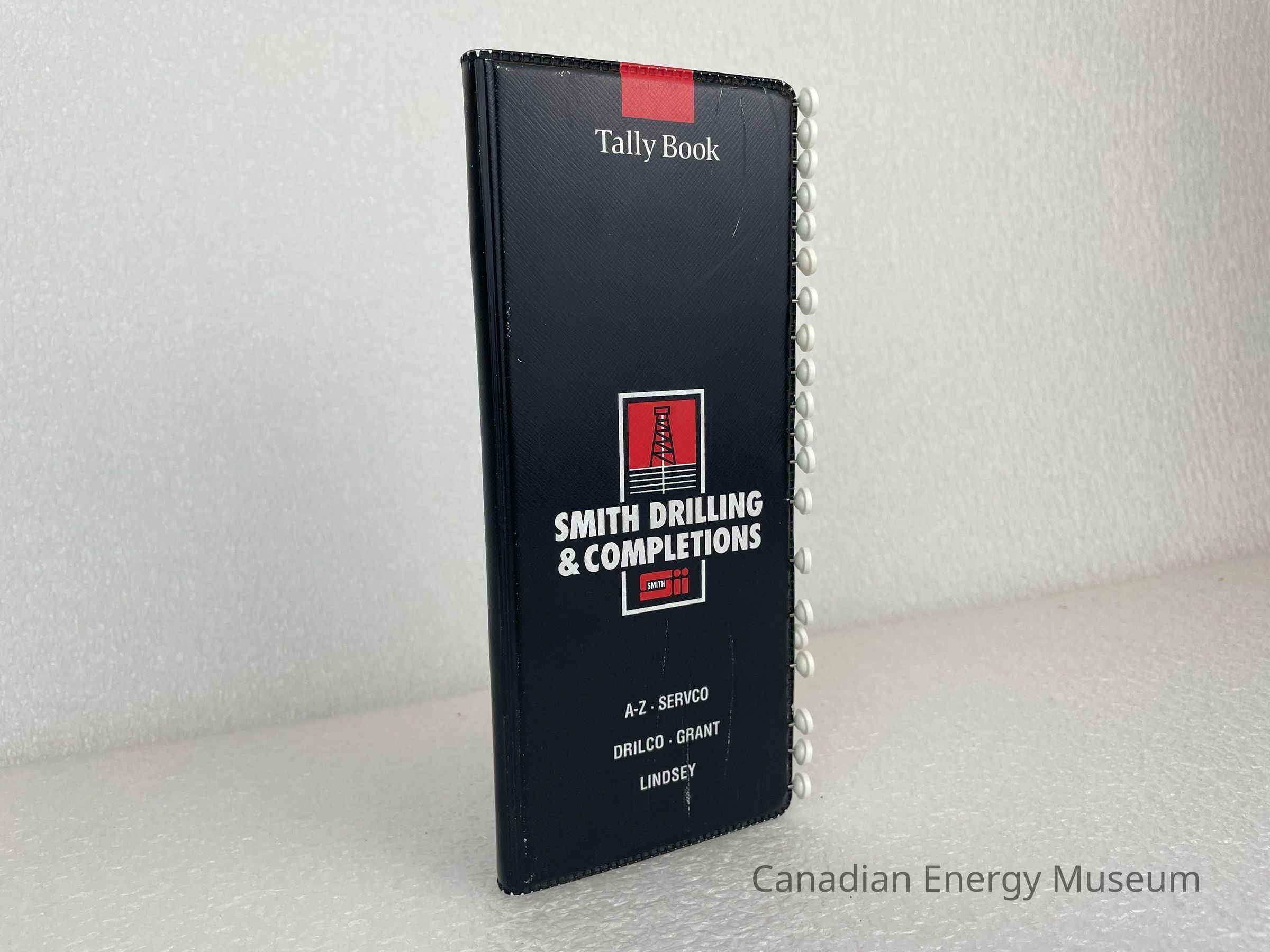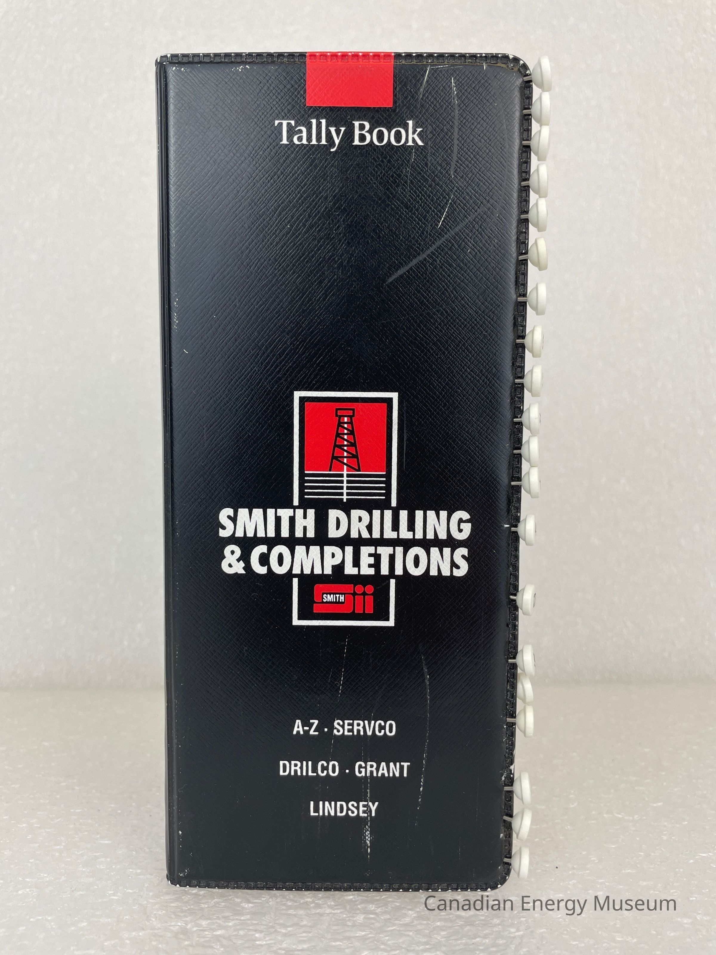 The tally book is long and thin with a black cover and white text. The top of the front cover displays a small red rectangle with white text underneath reading, "Tally Book". The centre features a red and white logo design of an oil derrick with white text reading, "SMITH DRILLING & COMPLETIONS". At the bottom in a smaller font size is text reading, "A-Z SERVCO", "DRILCO . GRANT", and "LINDSEY". The back of the book is plain, with small text at the bottom, with the Smith Drilling & Completions information. The side of the front cover has twenty metal pins with white caps. Each pin has a different number from 3 to 25. The numbers 1-2, 16, and 22 are missing.