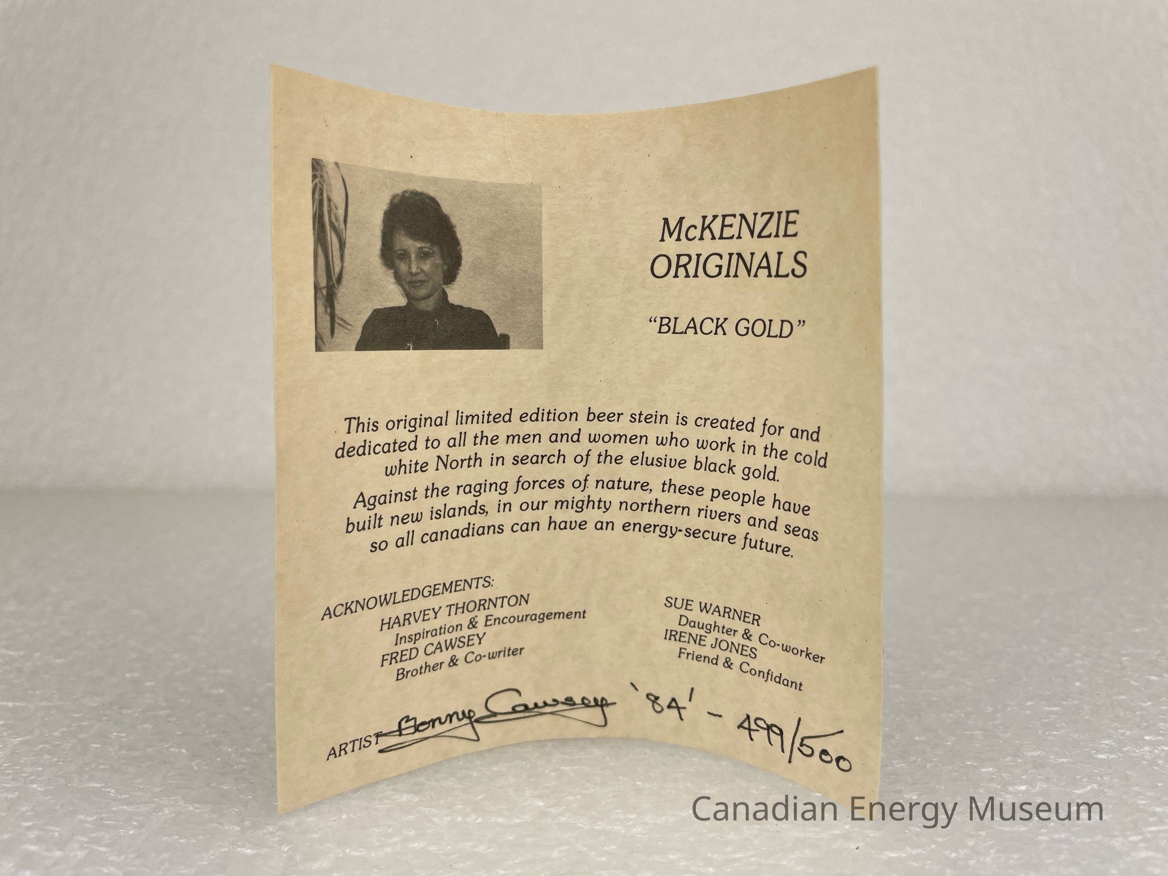 A square, beige cardstock piece of paper rests inside the tankard. The top left of the paper features a greyscale image of a woman with short hair, wearing a dark coloured mockneck shirt. The top left of the paper displays black text reading, "MCKENZIE ORIGINALS "BLACK GOLD". The middle of the paper consists of two paragraphs of black text. The bottom has one signature and text that has been handwritten in black ink, "'84' - 499/500".Collection
